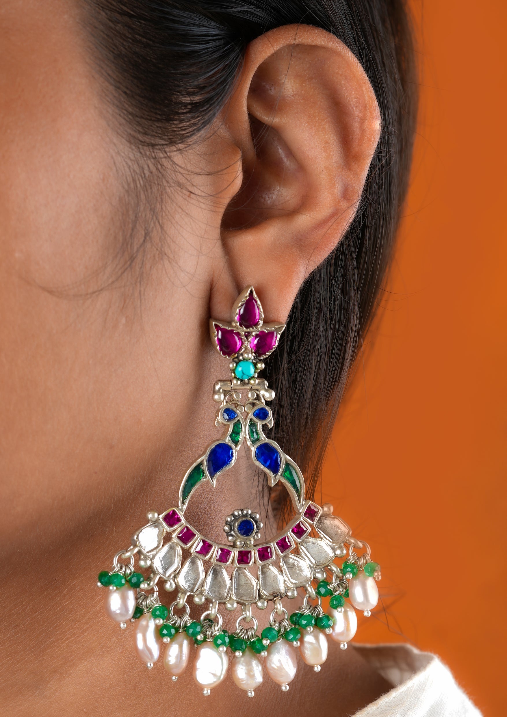 Crafted with exquisite attention to detail, these earrings feature vibrant blue and green gemstones set in an elegant Kundan framework, adorned with radiant pearl-like droplets.