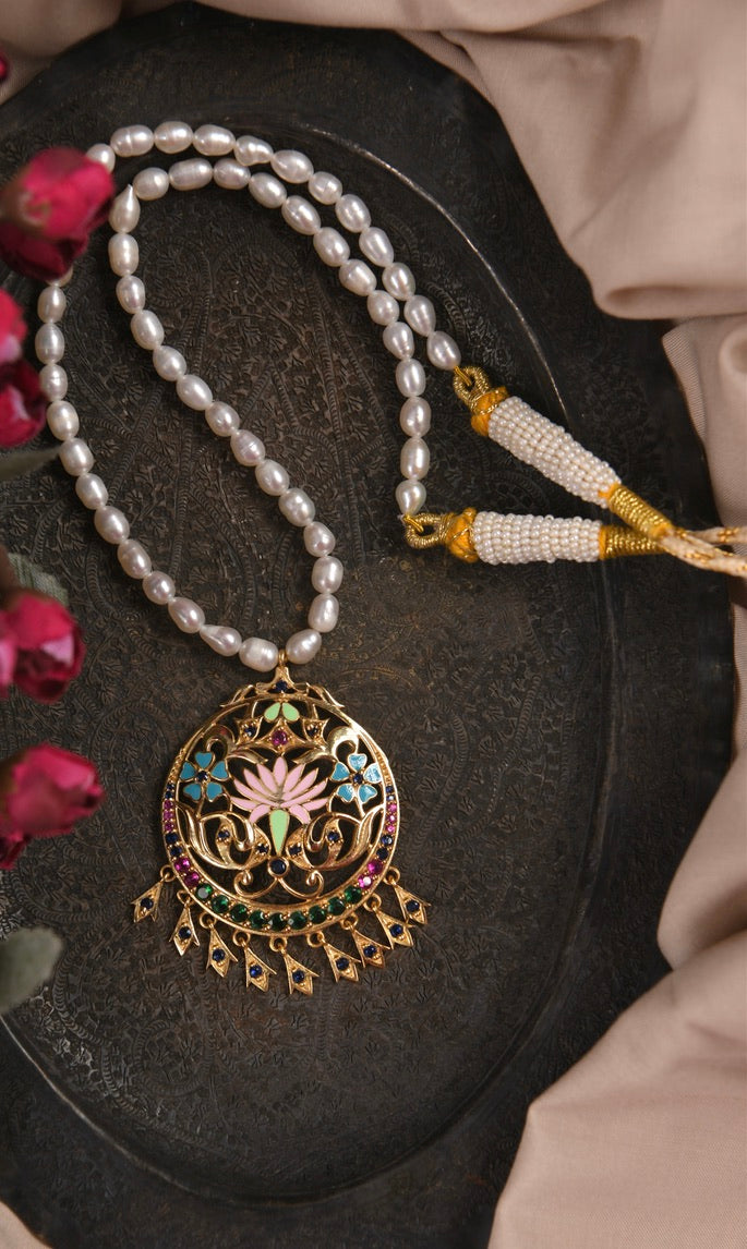 Experience a masterpiece where two timeless Indian traditions unite. This exquisite necklace is a beautiful synthesis of classic elegance, pairing a lustrous chain of delicate **Freshwater Rice Pearls** with a grand, traditional **gold-plated pendant** adorned with vibrant Meenakari (enamel) work and synthetic stones.