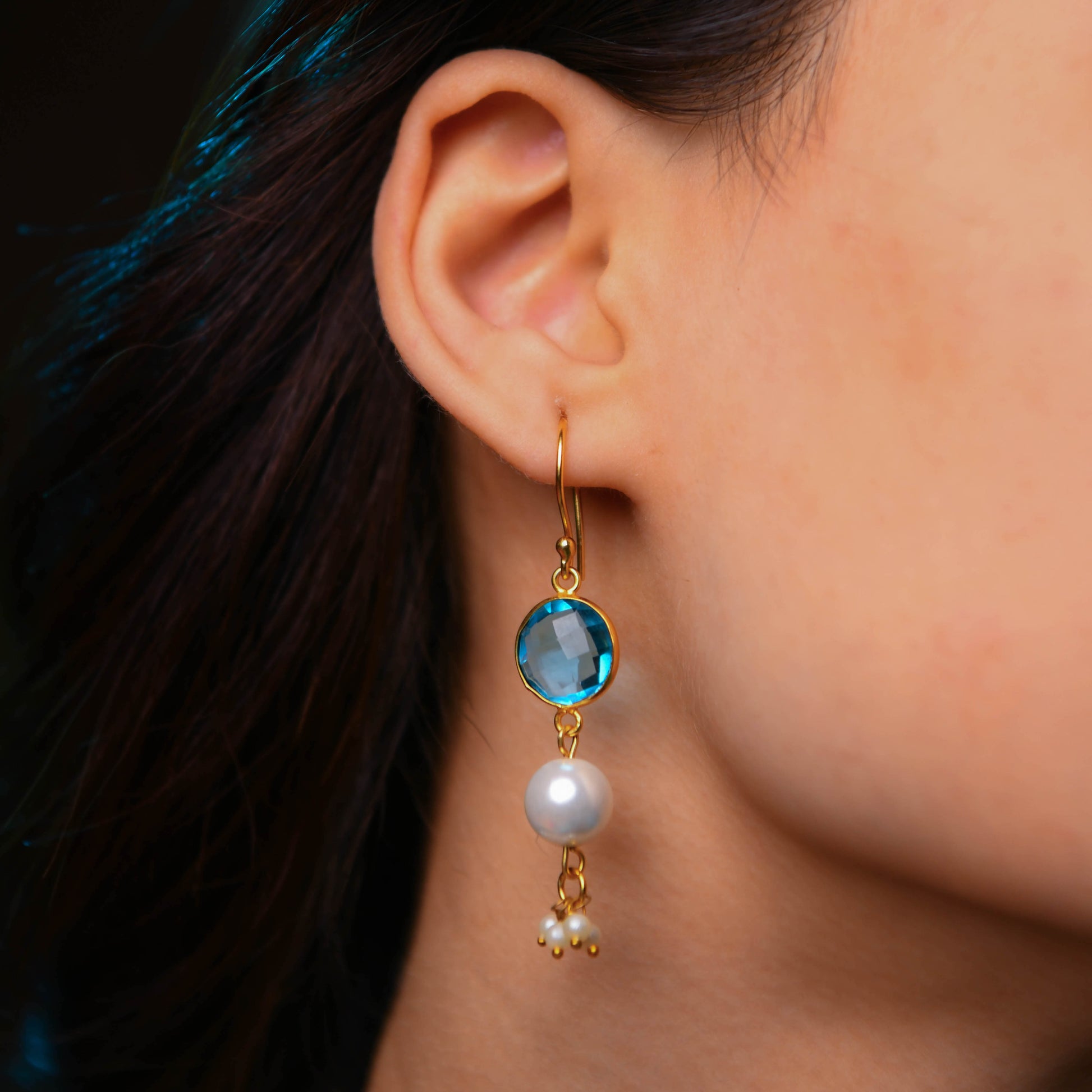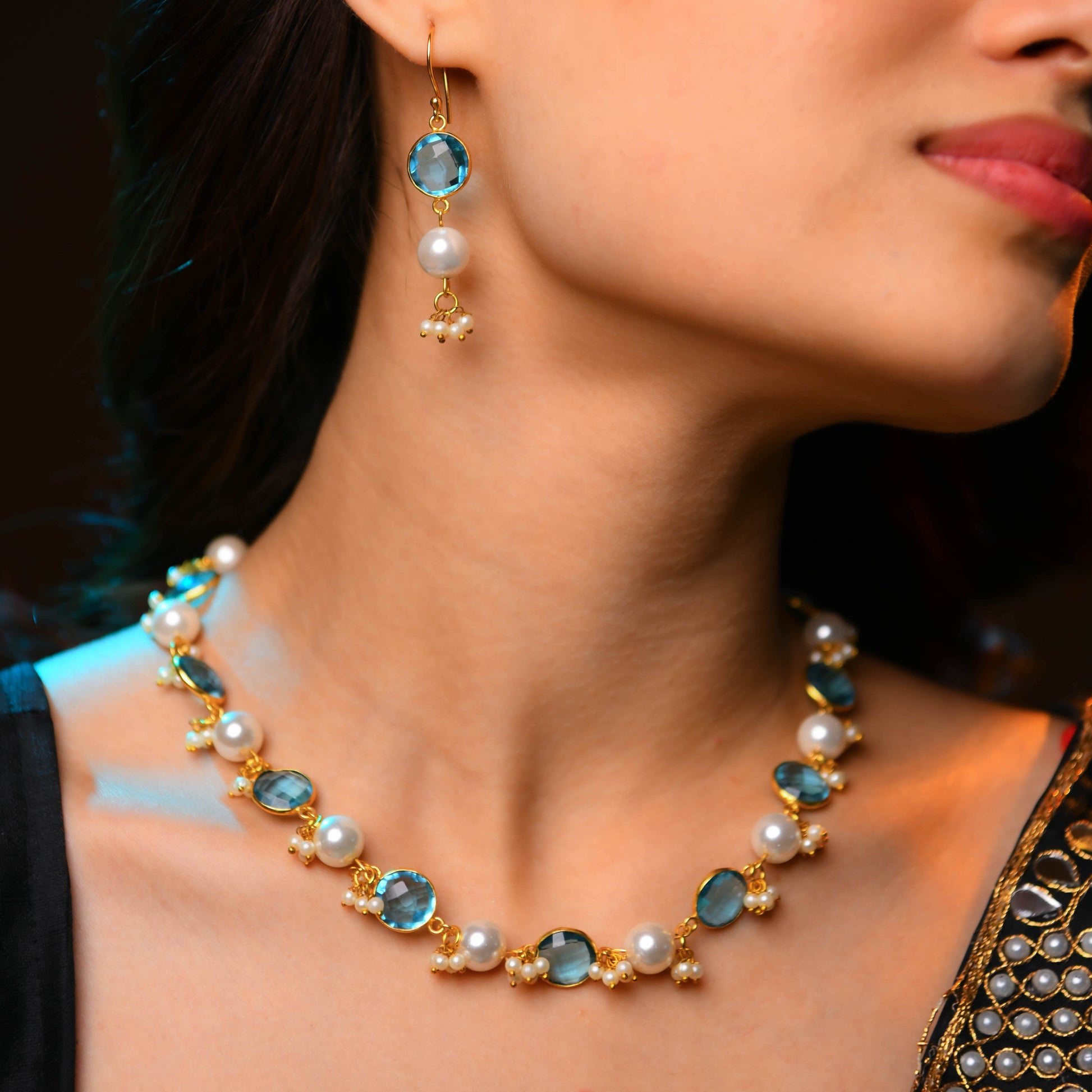 Swarovski pearls, Blue Topaz stones and gold plated brass
