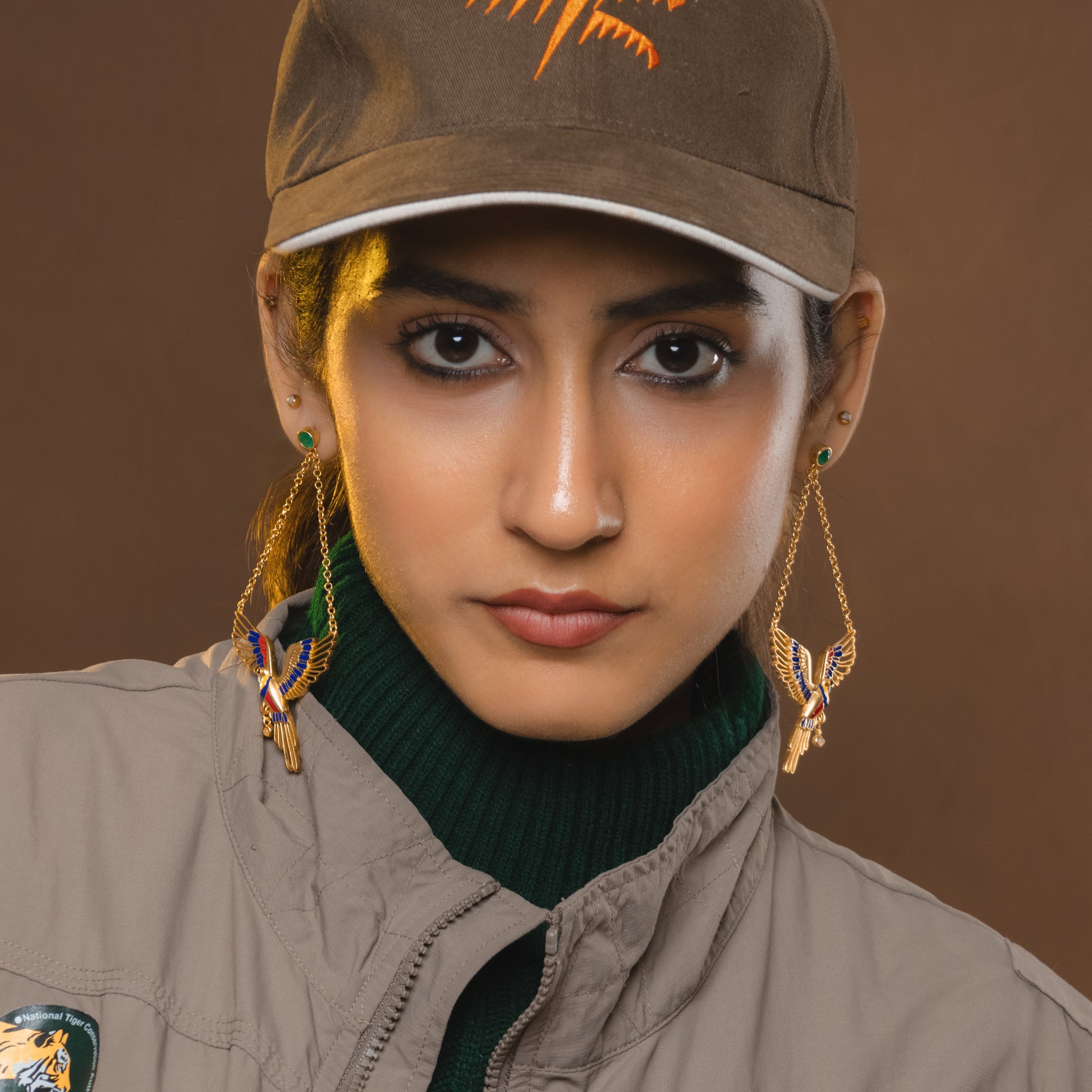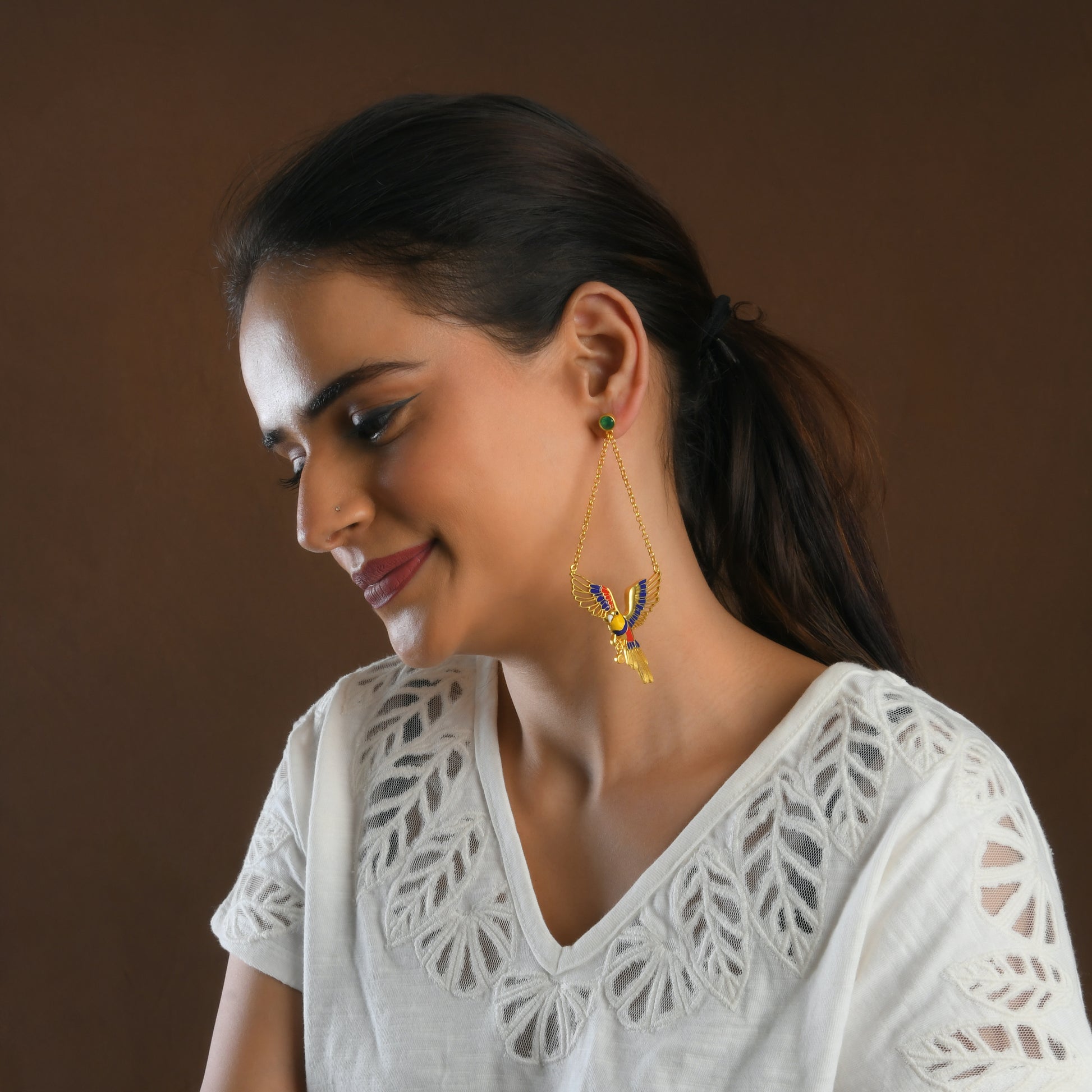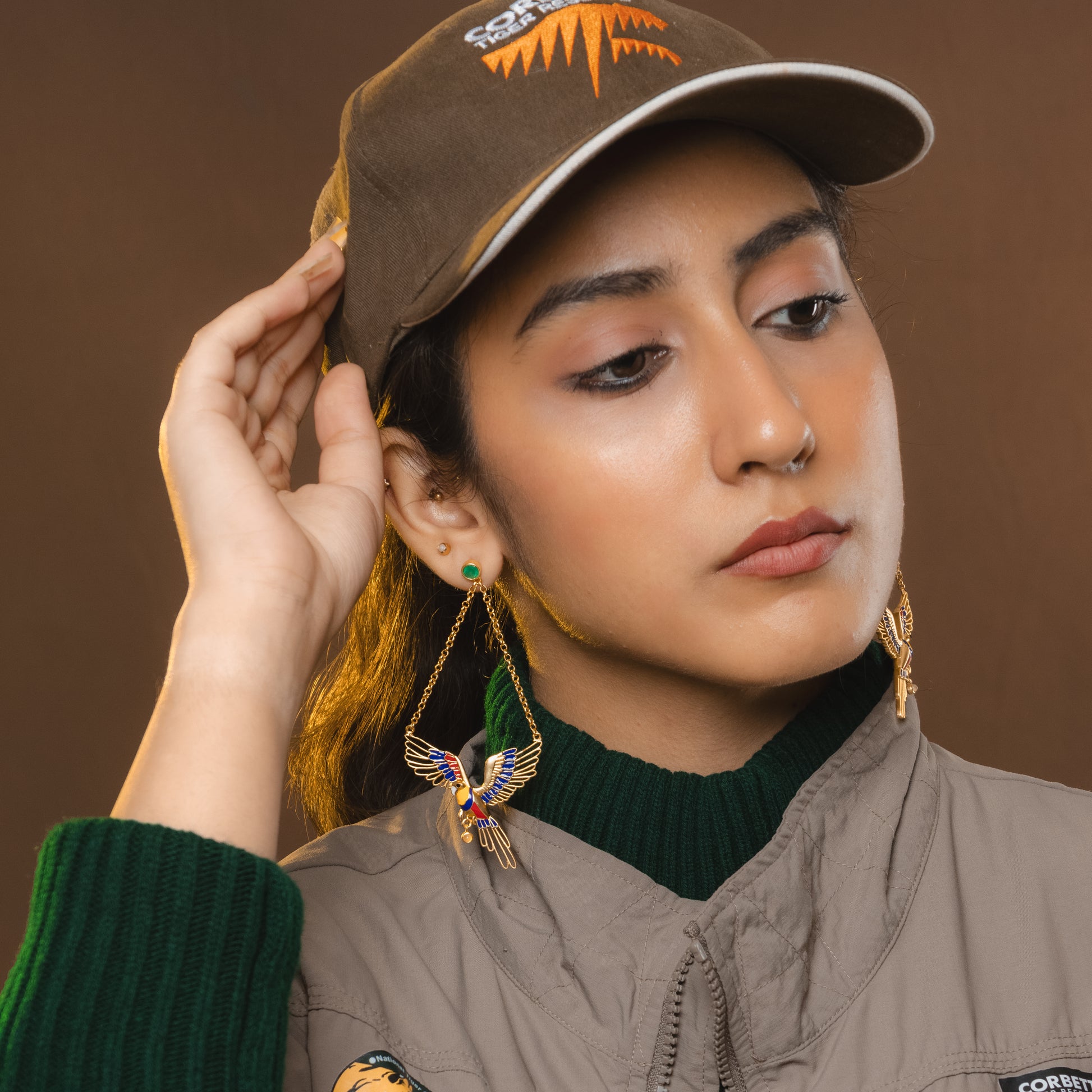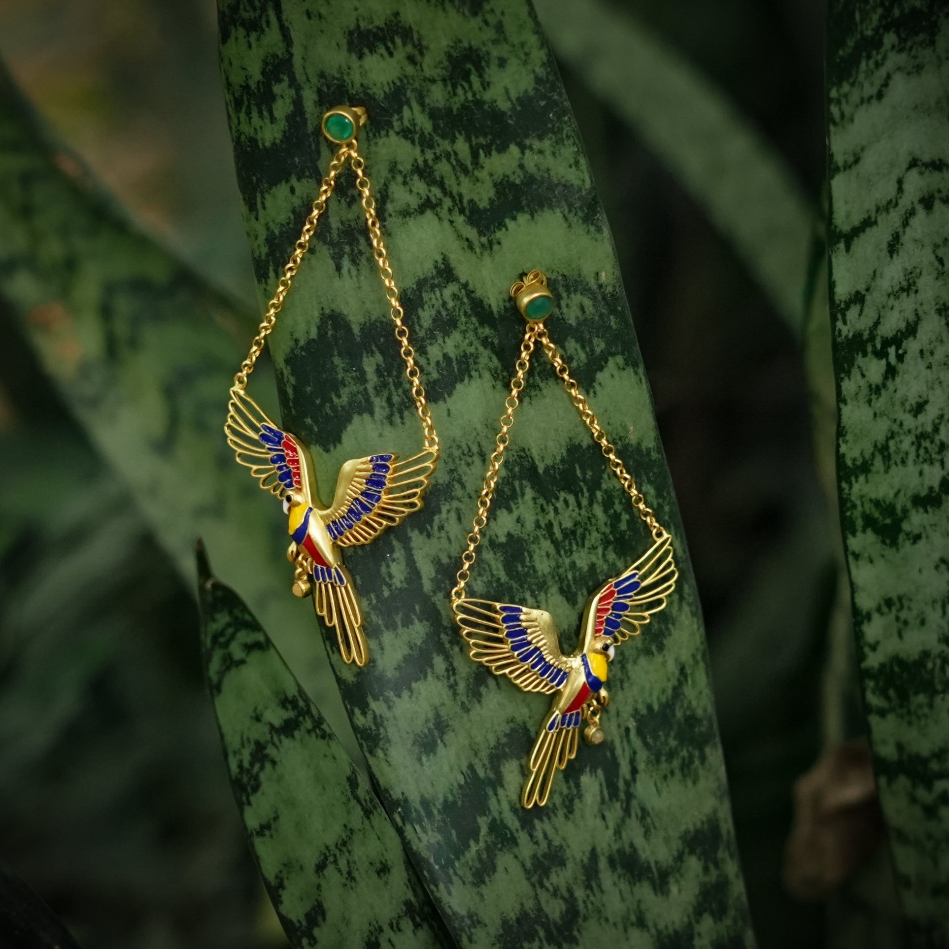 Each earring features a beautifully sculpted parrot in mid-flight, wings unfurled in rich enamel tones. The elongated silhouette and articulated tail feathers create graceful movement with every step, echoing the swoop and glide of a bird weaving through Corbett’s trees.