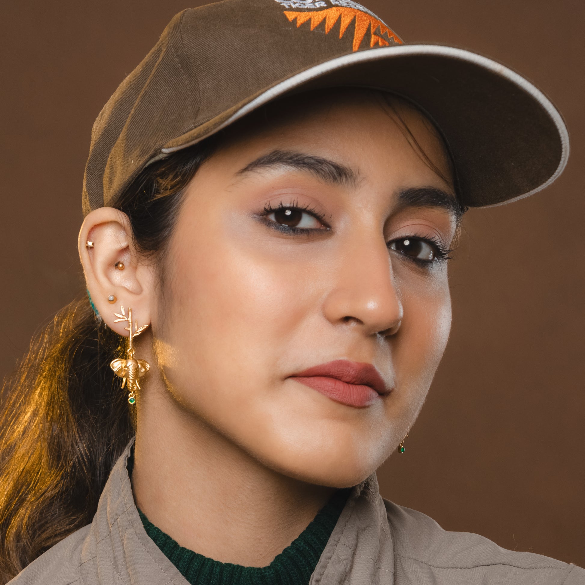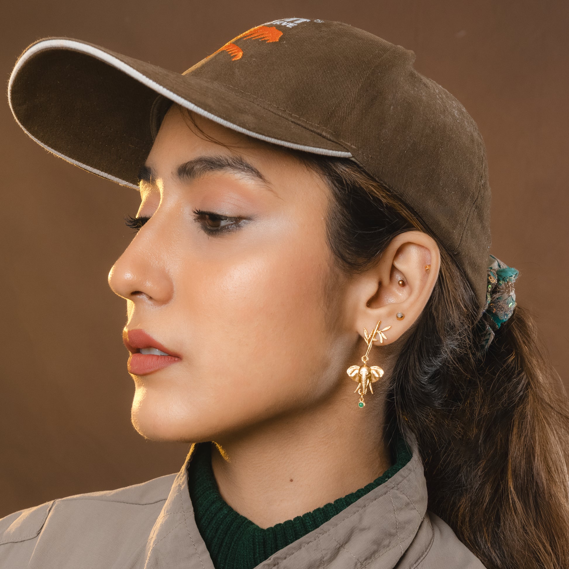 Each earring features a finely sculpted elephant head with gentle, forward-reaching tusks, suspended from a delicate spray of leaves and finished with a single green stone that recalls the lush Dhikala plains. These earrings celebrate strength, independence and ancient memory. They sit beautifully along the jawline and can be worn alone or teamed with the matching necklace for a complete Corbett Tusker story.