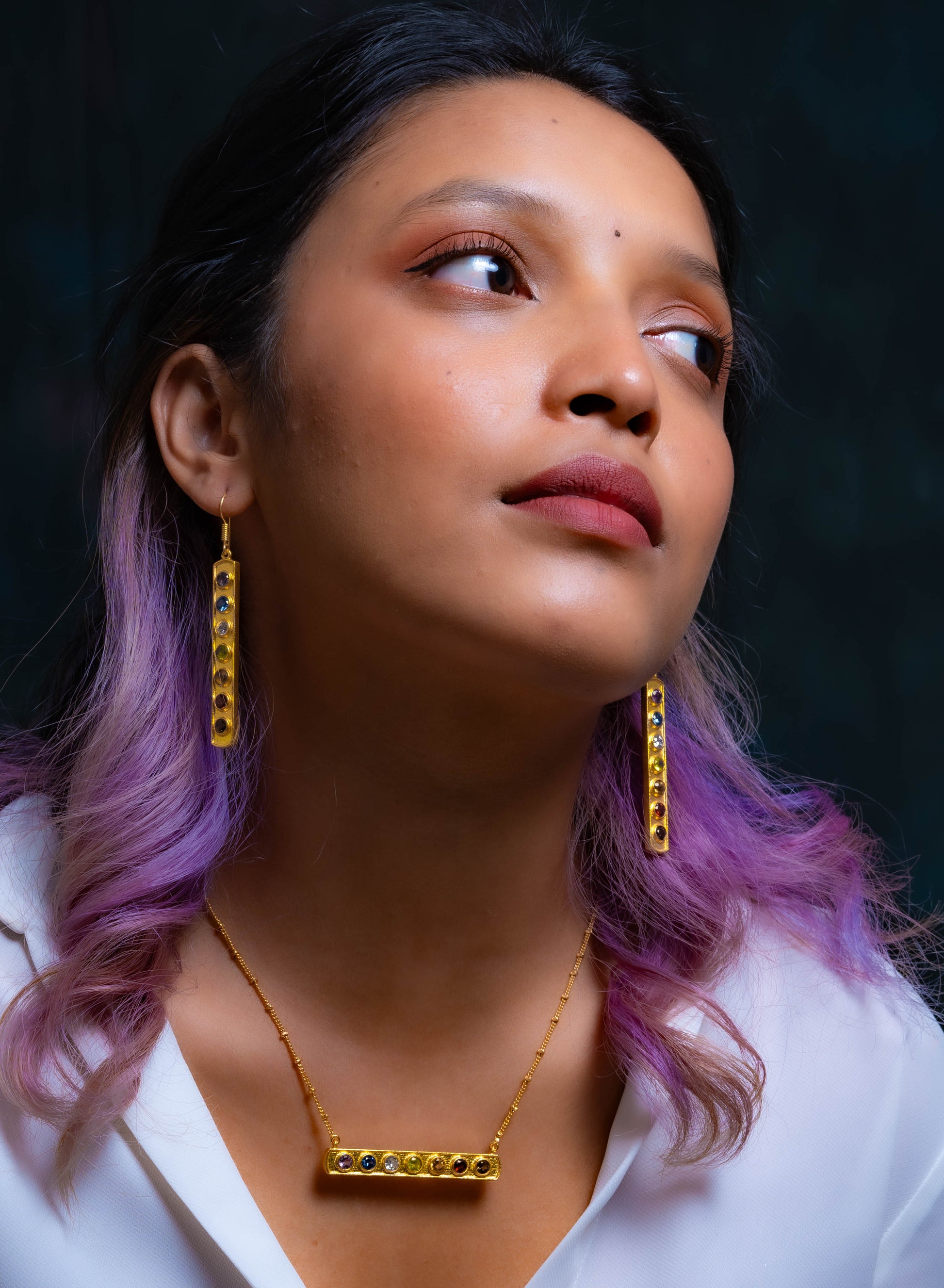 22kt Gold-plated Brass; Semi-precious stones (Smoky Quartz, Red Onyx, Citrine, Peridot, Zircon, Sapphire, Amethyst)