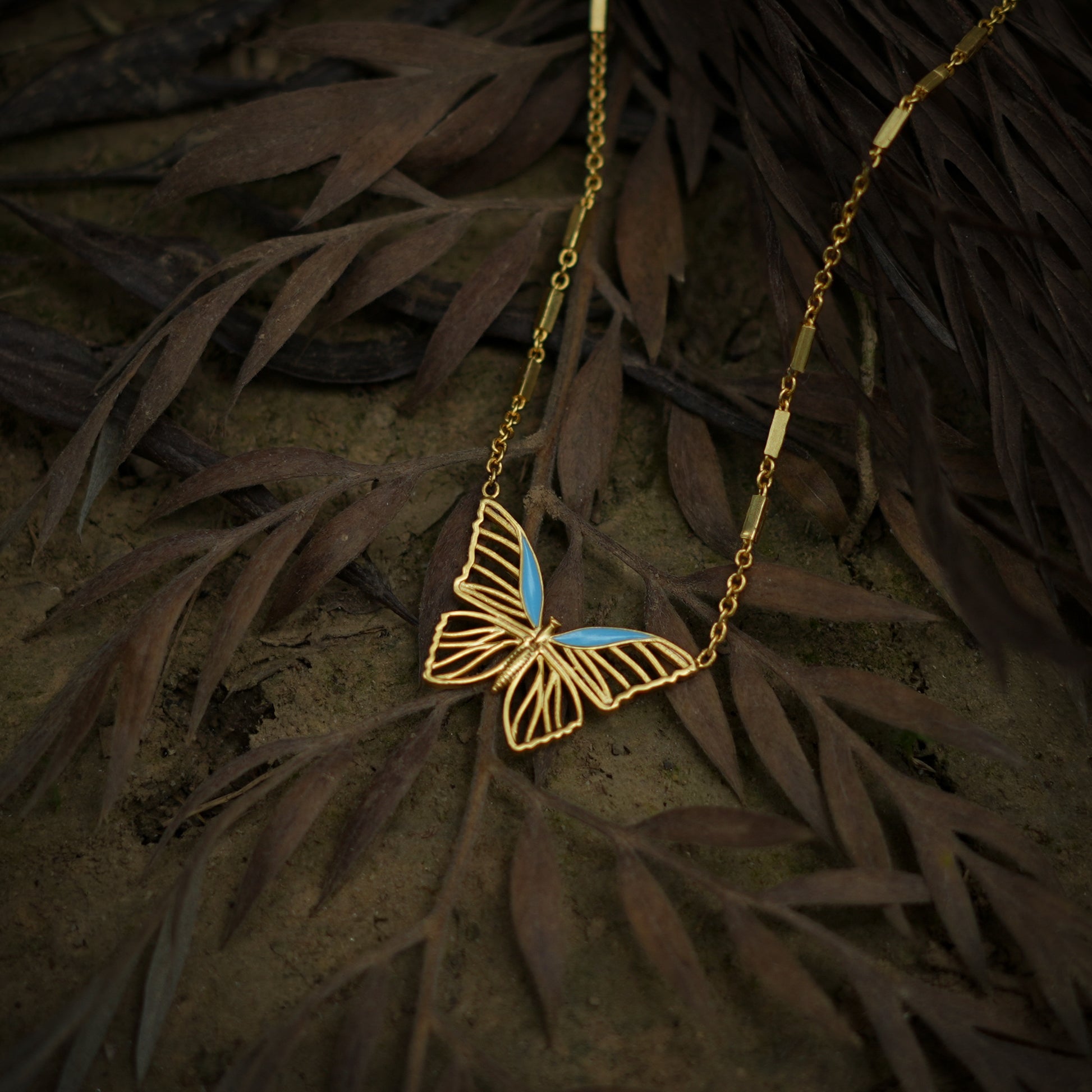 The openwork wings of this pendant capture that lightness perfectly, while the soft blue enamel at the centre recalls clear Corbett skies and the cool flow of the Ramganga. As in nature, where each butterfly passes through metamorphosis, this piece becomes a quiet emblem of change, renewal and personal growth.