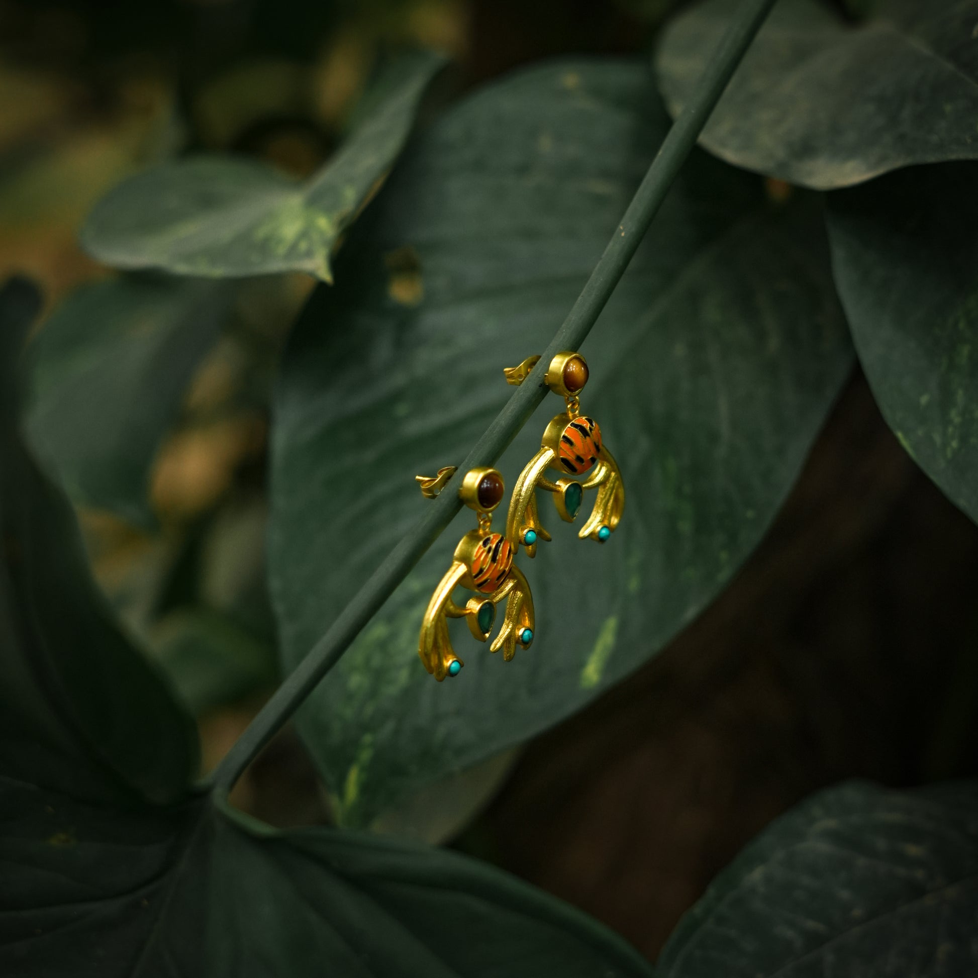 At the heart of each earring sits the tiger-striped enamel in warm oranges and blacks, echoing the presence of the big cat that keeps the food chain in balance. Surrounding it, smooth arcs of gold-plated brass form branch-like curves that suggest antlers, vines or roots, holding the system together. Drops of turquoise and green stones at the base call to mind the Ramganga’s blue-green waters and the dense foliage that drinks from it.