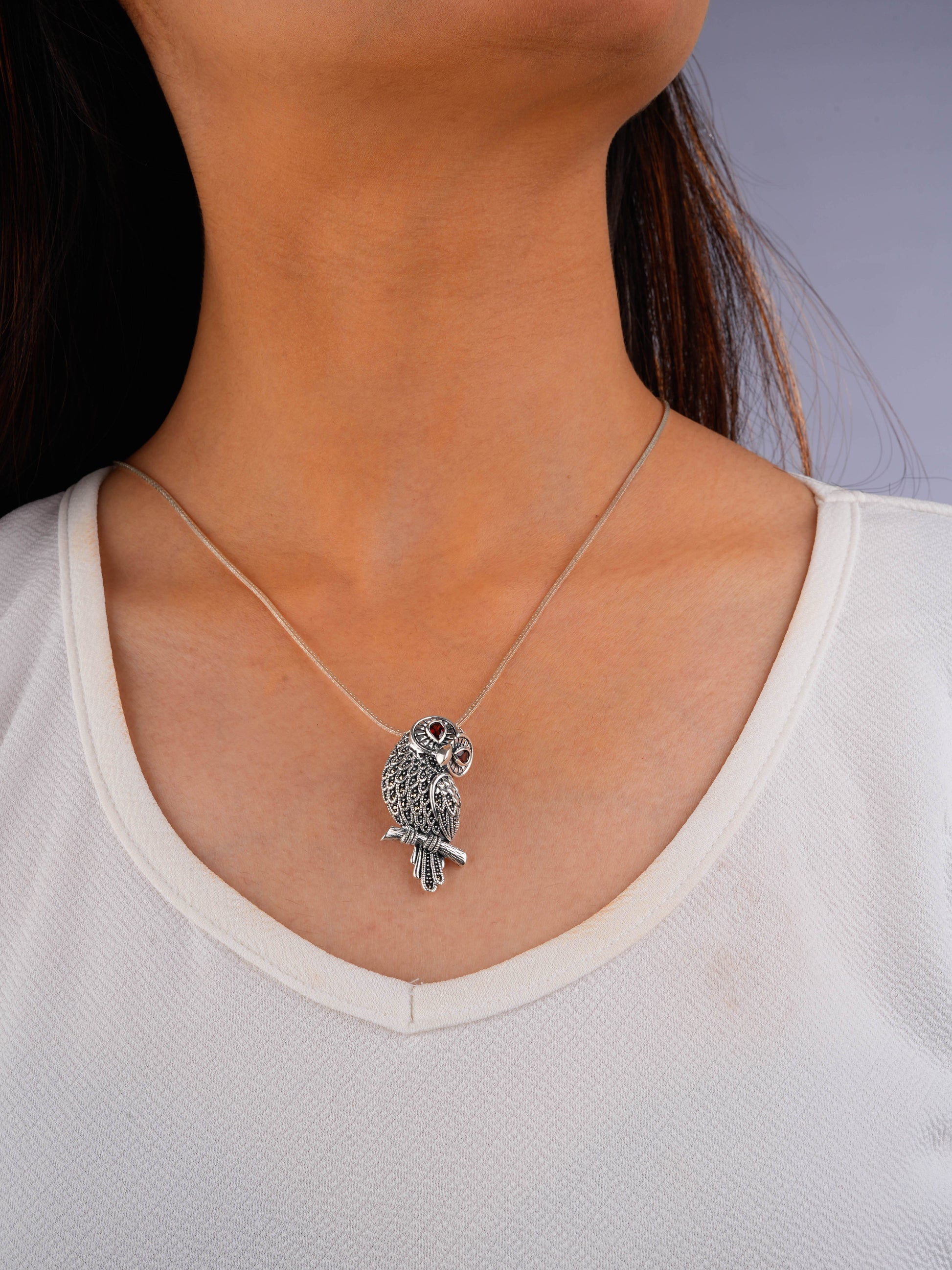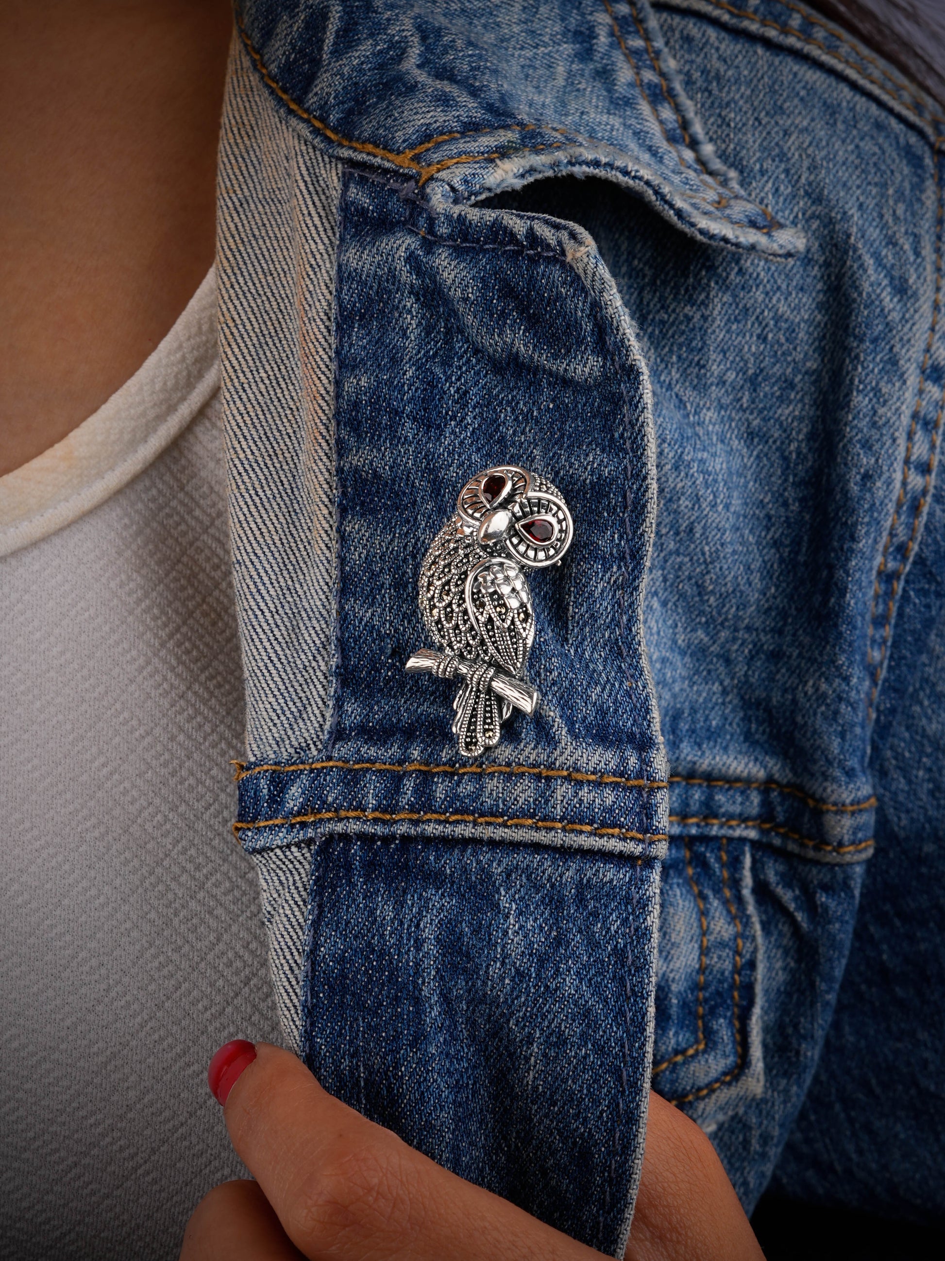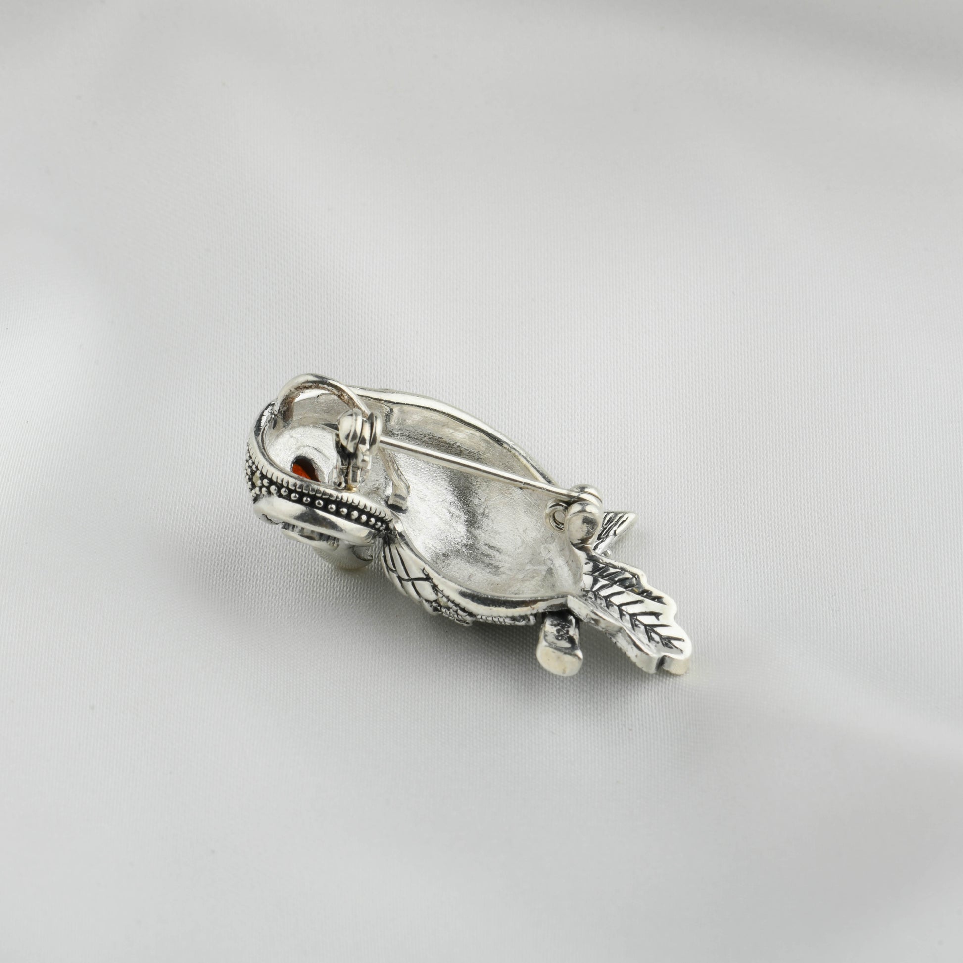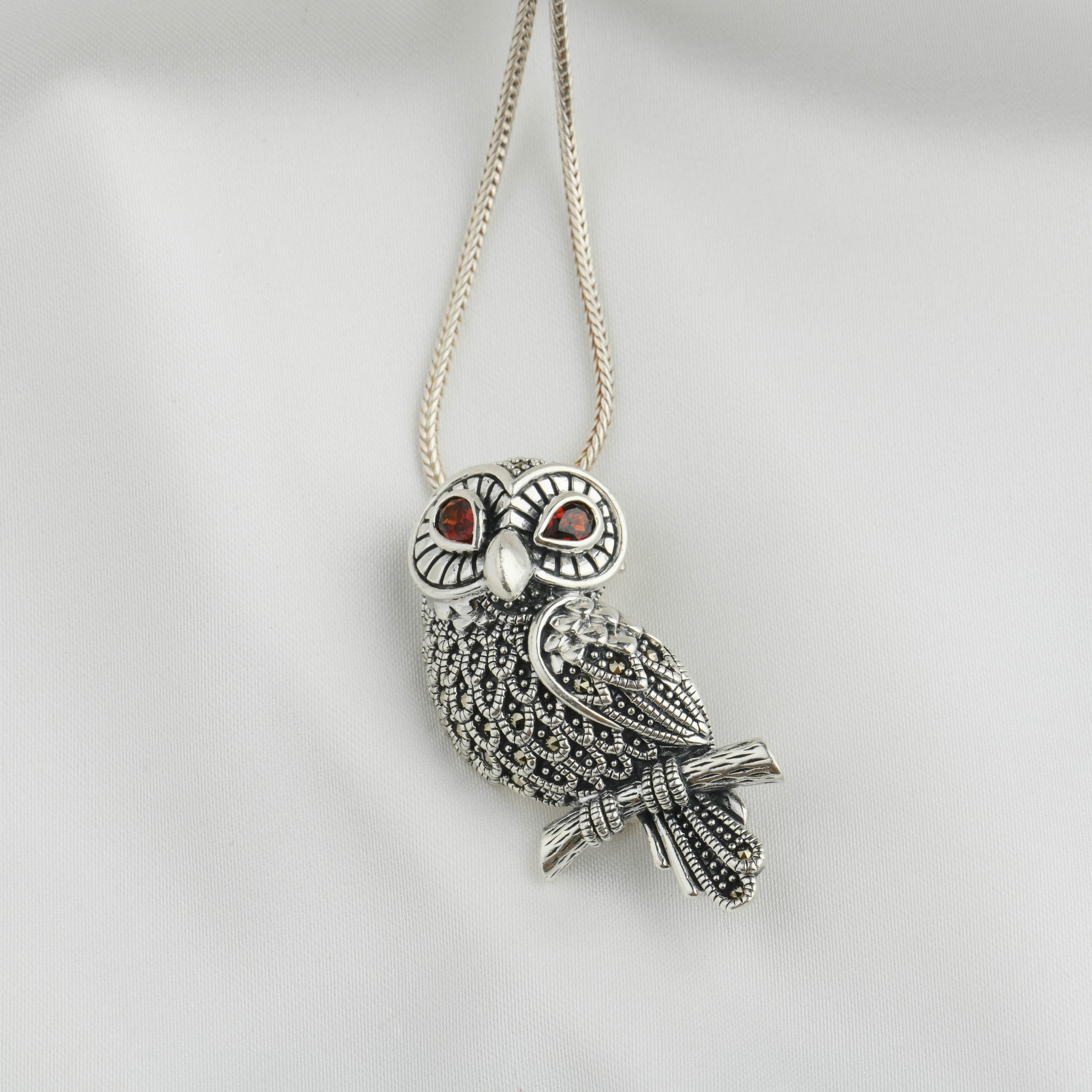 Discover the enchanting charm of the Crimson-Eyed Marcasite Silver Owl Brooch Cum Pendant. This exquisite piece beautifully marries artistic flair with nature-inspired elegance. Crafted from shimmering sterling silver and adorned with intricate marcasite detailing, the owl’s mesmerizing red garnet eyes radiate a captivating allure.