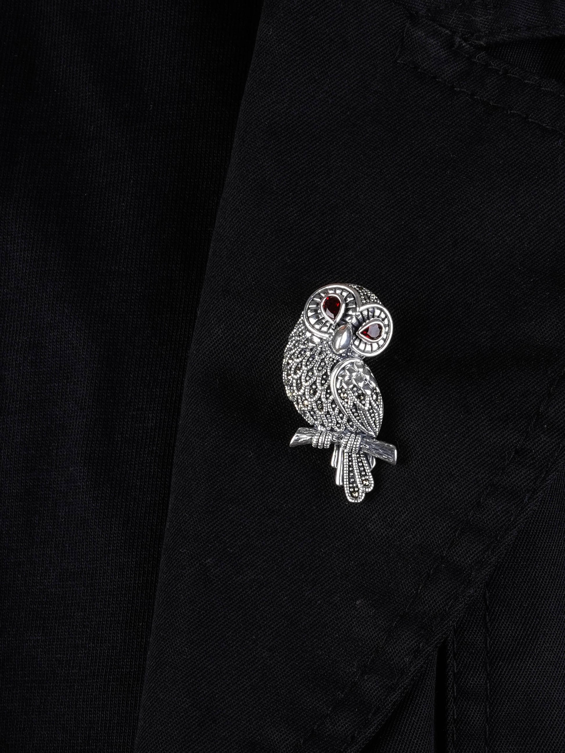 Crimson-Eyed : Marcasite Silver Owl Brooch cum Pendant