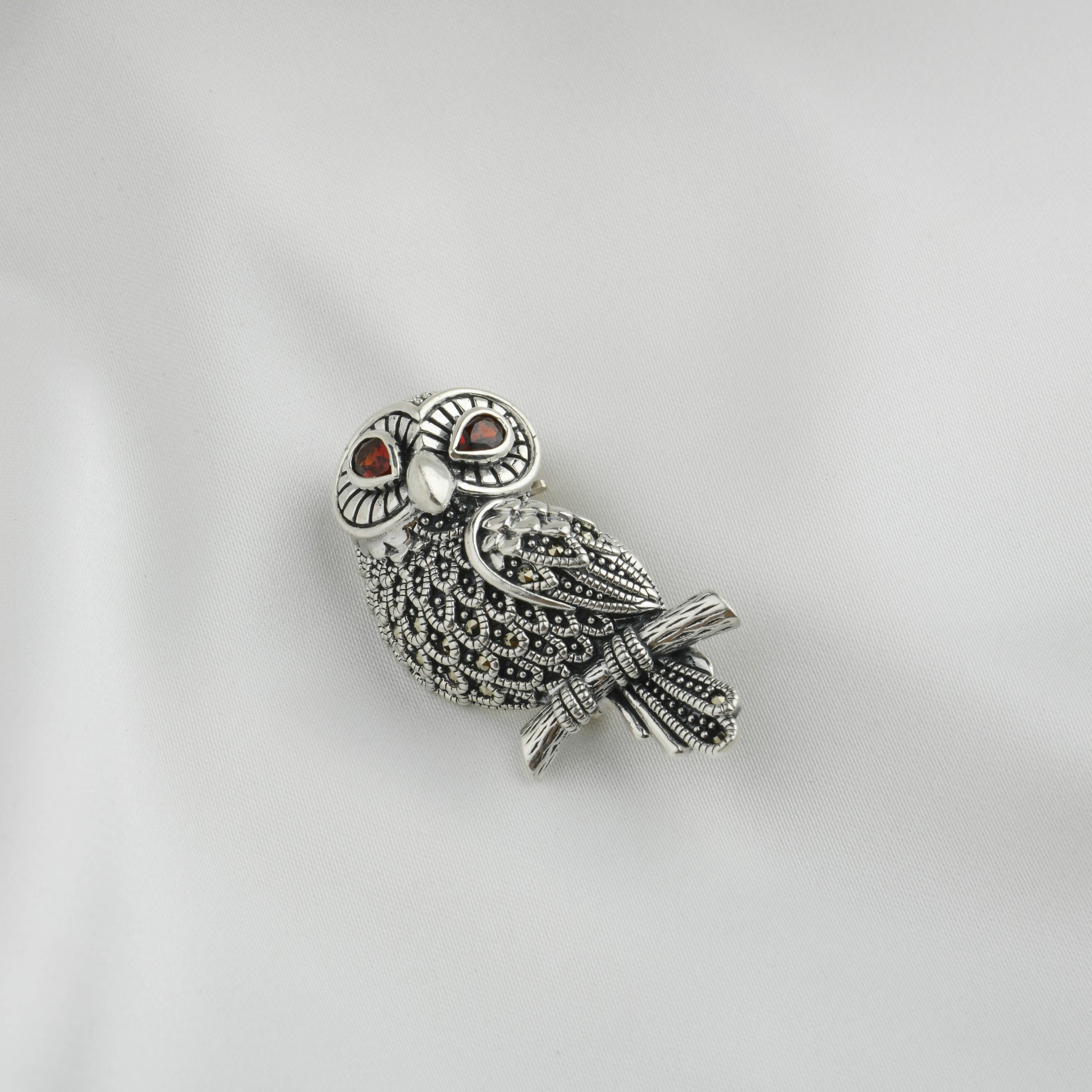 Crimson-Eyed: Marcasite Silver Owl Brooch Cum Pendant