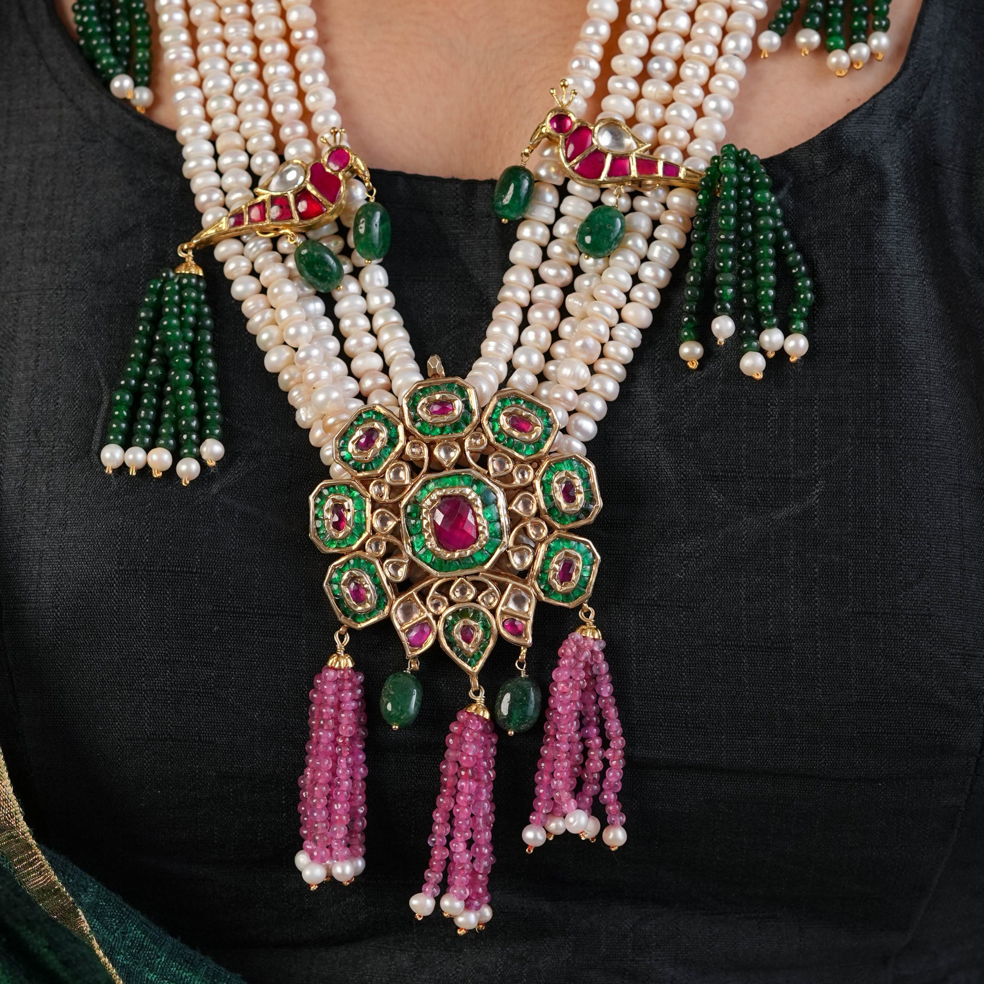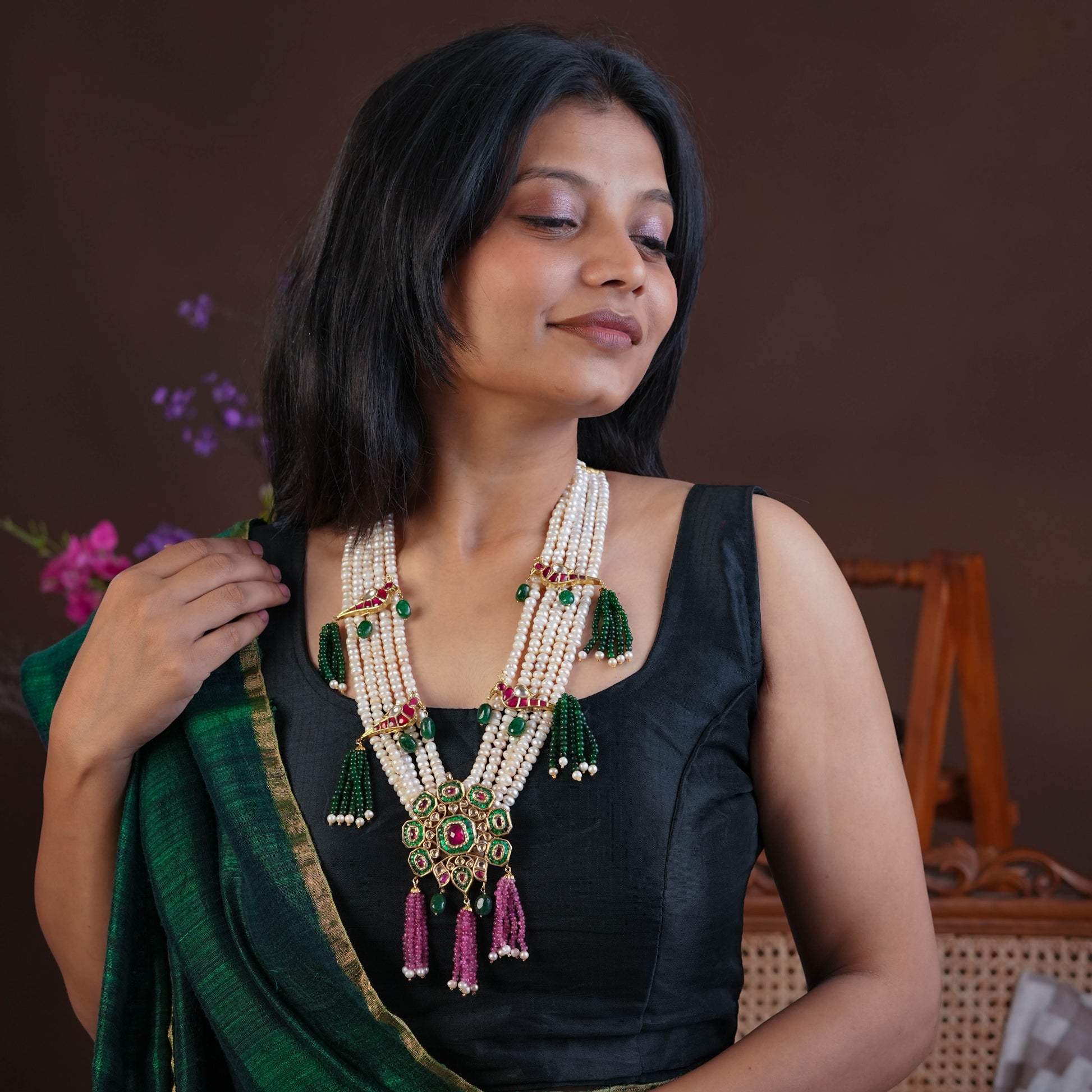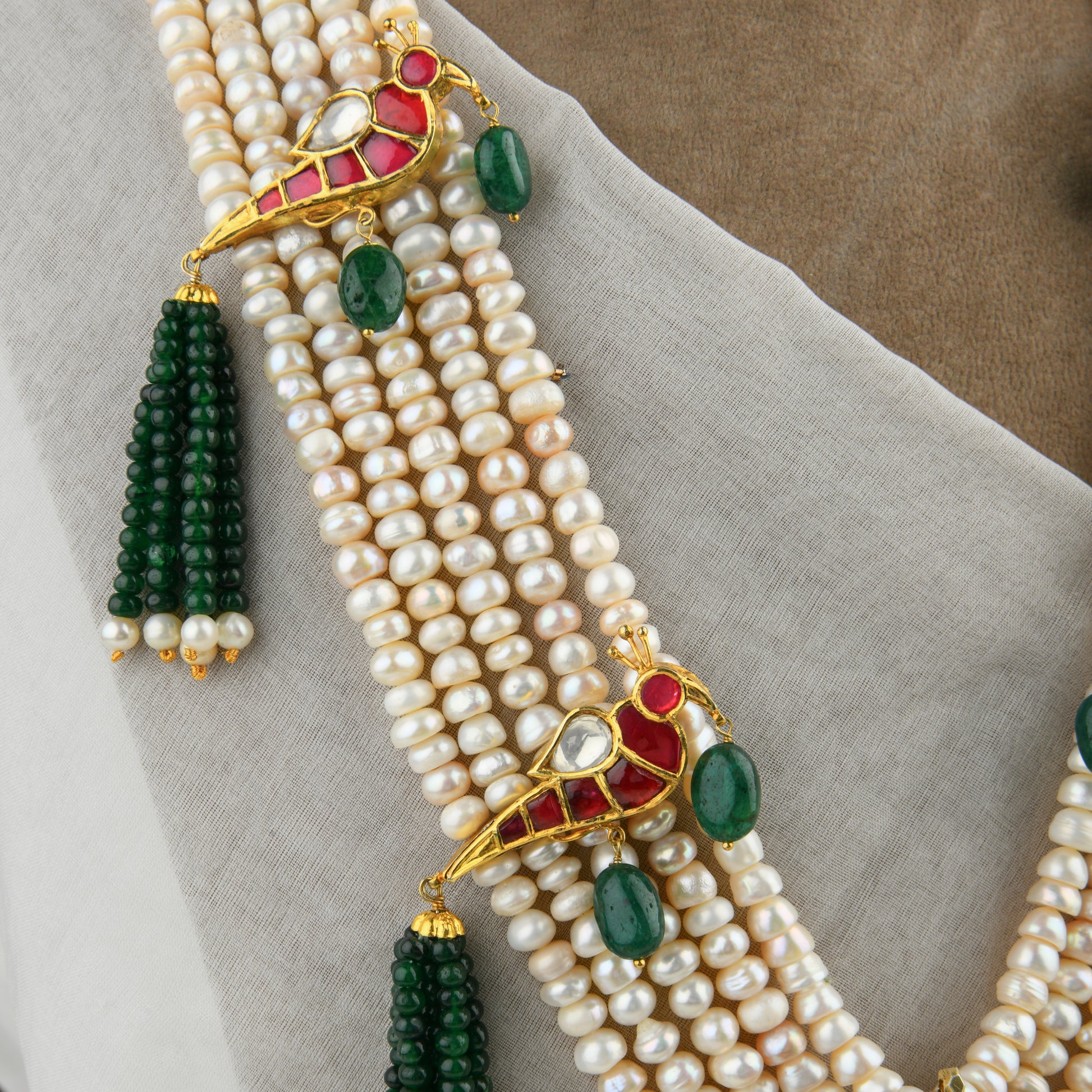 Lovingly handmade at the Totapari studio, this designer necklace is a symphony of traditional arts. Multiple strands of luminous **freshwater pearls** cascade gracefully, interspersed with stations of intricate **Kundan** work. The breathtaking 11 cm central motif is a testament to our artisans' skill, featuring a dazzling array of gemstones including **Lapis Lazuli beads**, all set in **92.5 Sterling Silver**.