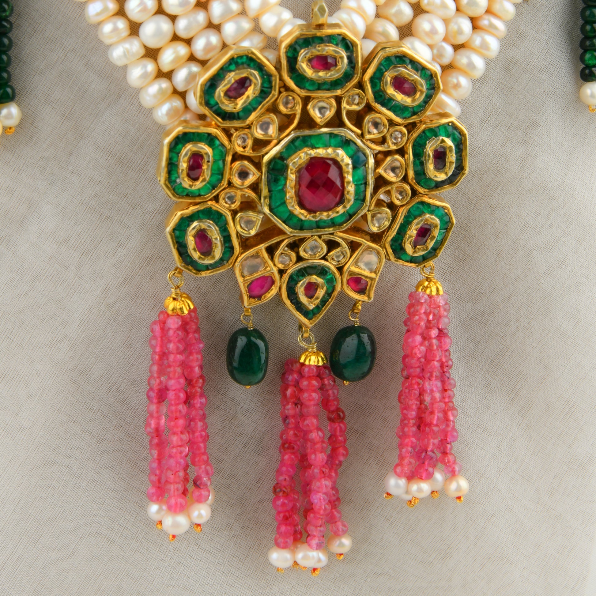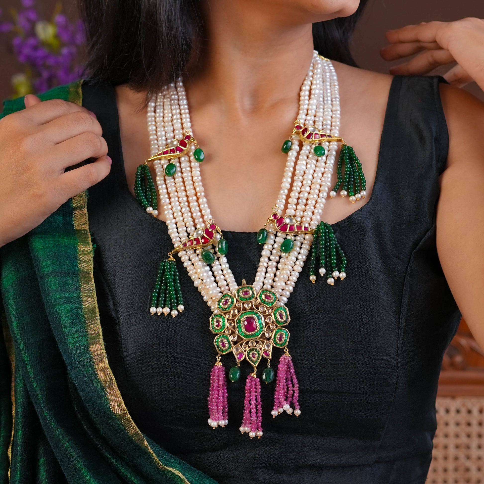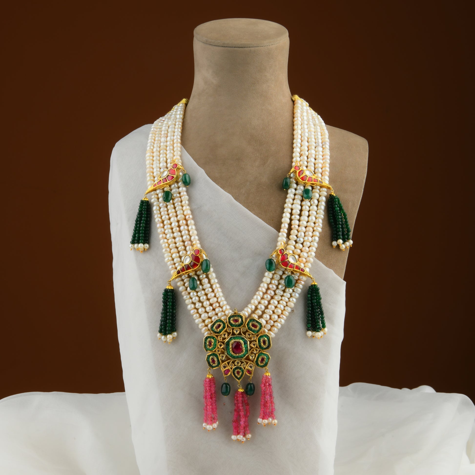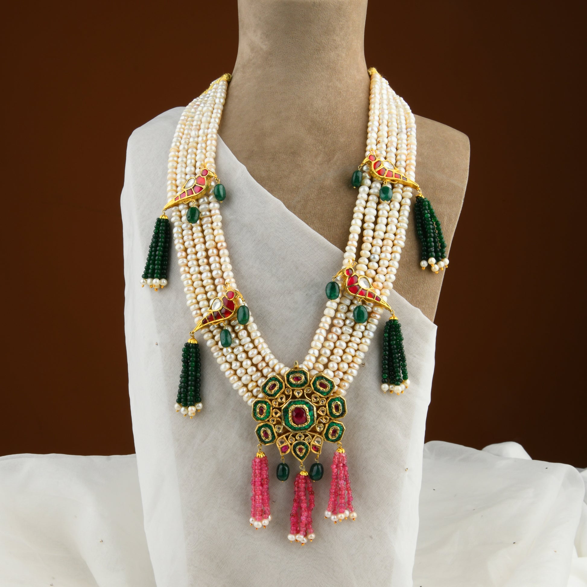Lovingly handmade at the Totapari studio, this designer necklace is a symphony of traditional arts. Multiple strands of luminous **freshwater pearls** cascade gracefully, interspersed with stations of intricate **Kundan** work. The breathtaking 11 cm central motif is a testament to our artisans' skill, featuring a dazzling array of gemstones including **Lapis Lazuli beads**, all set in **92.5 Sterling Silver**.