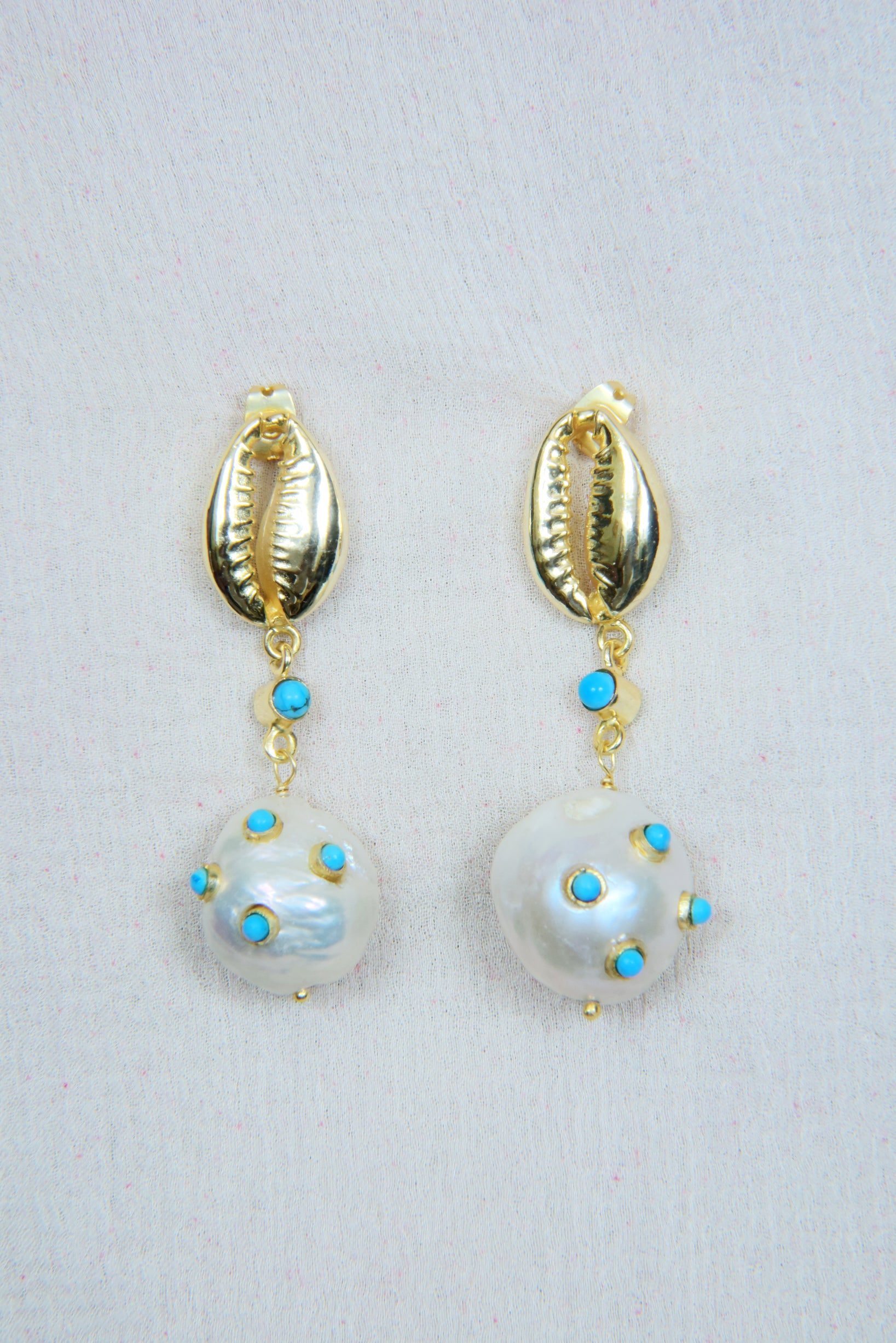 14 kt gold-plated brass; freshwater baroque pearls; turquoise stone