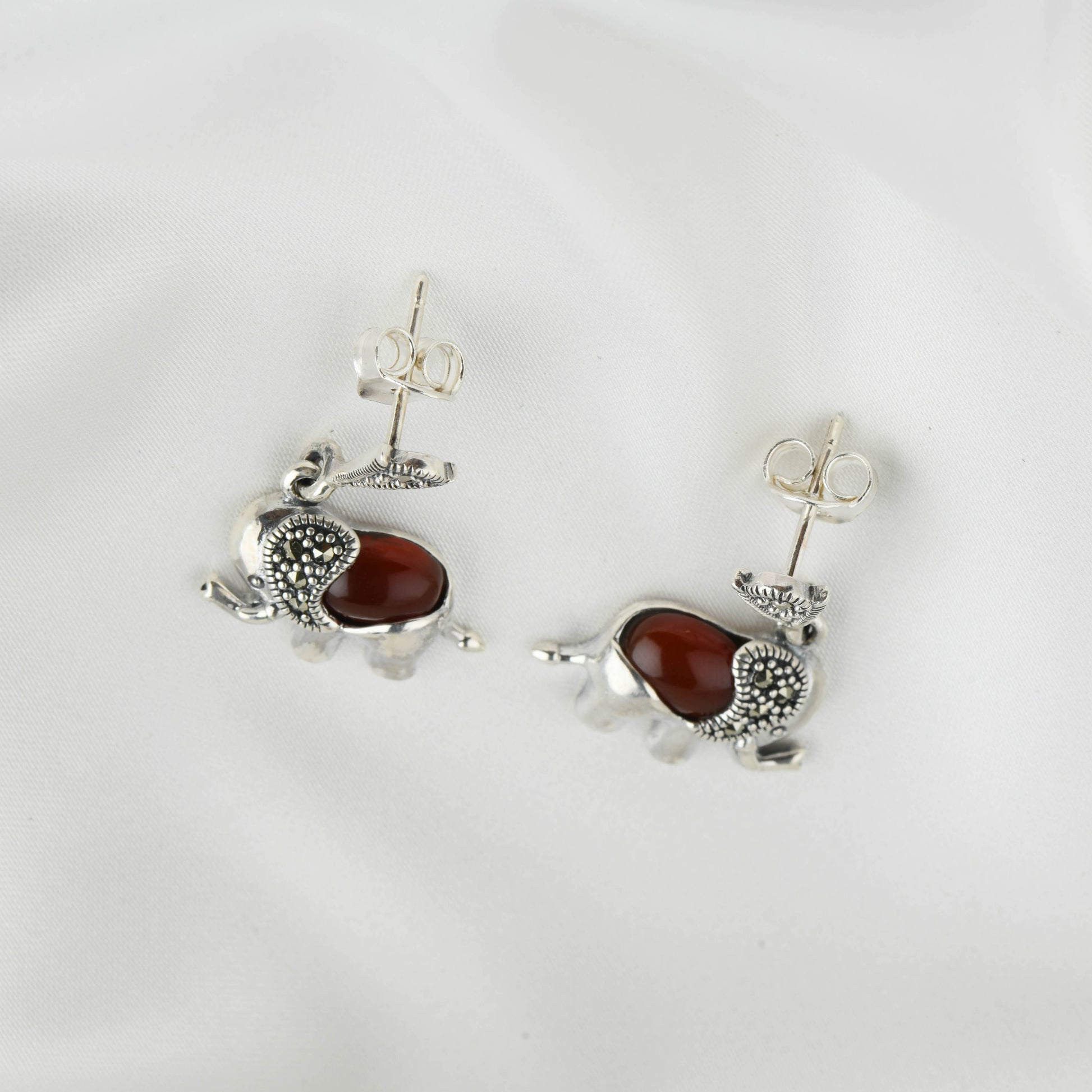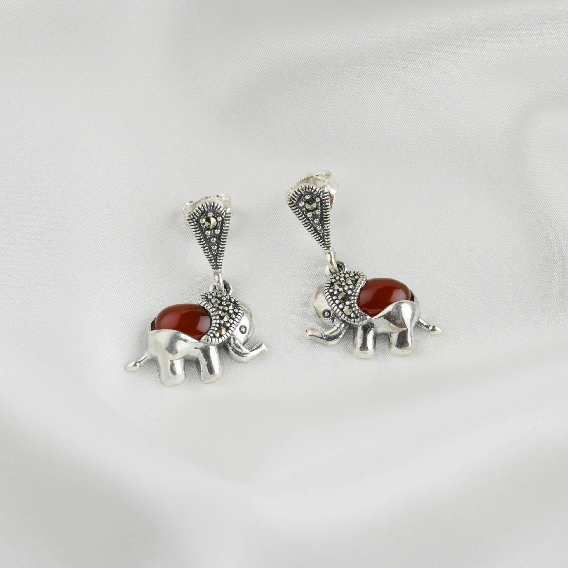Elephant Carnelian Marcasite Earrings: Majestic Grace, Earthy Warmth.