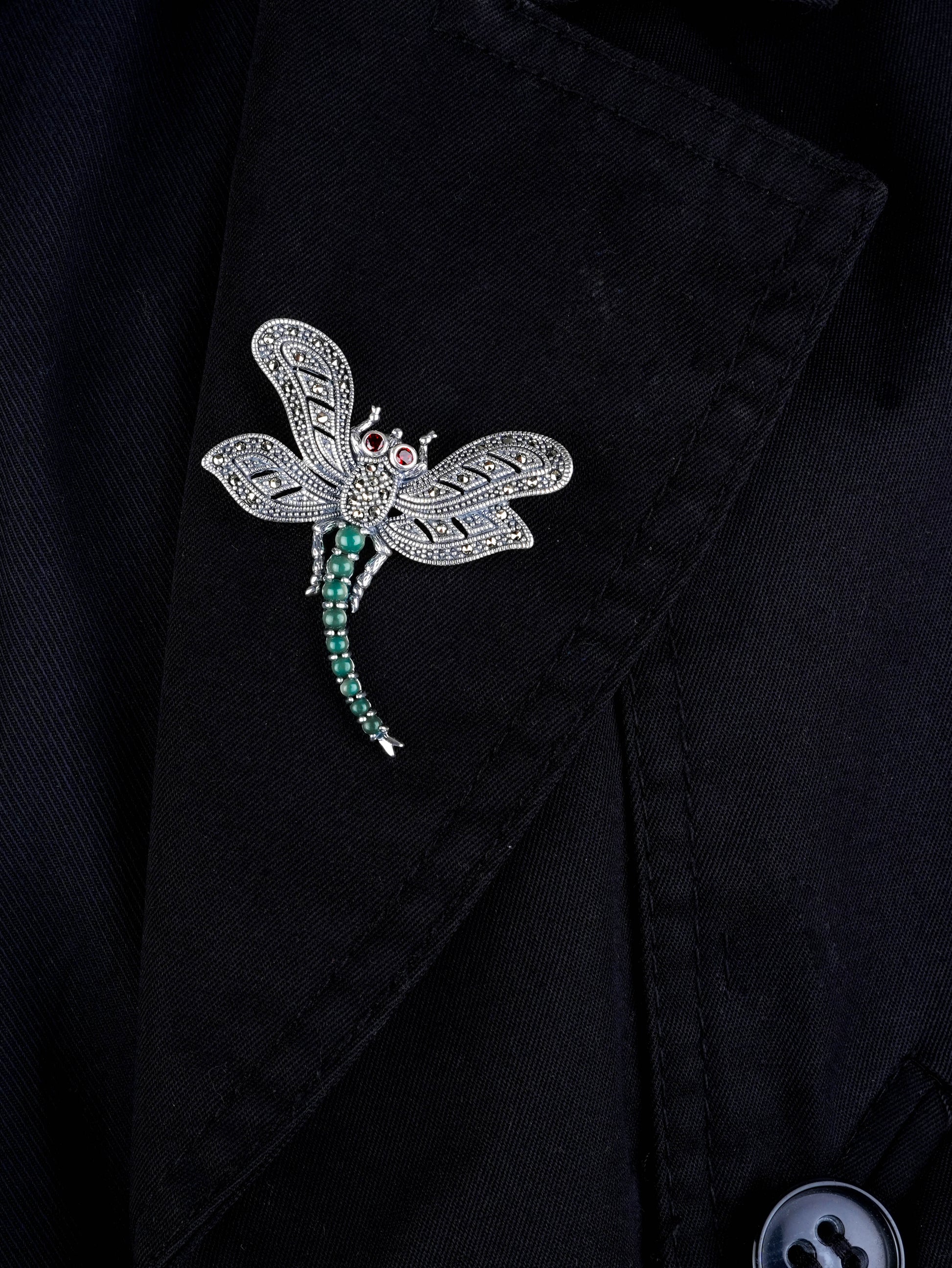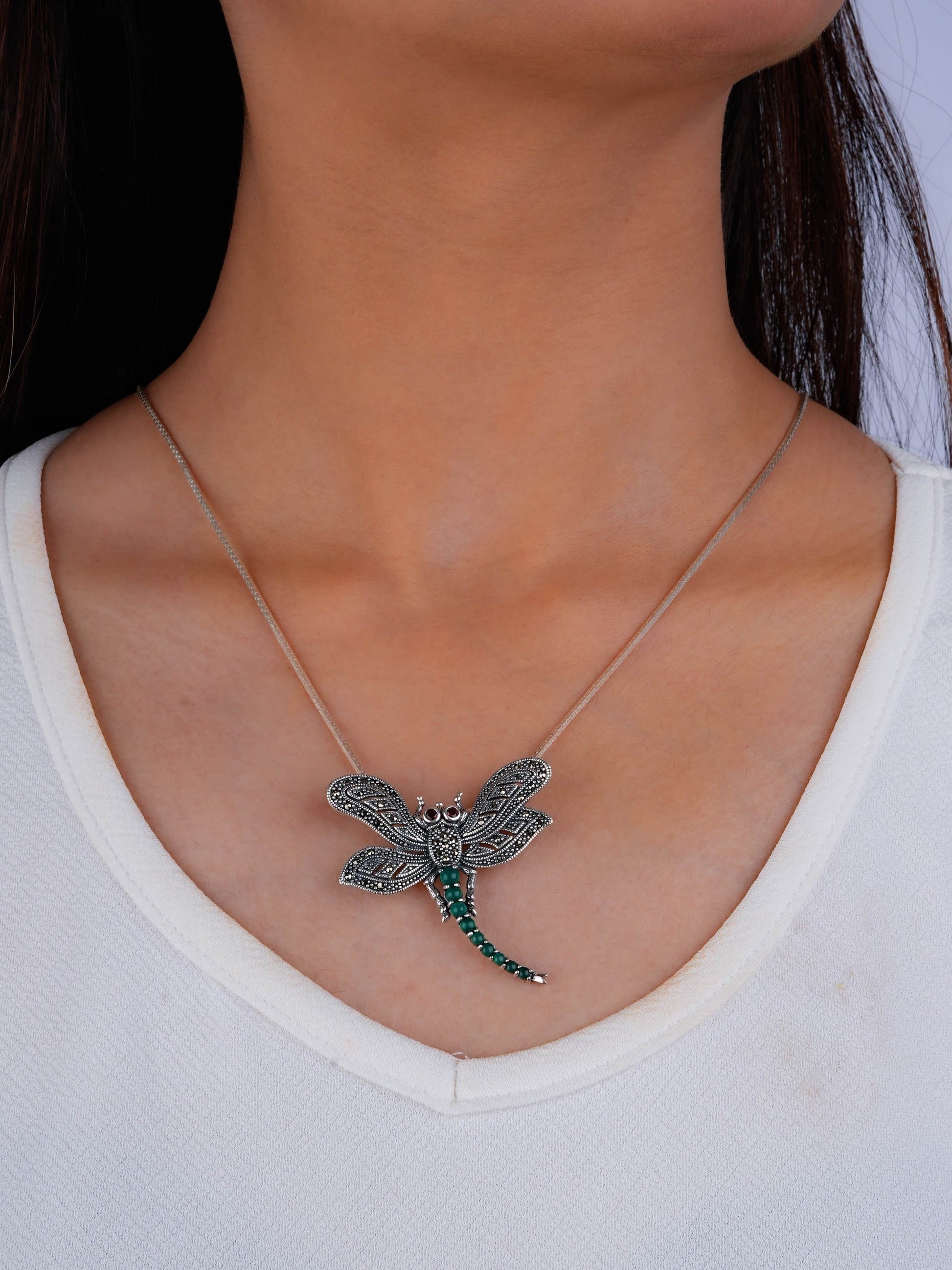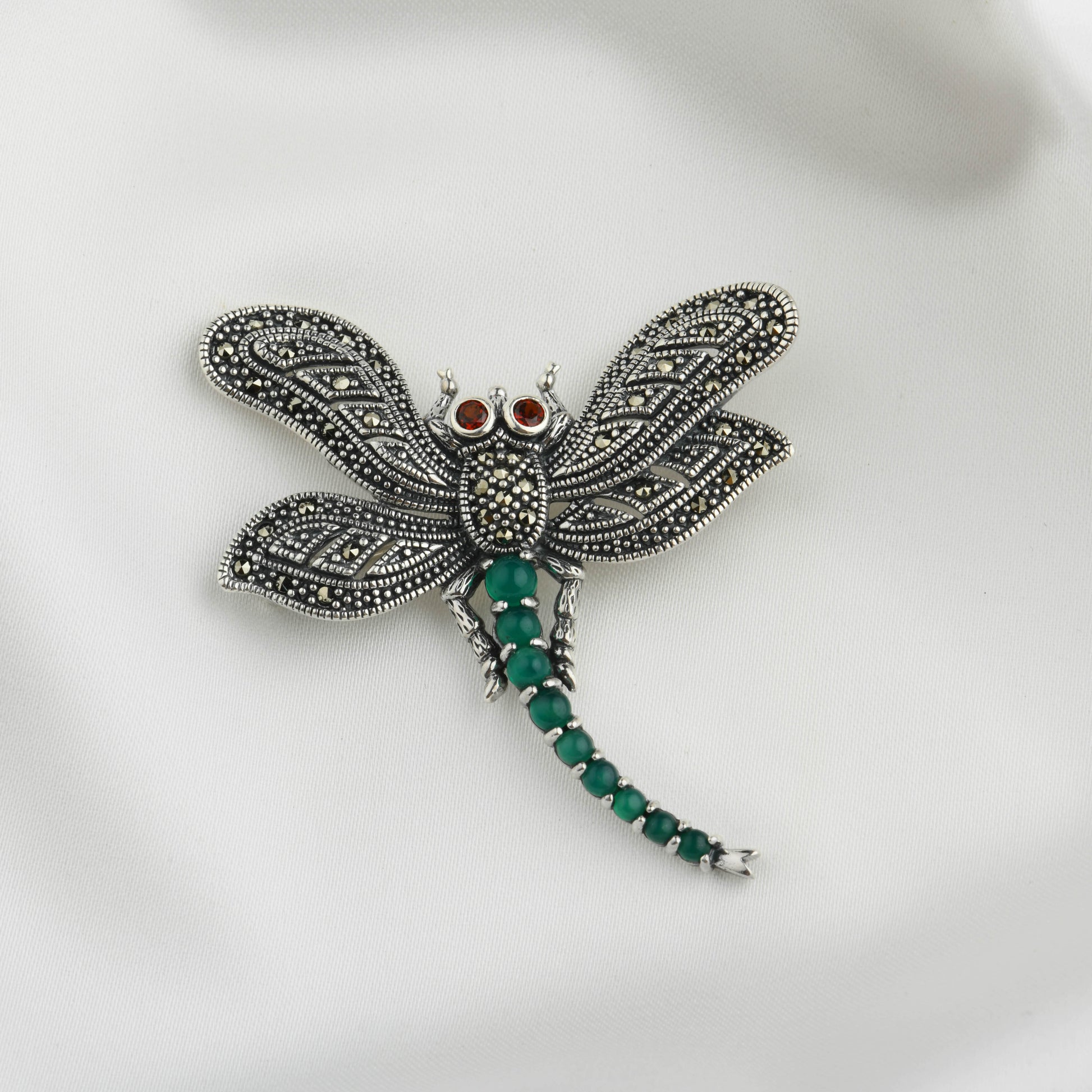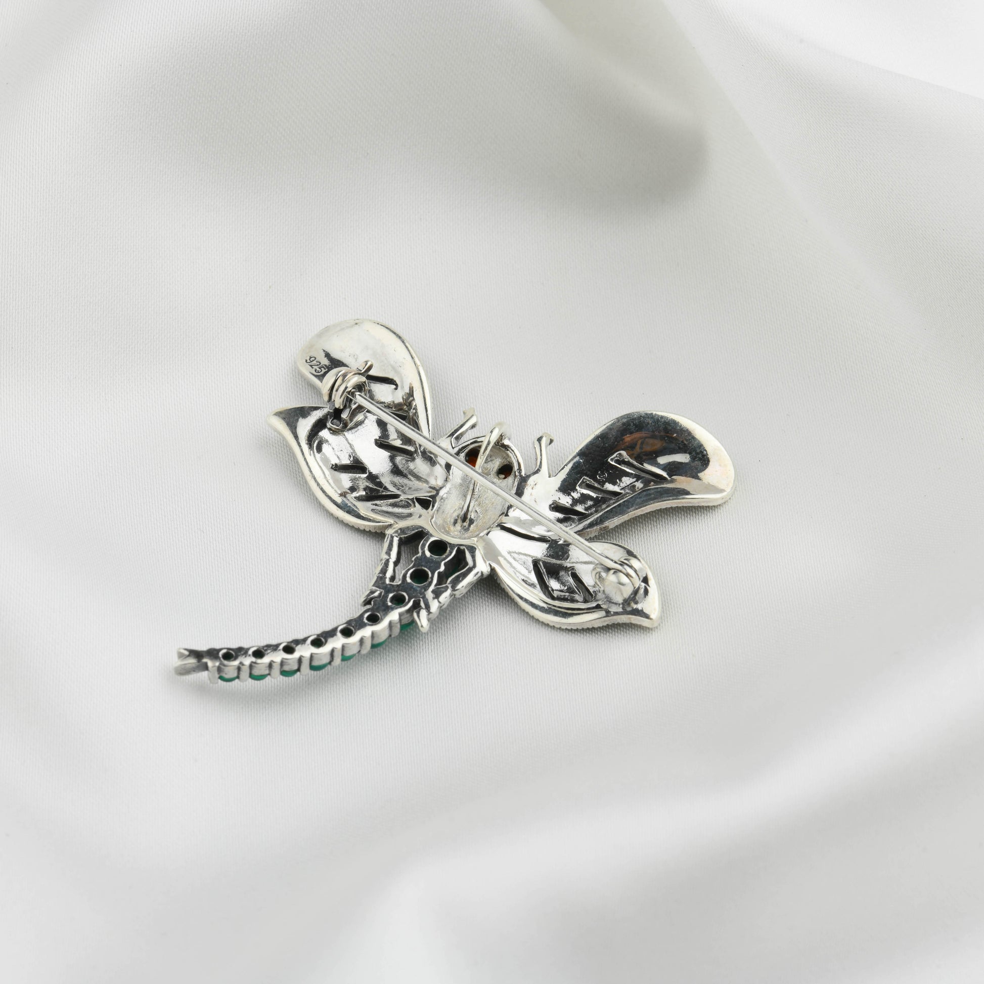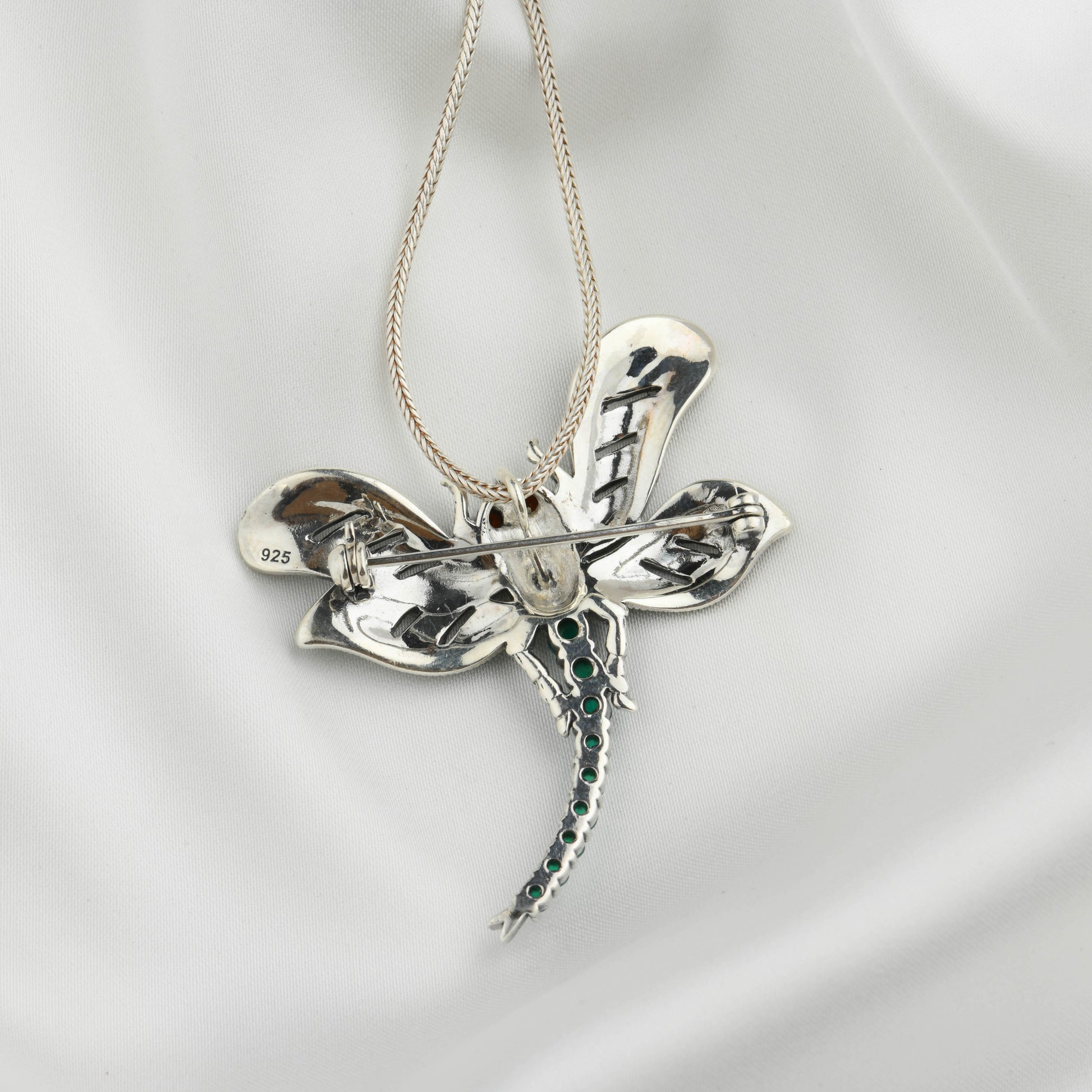 Unlock the beauty of nature with the Emerald Elegance: Dragonfly Brooch Cum Pendant. This stunning piece is intricately crafted from shimmering sterling silver, adorned with sparkling marcasite that adds depth and allure. The eye-catching emerald green gemstone body radiates vibrant energy, perfectly complemented by striking red garnet eyes that capture the light.