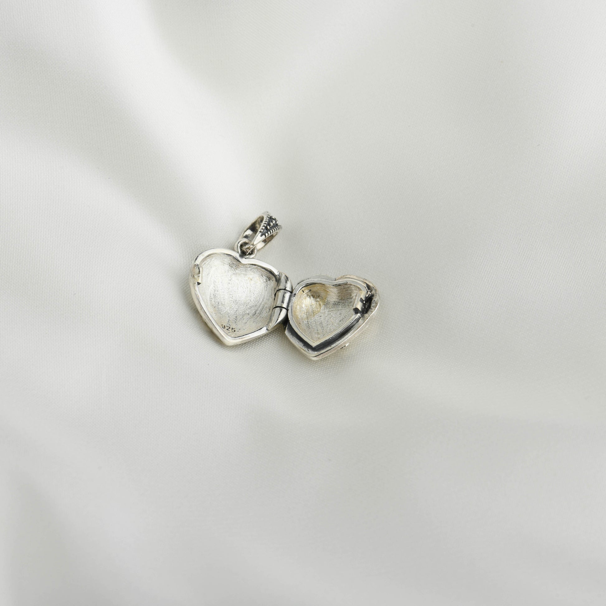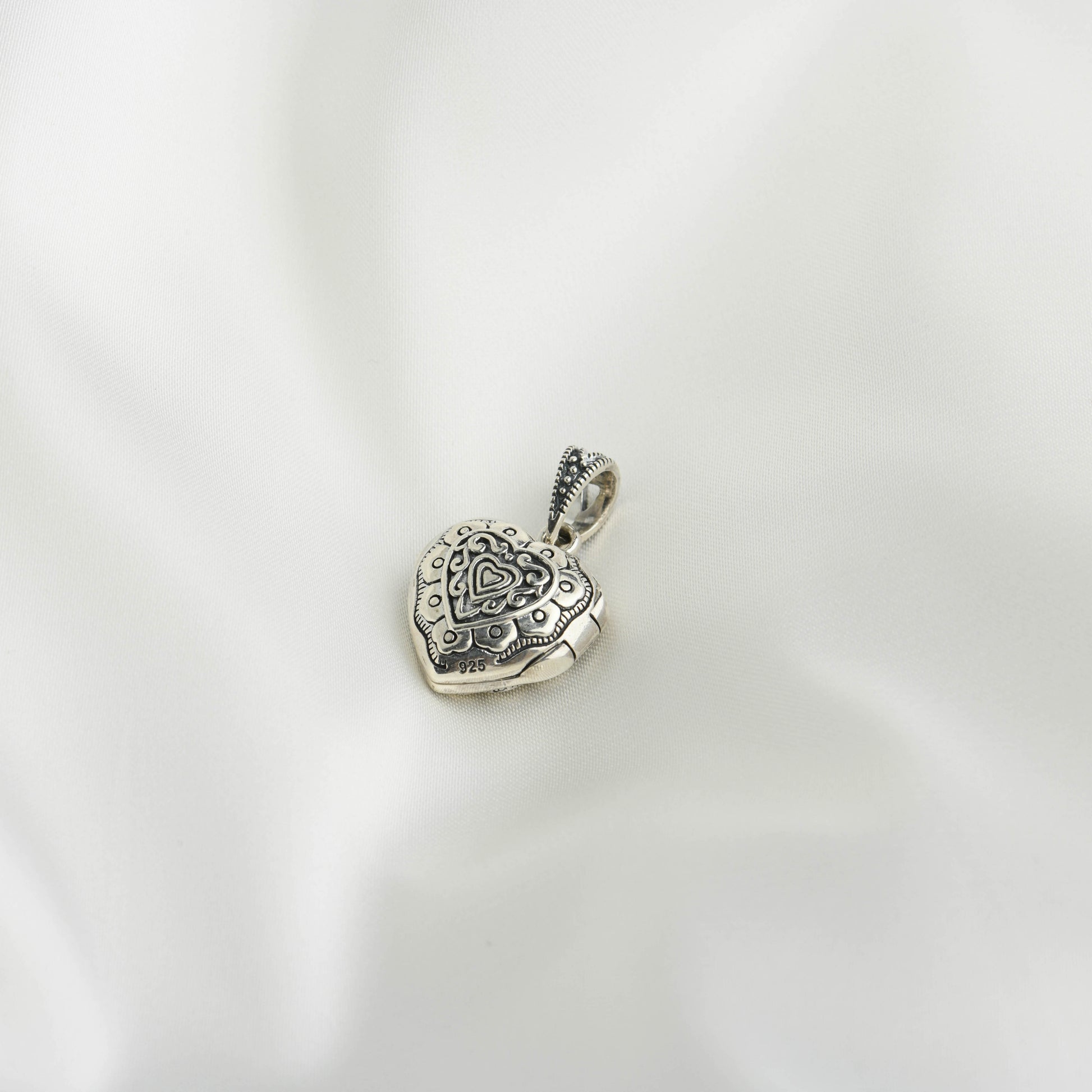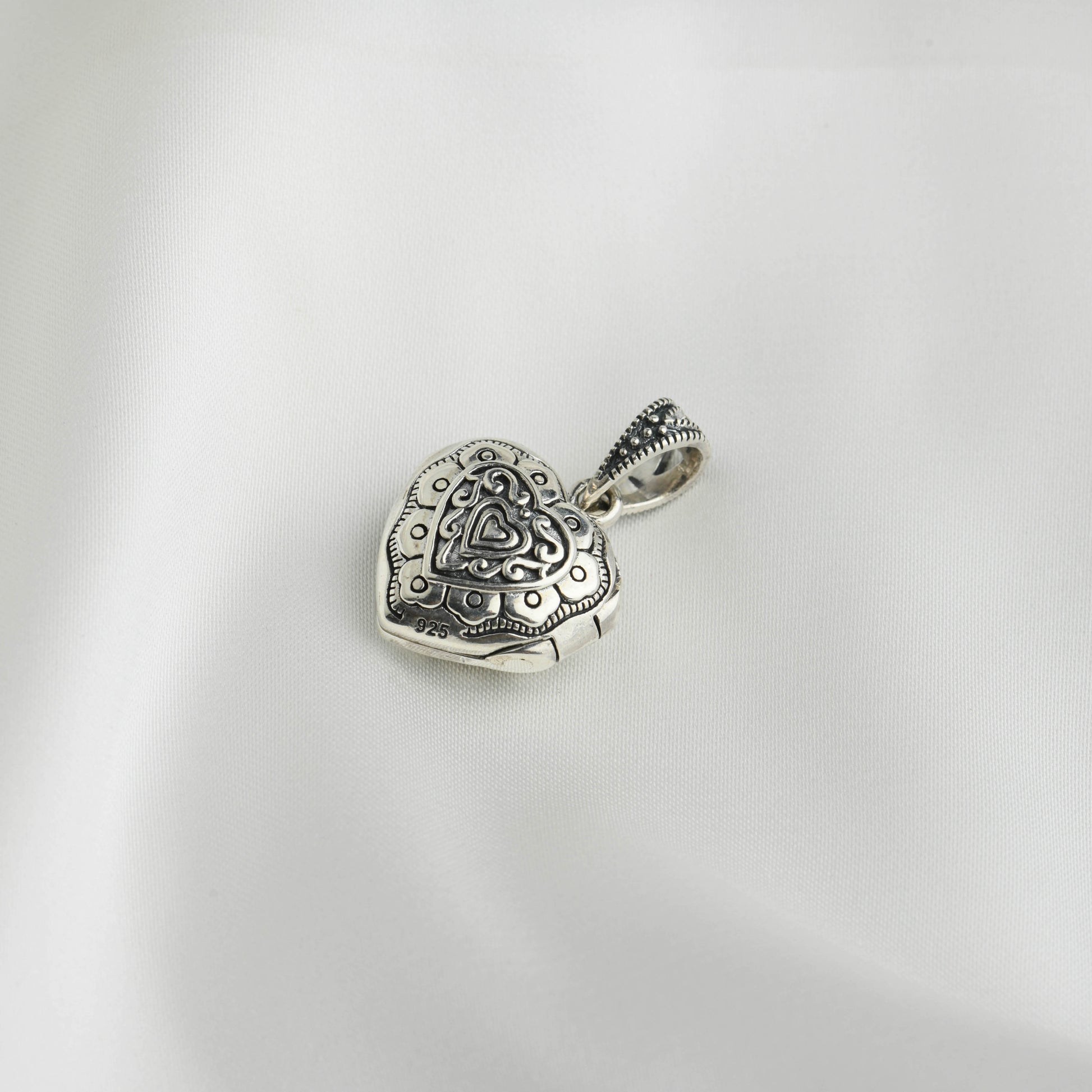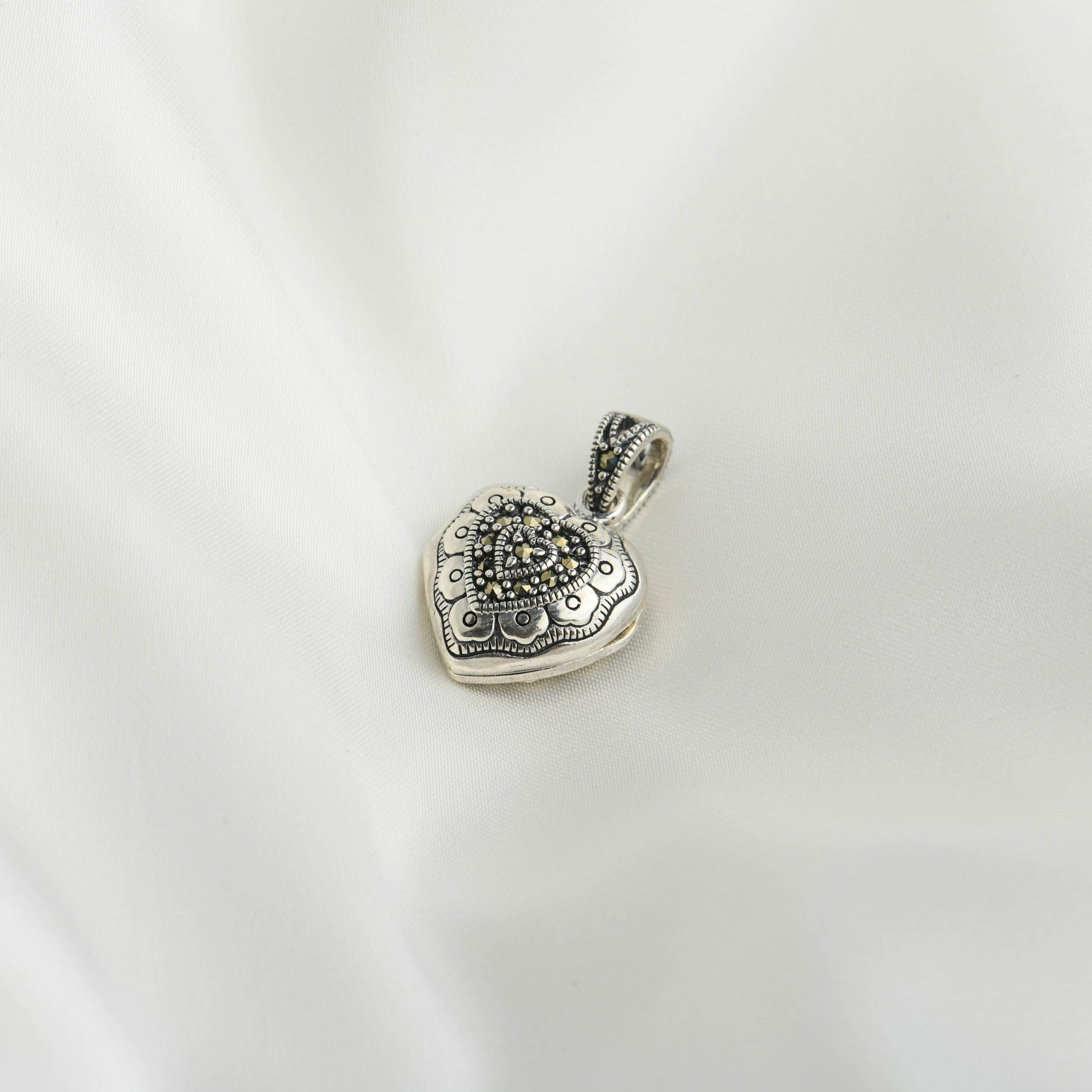 Capture the essence of love with the Eternal Embrace: Open Heart Marcasite Pendant. Crafted from shimmering sterling silver, this exquisite piece features an intricate open heart design, symbolizing love, affection, romance, and the beauty of life. Adorned with sparkling marcasite, it adds a touch of vintage elegance to this timeless motif.