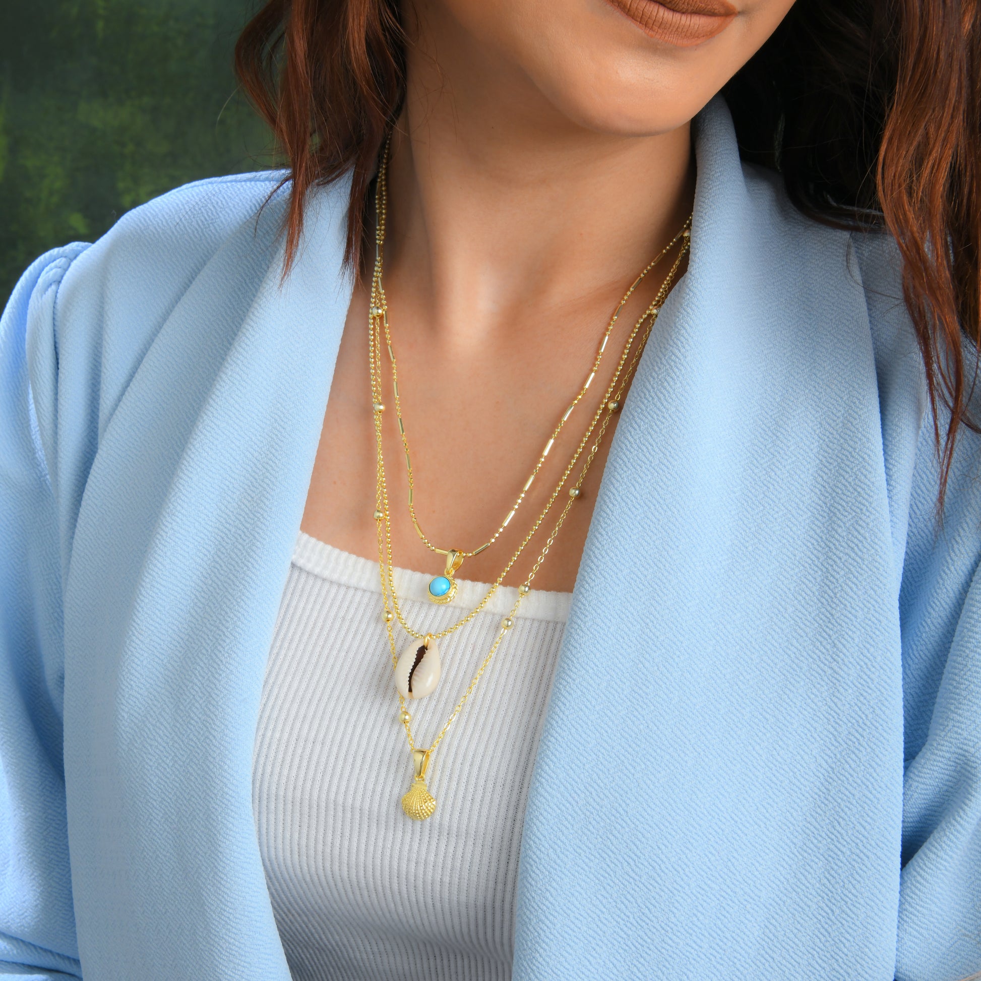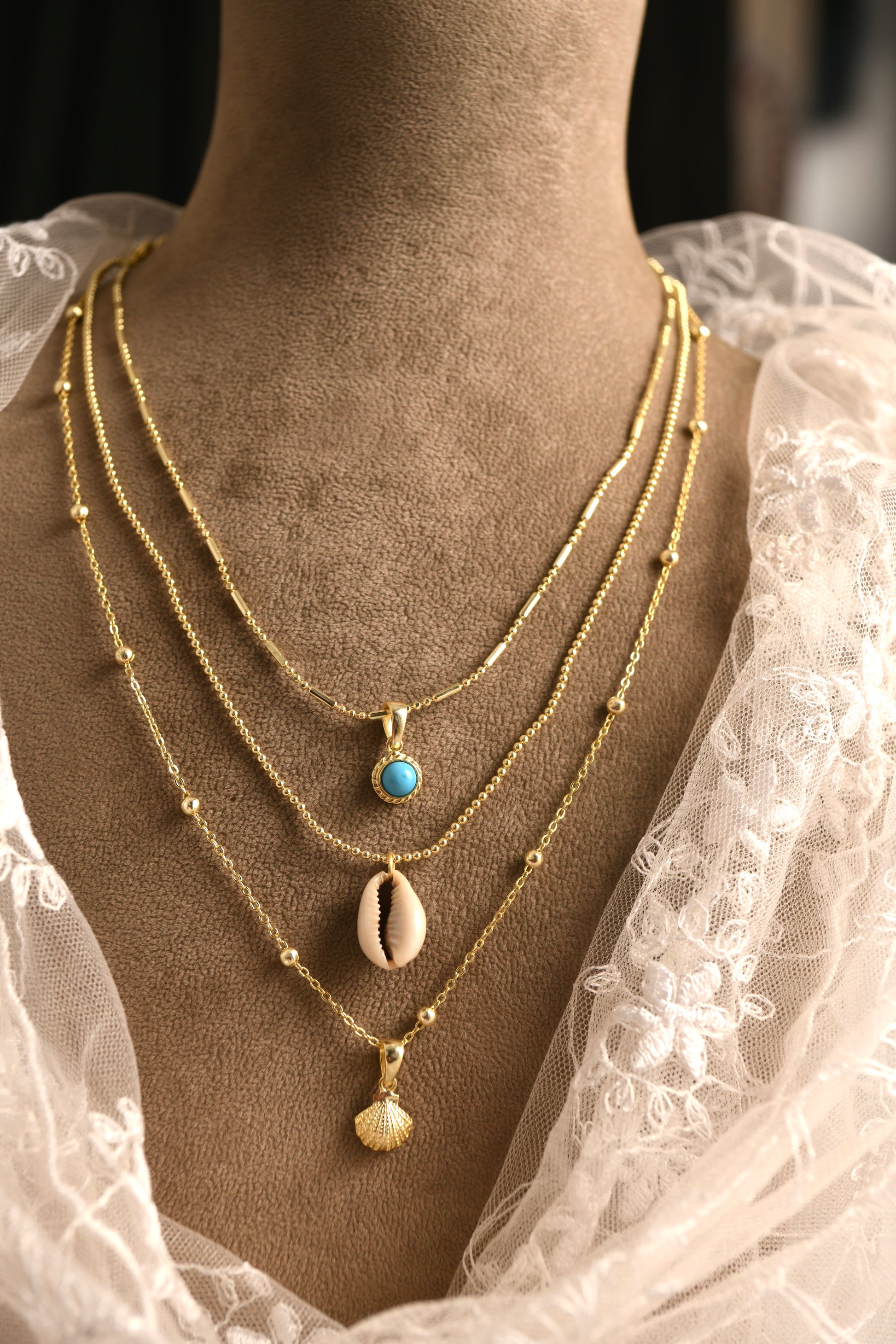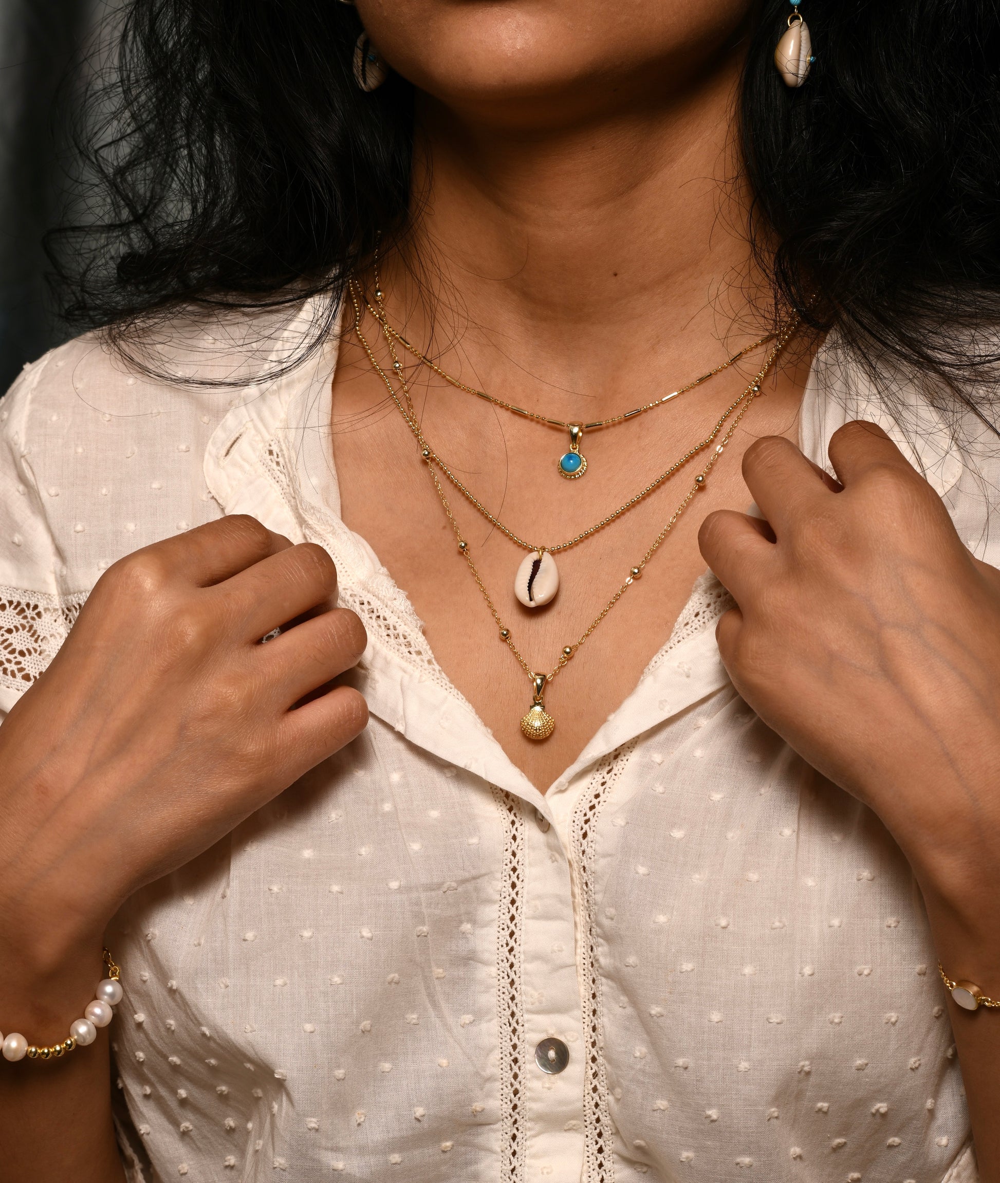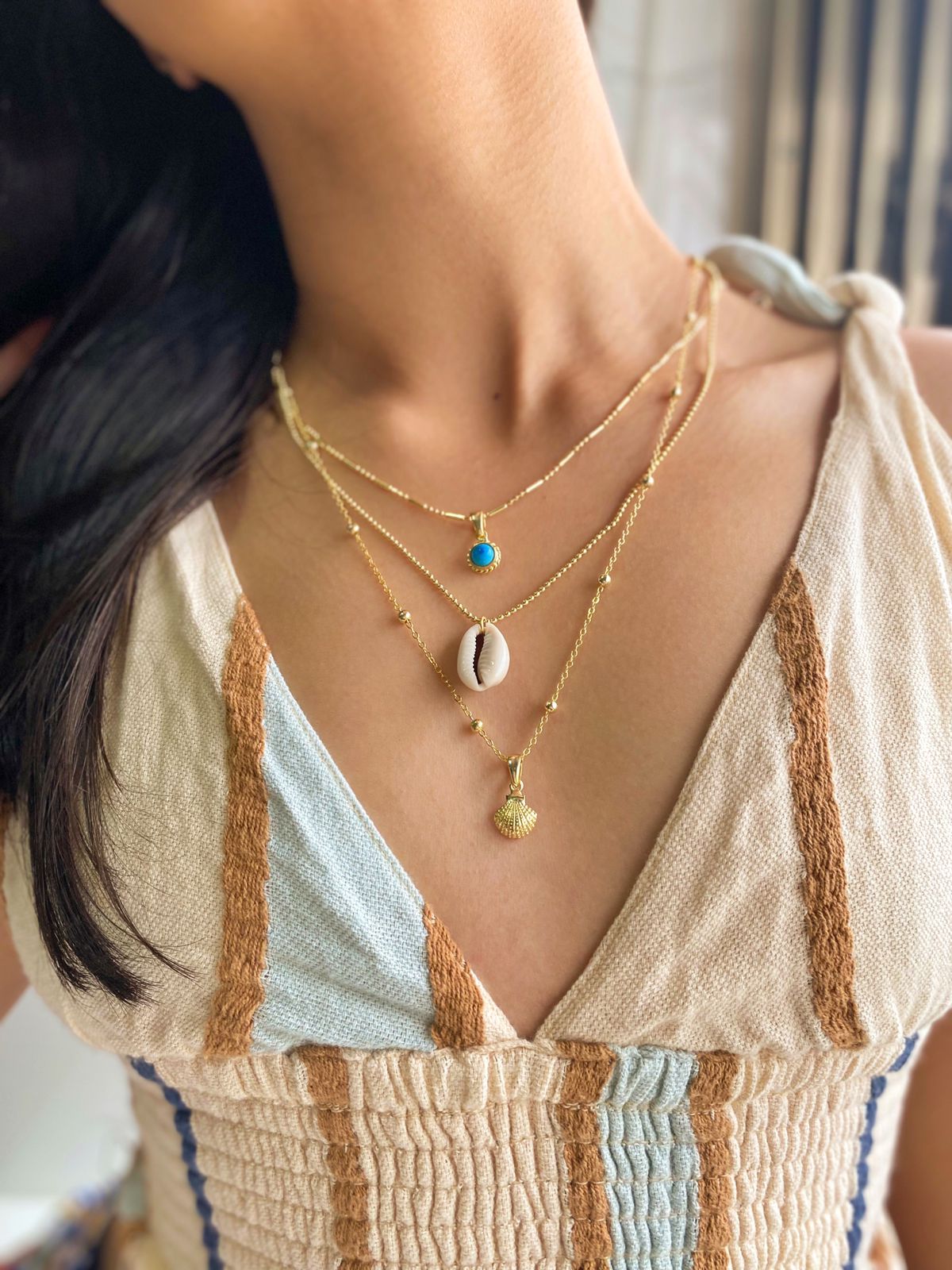 14 kt gold-plated brass; natural sea-shell; freshwater pearls; turquoise stone
