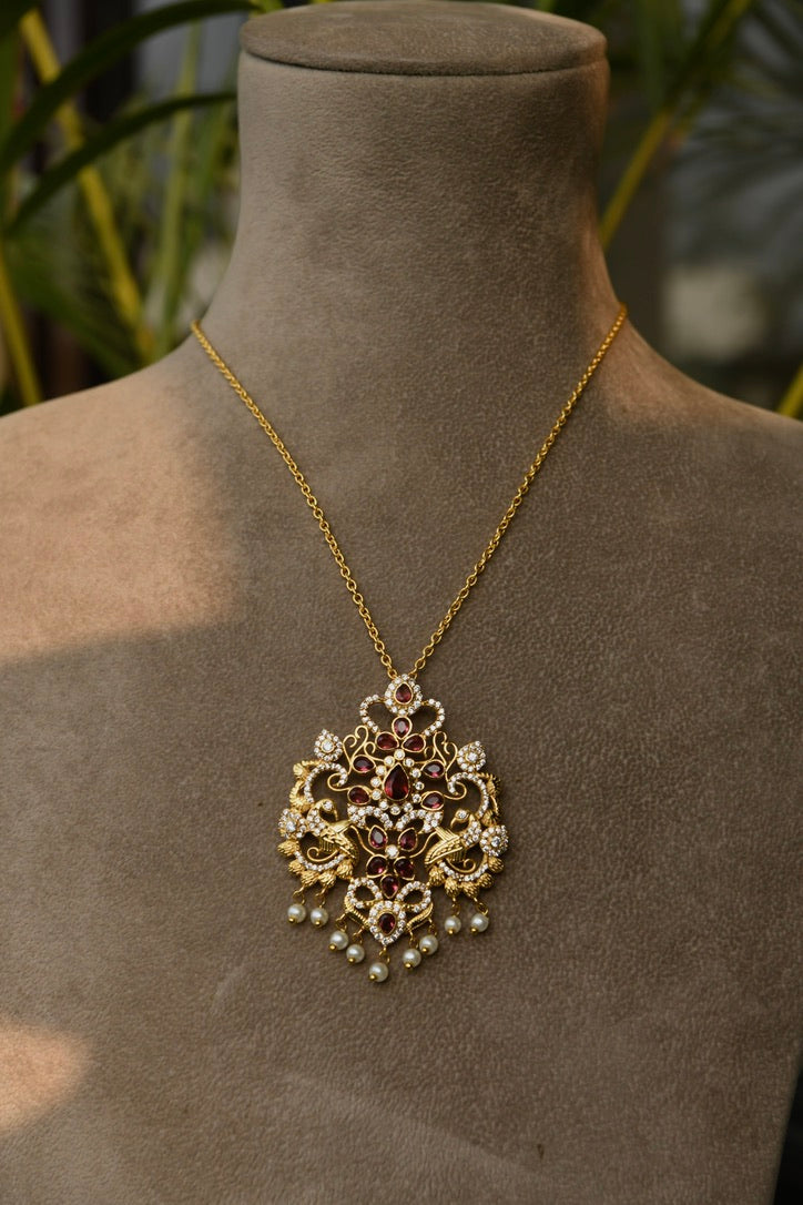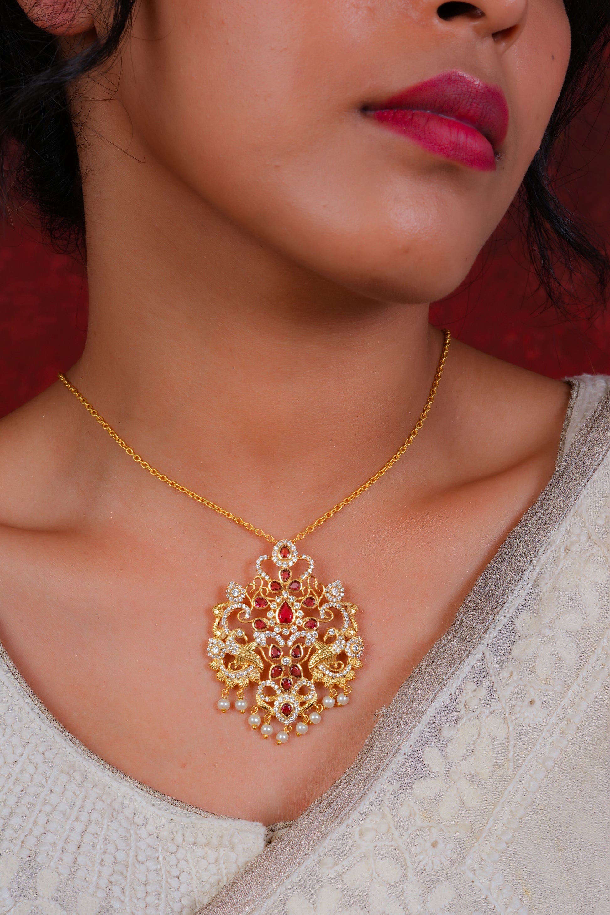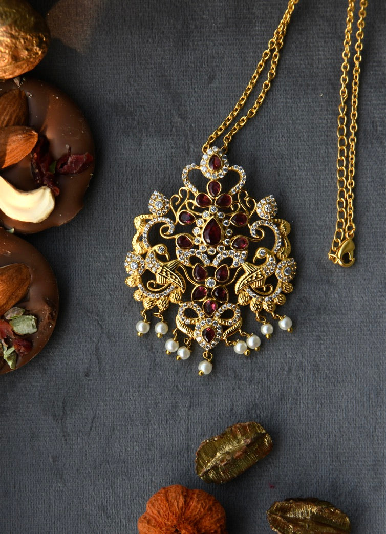 22kt Gold-plated Brass, Synthetic Rubies, Zircon and Pearls.