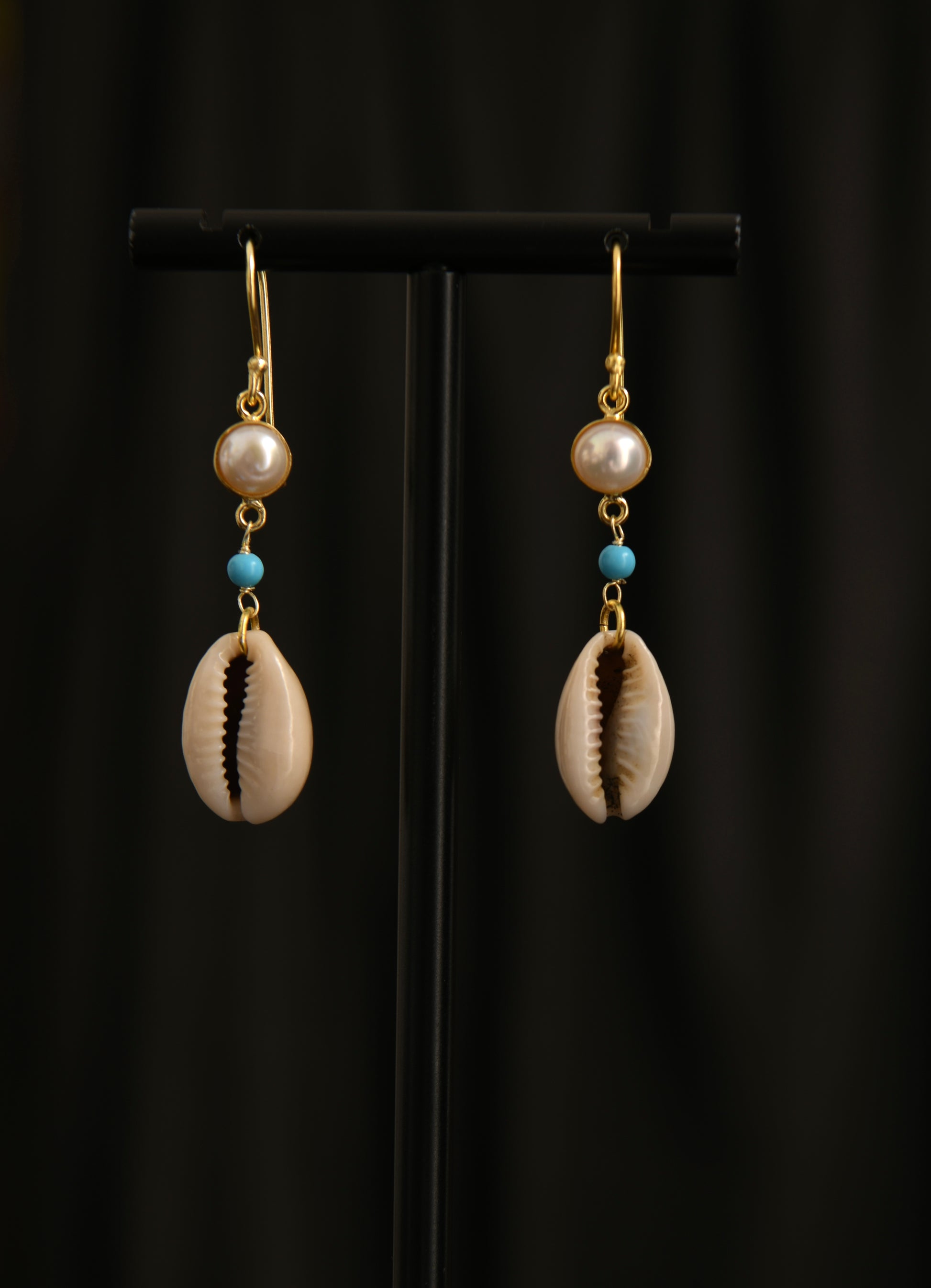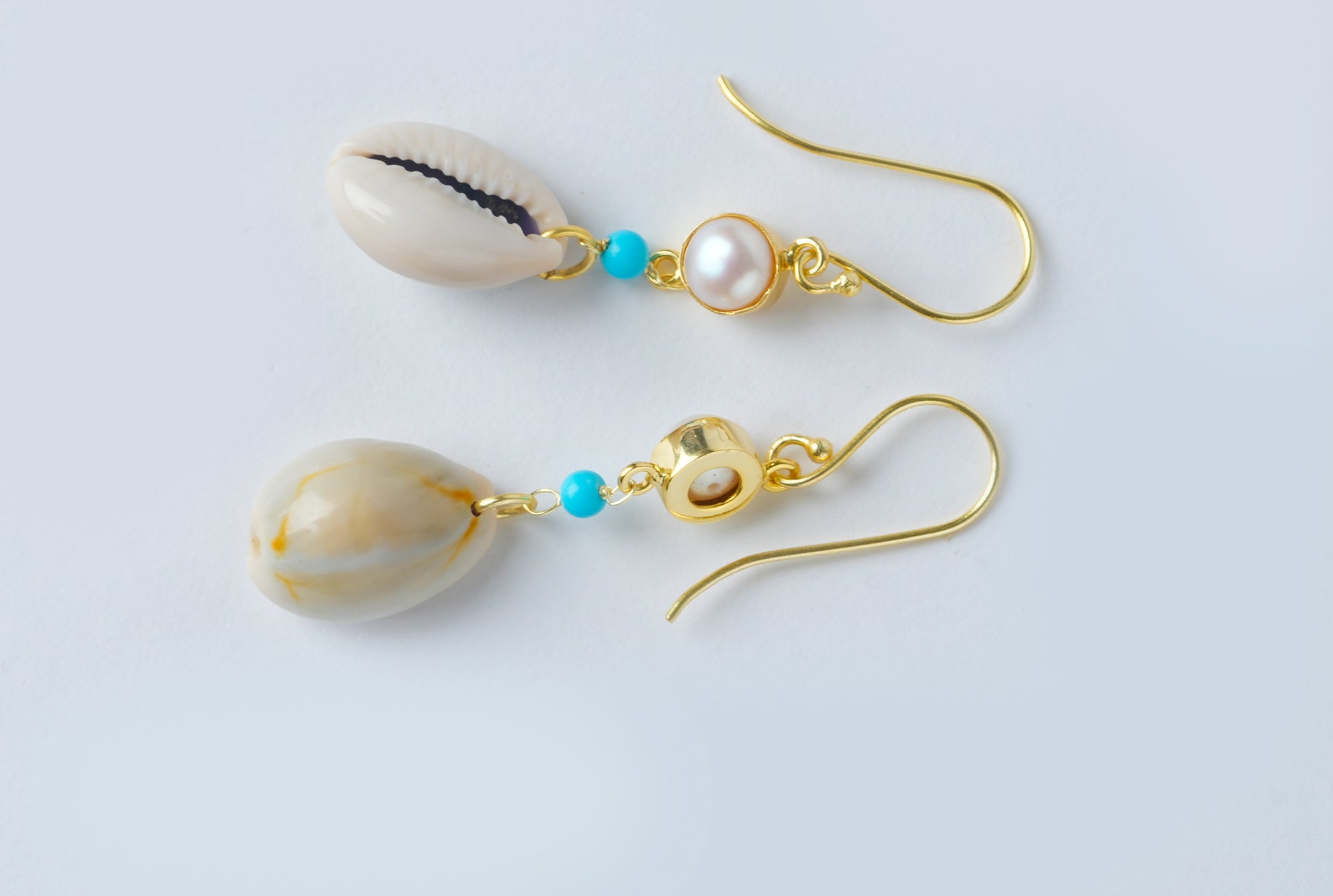 14 kt gold-plated brass; freshwater pearl; turquoise stone; natural sea shell