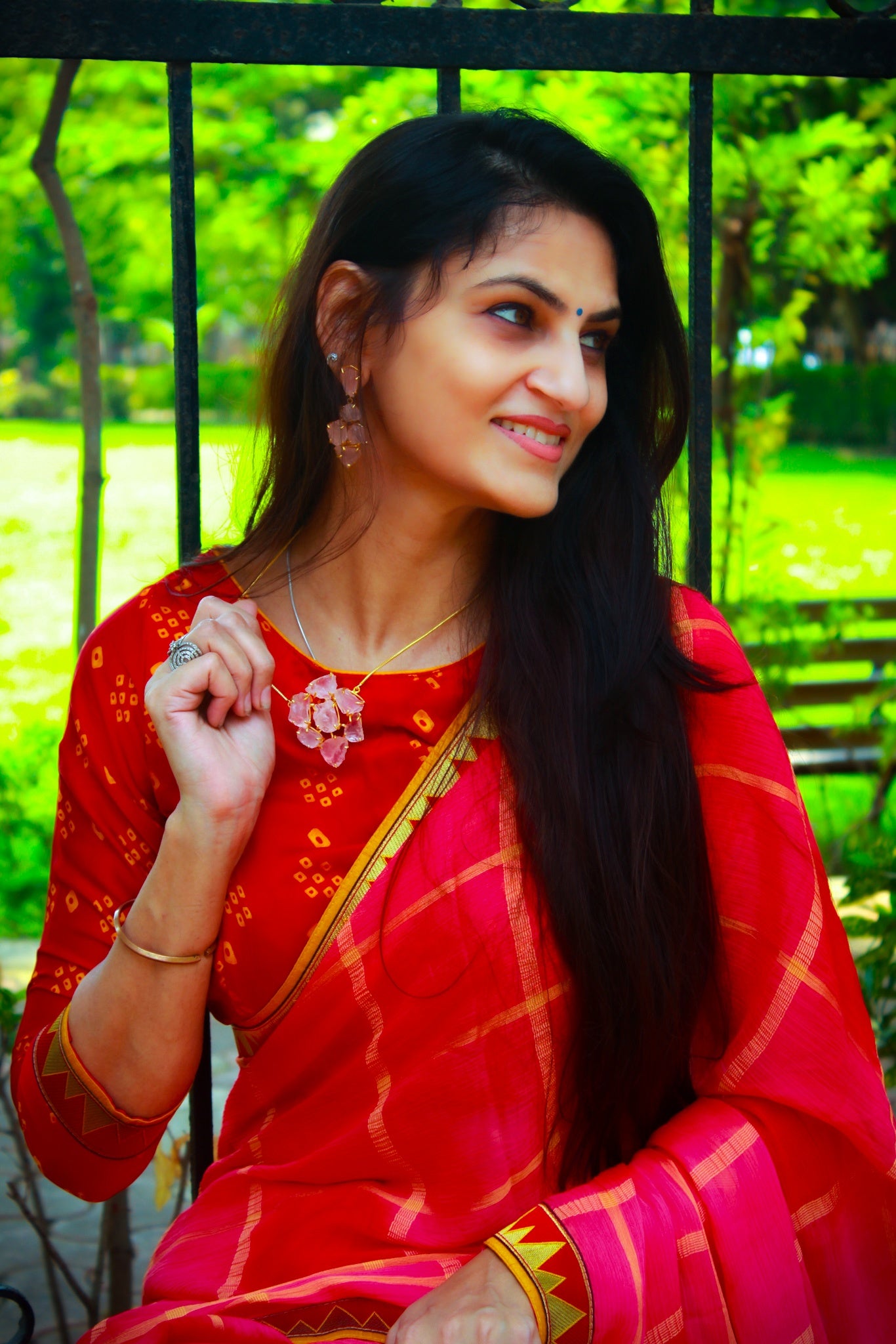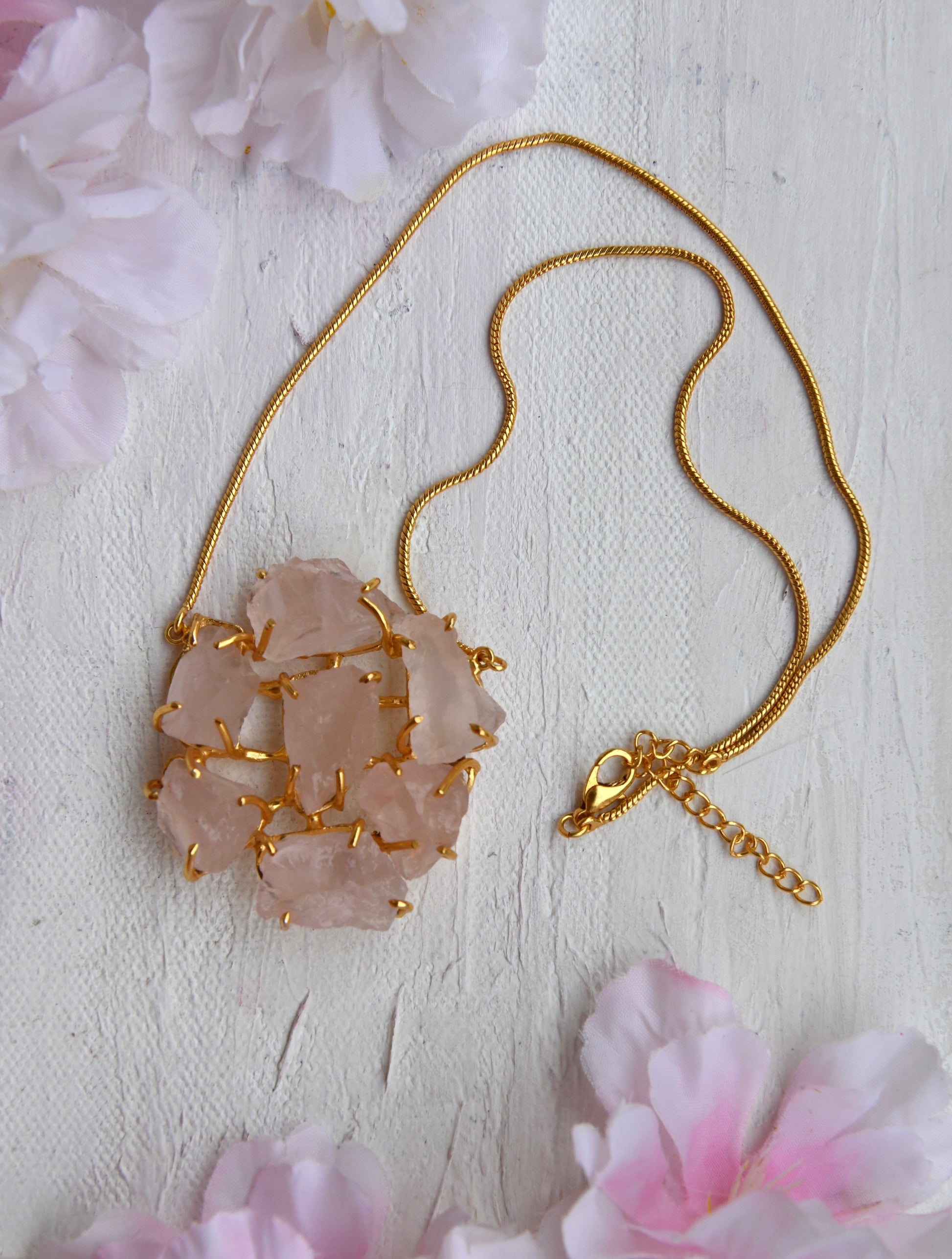 Semiprecious real uncut Rose Quartz stones studded in 22 kt gold-plated brass