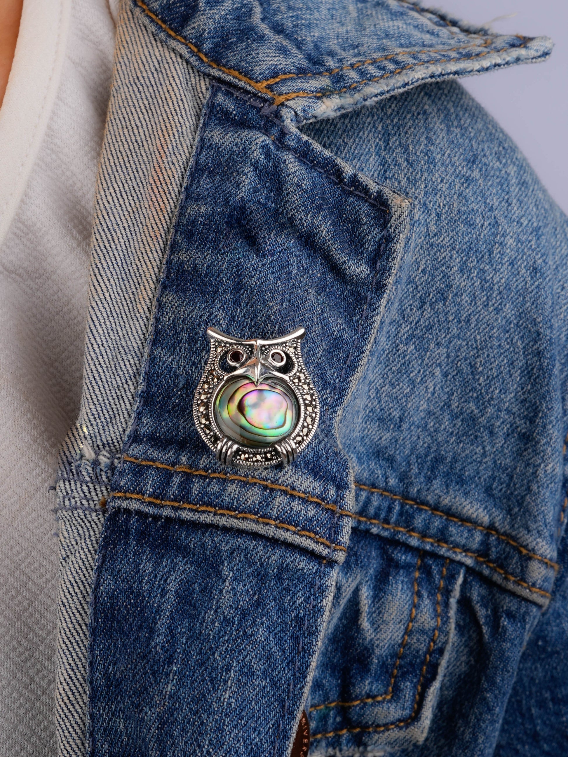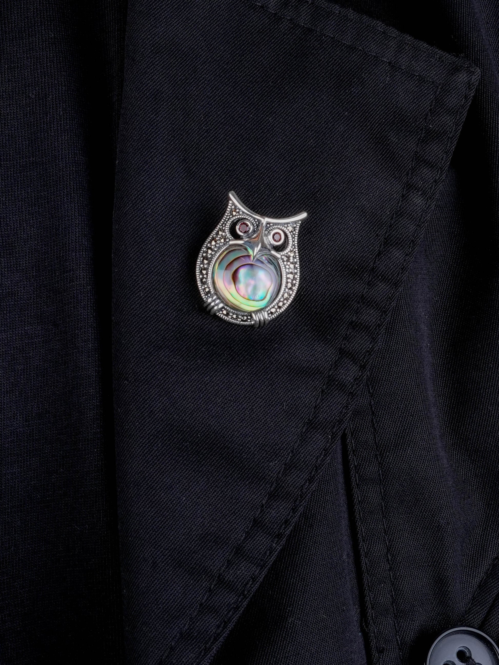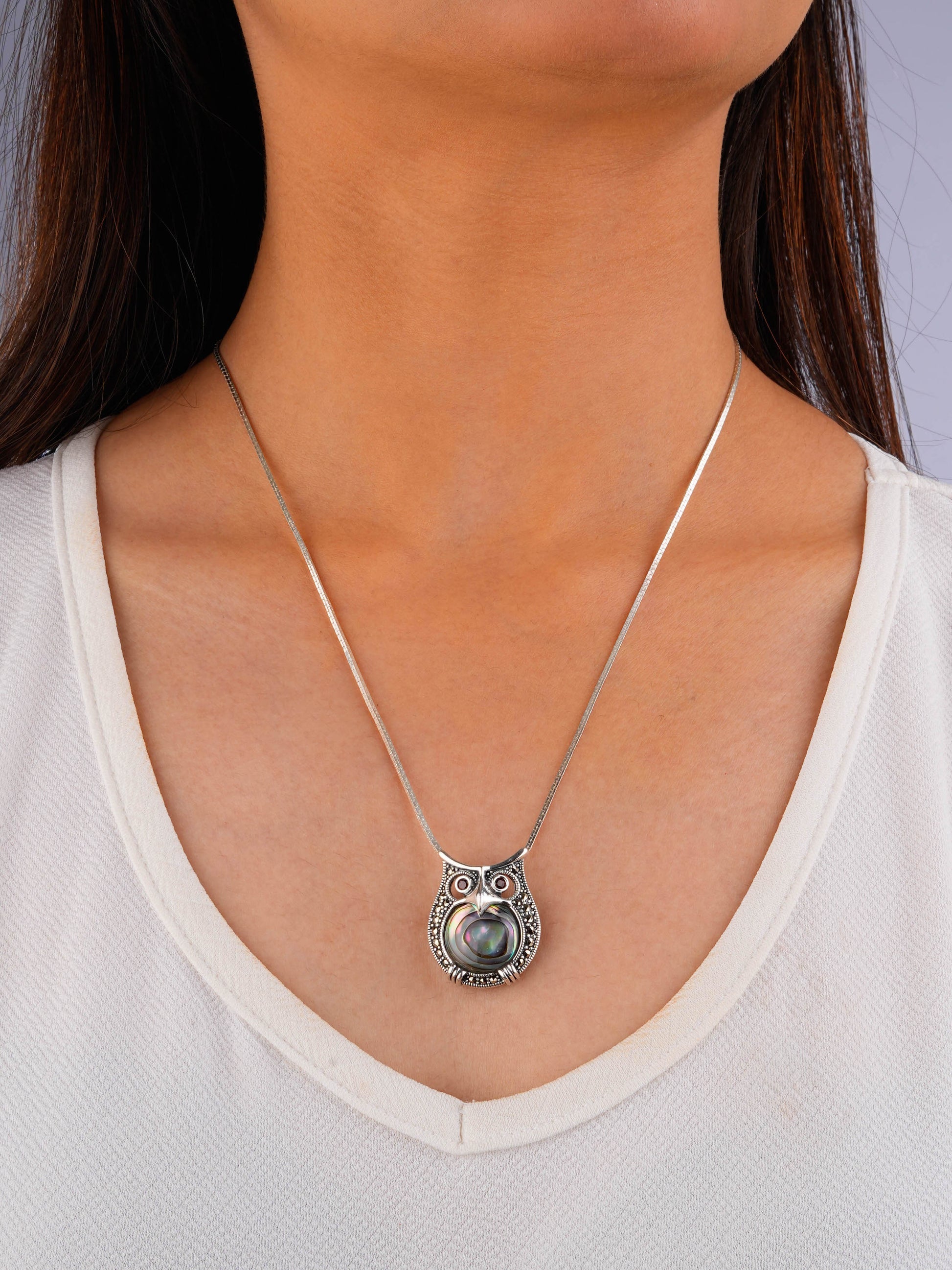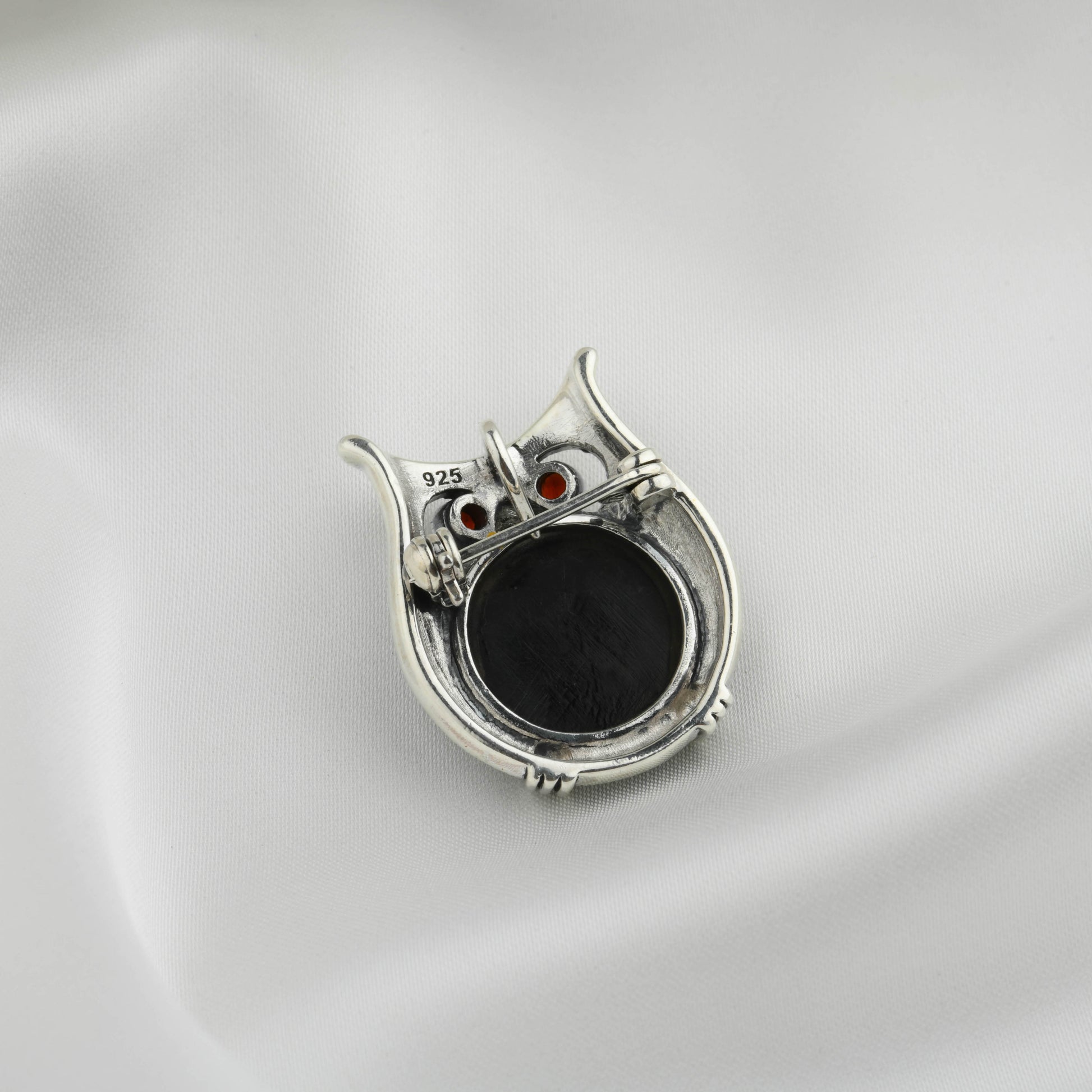 Discover the enchanting allure of this sterling silver owl. The iridescent depths of the black lip shell form the owl's body, while tiny Pyrite mineral add a vintage shimmer to its feathers. The captivating red garnet eyes bring a focal point of vibrant color. Wear it as a distinctive brooch or a striking pendant – a symbol of wisdom and captivating style.