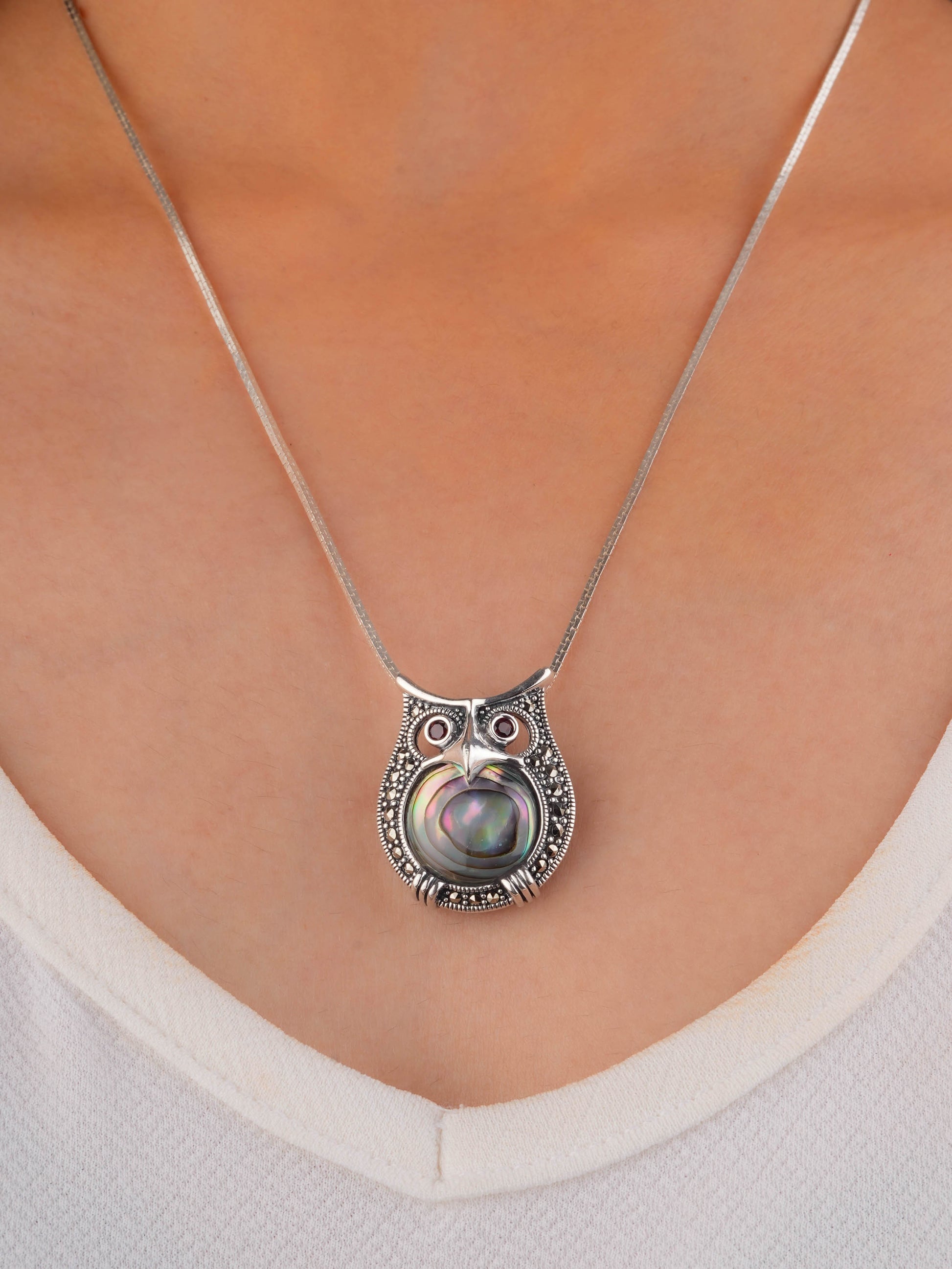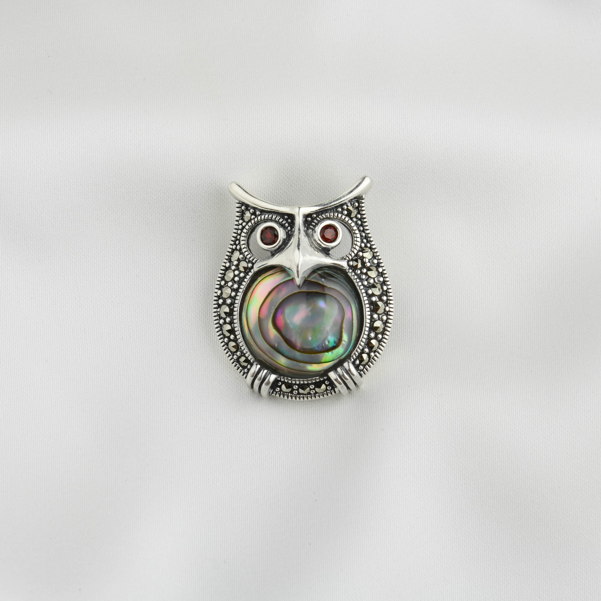 Garnet-Eyed Marcasite Owl Shell Brooch Cum Pendant