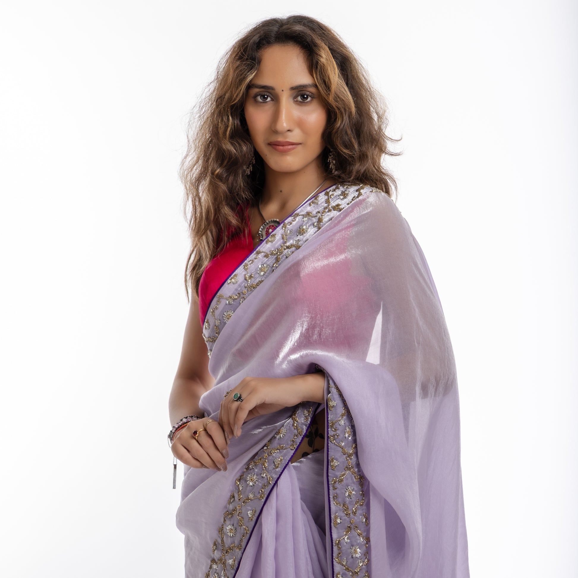 Shiny Pure Fendi Silk, Lavender Colour, Handwork Sequinned