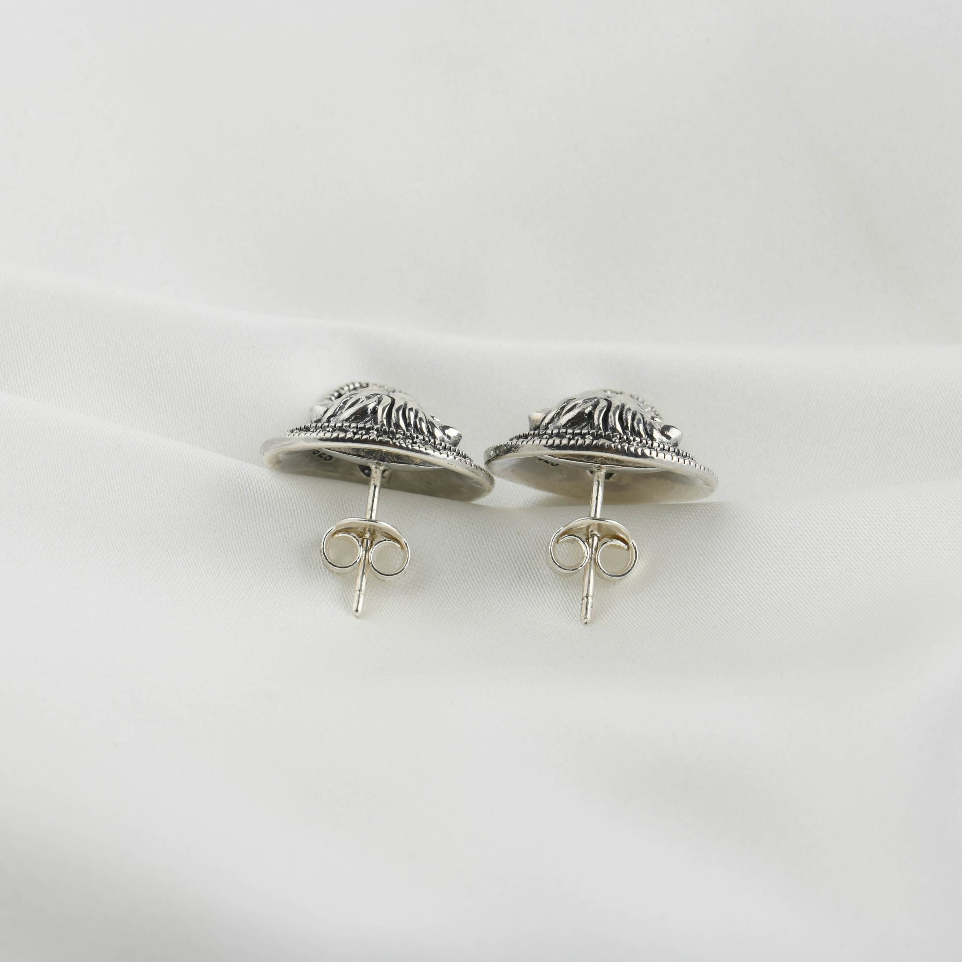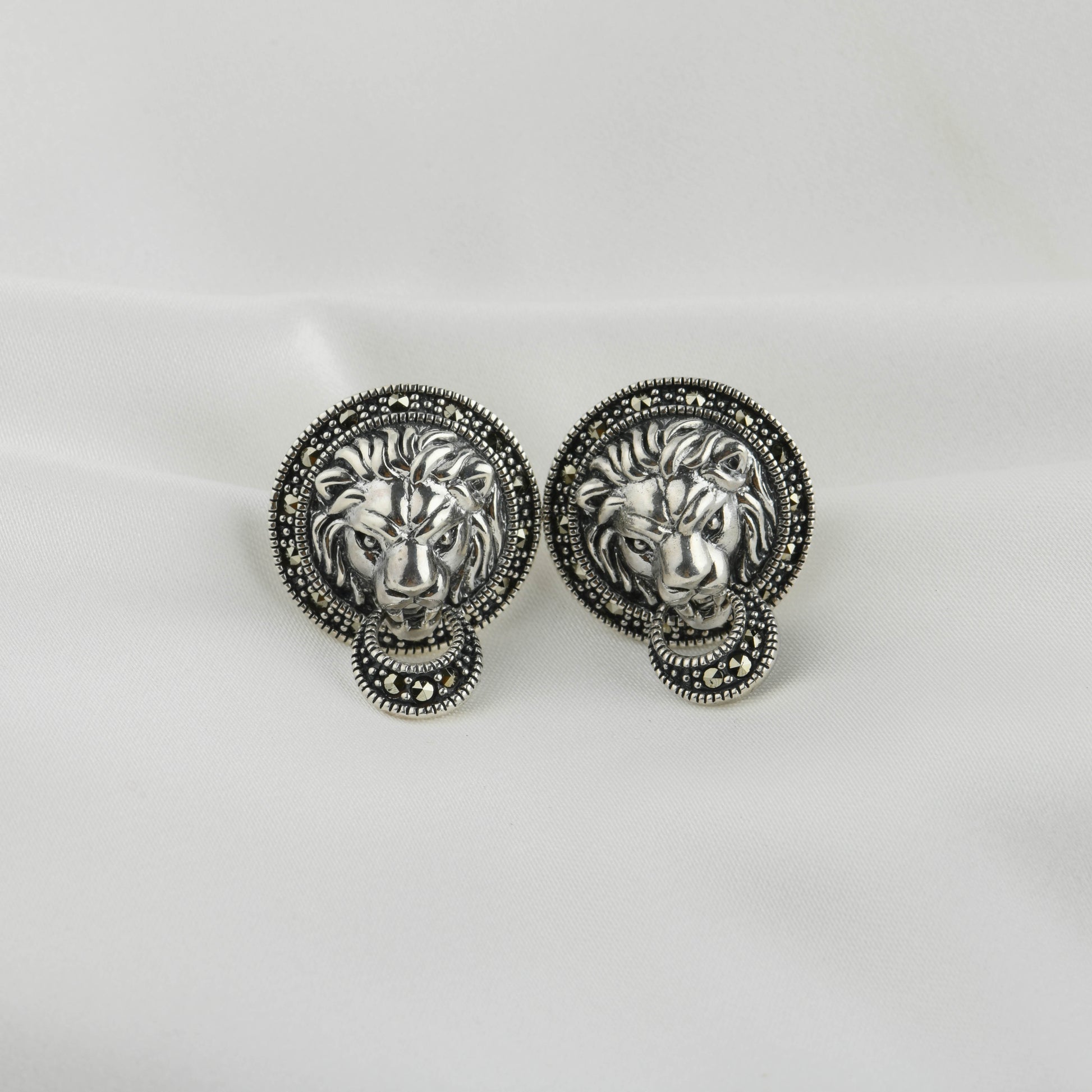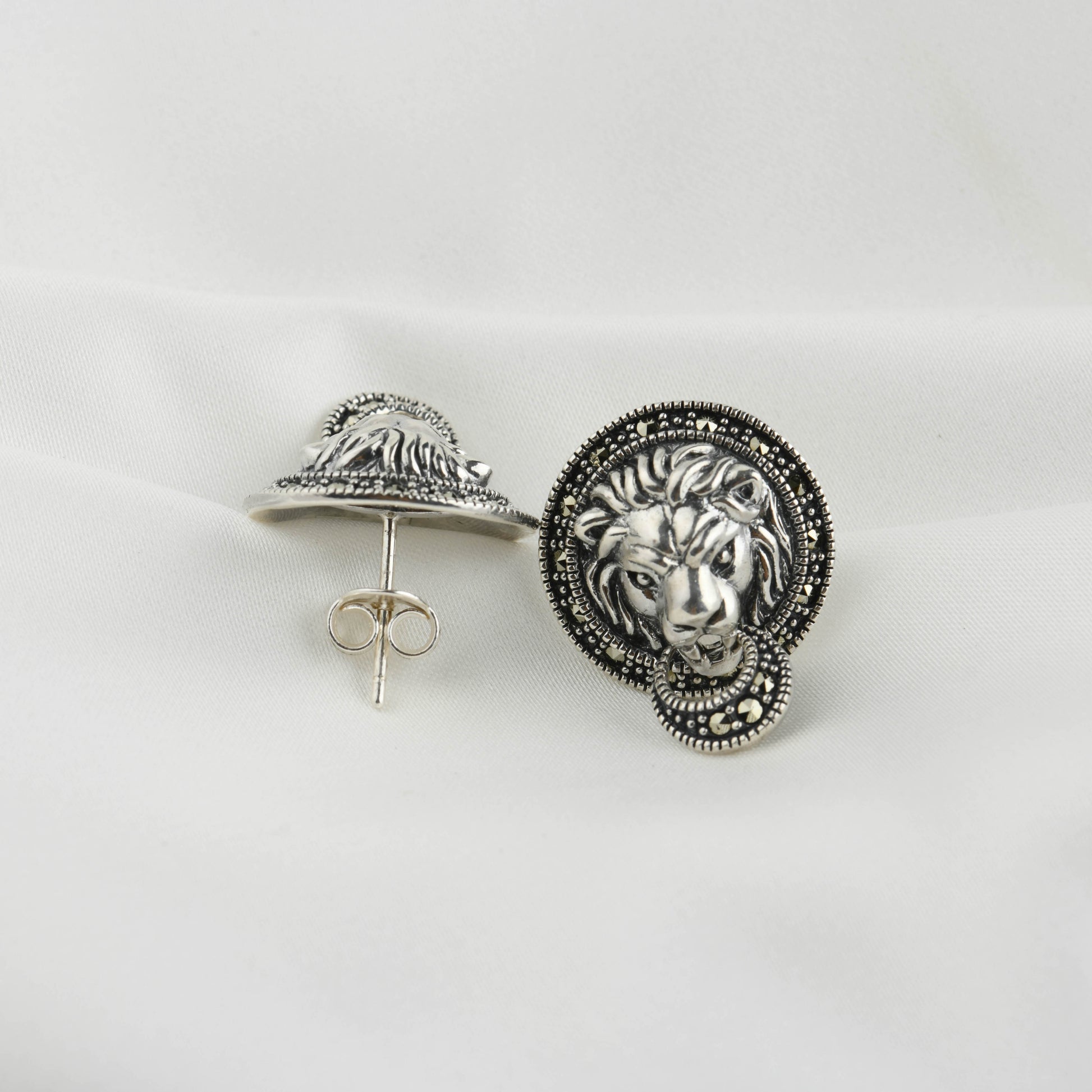 Marcasite Lion Studs: Roar with Vintage Style. Unleash your inner strength with these striking lion head stud earrings. Crafted in sterling silver, each regal lion is intricately detailed and surrounded by a halo of sparkling marcasite stones. These bold studs exude a vintage charm with a powerful presence, perfect for adding a touch of fierce elegance to any look.
