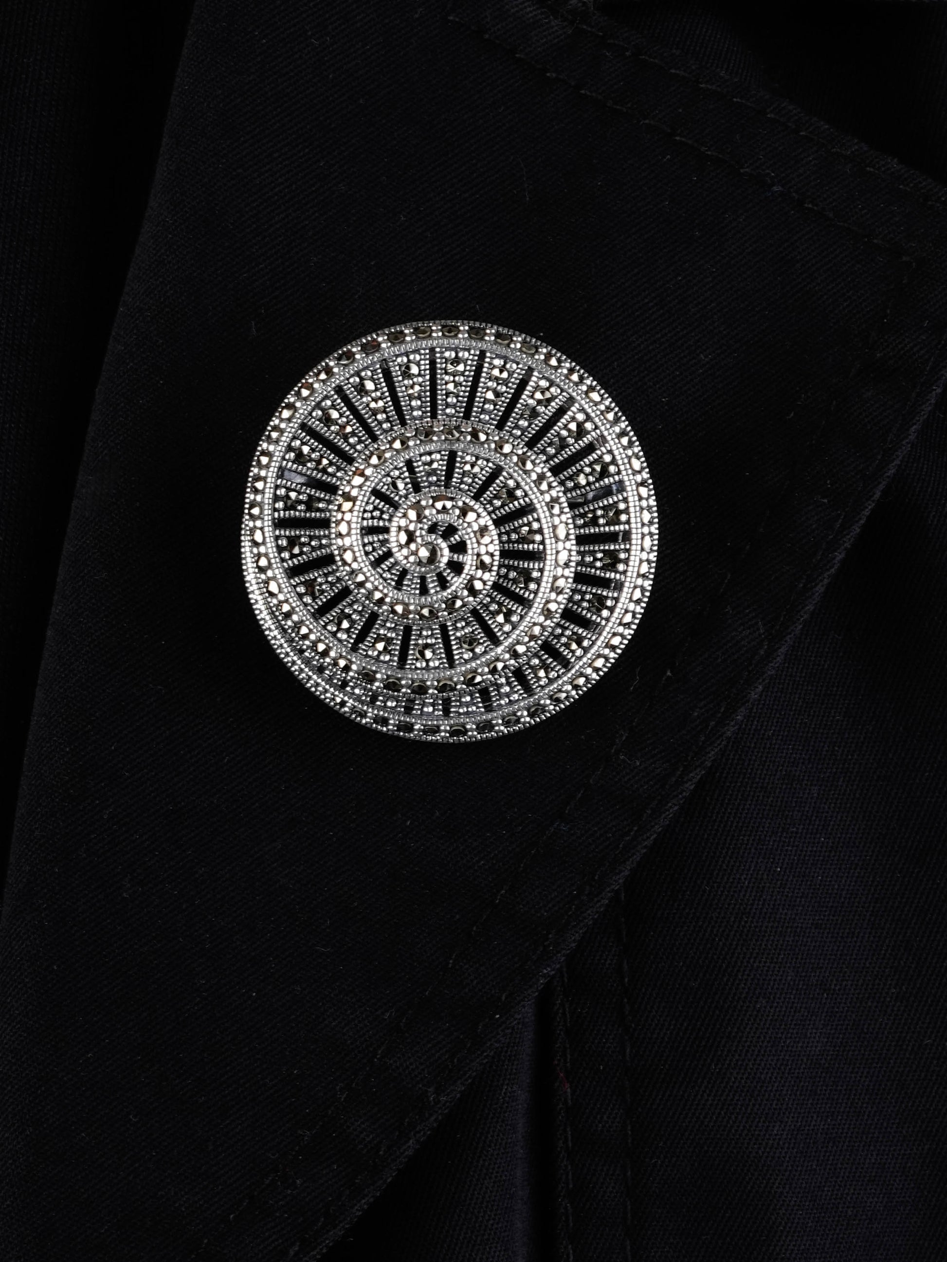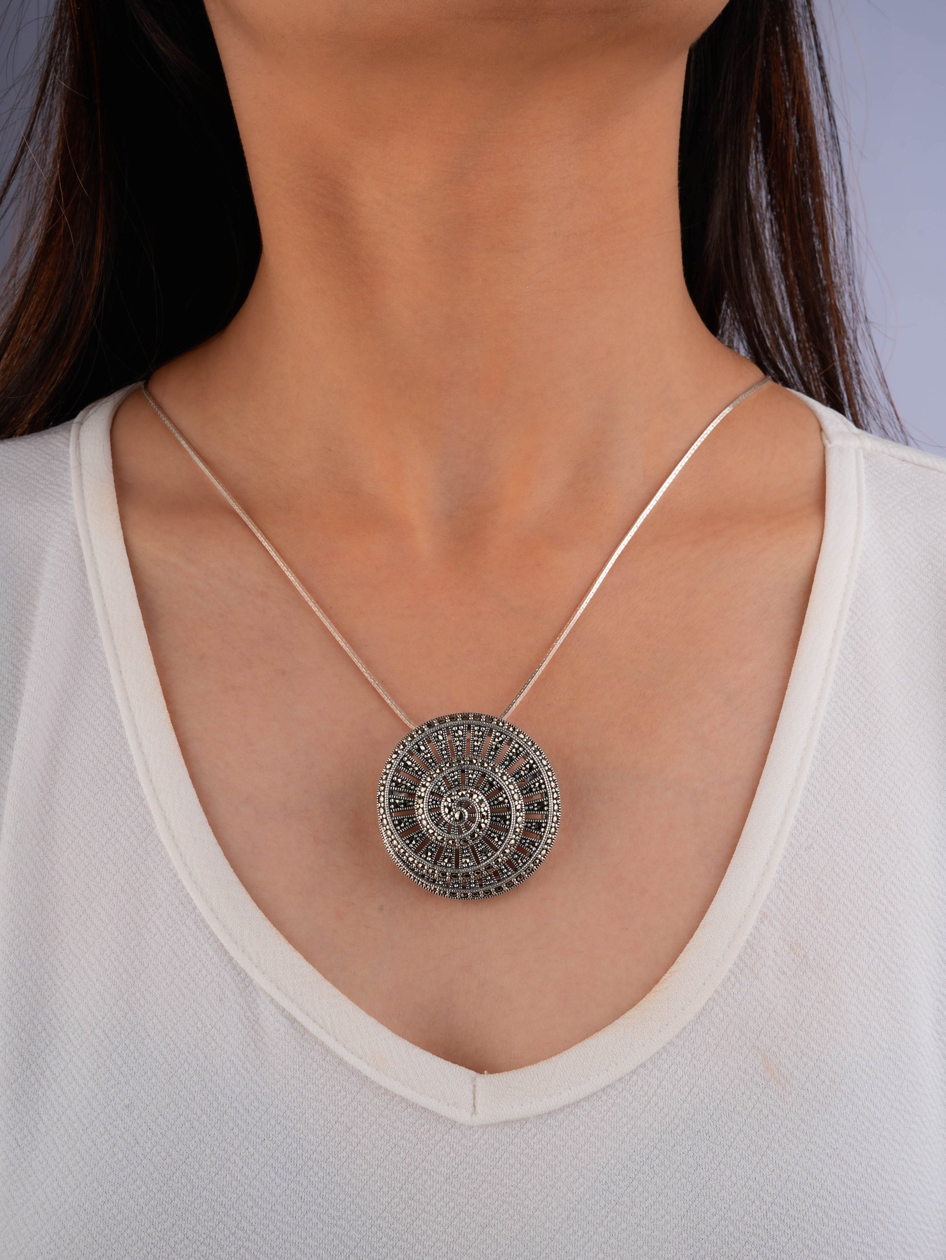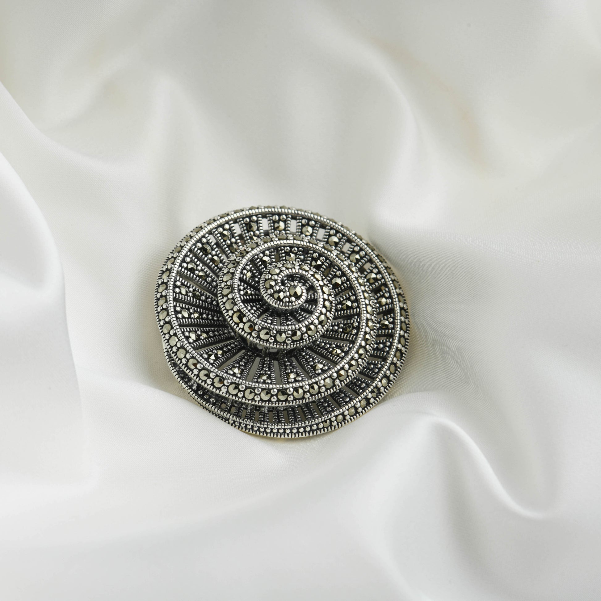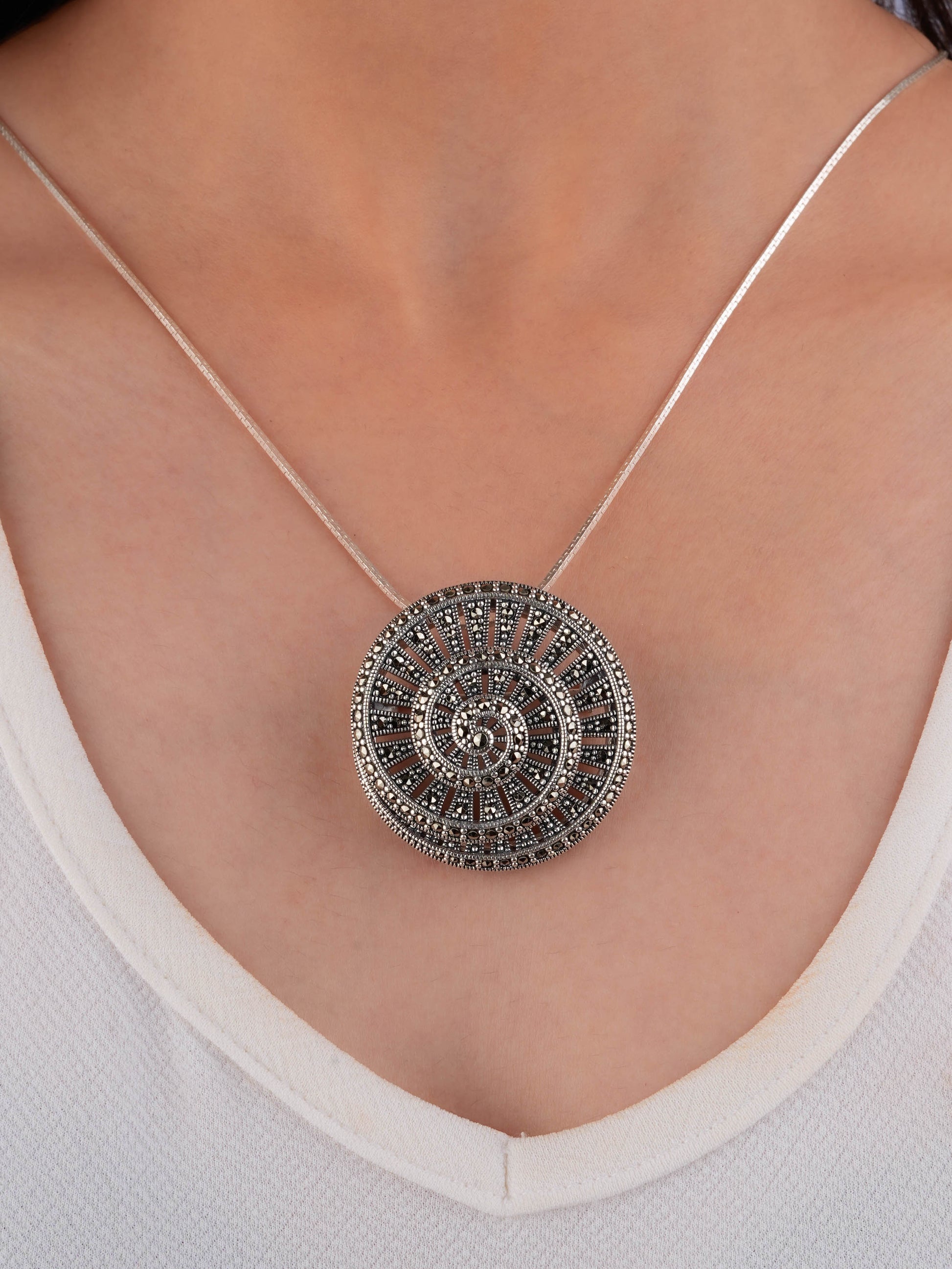 Crafted in sterling silver, this necklace showcases a mesmerizing spiral design created with meticulously set marcasite stones.