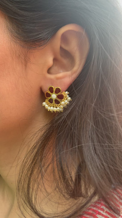 Accentuate your look with these stunning Mogra Studs, crafted with intricate meenakari for a royal polish. Perfect for any occasion, the Burgundy hue will make a beautiful statement. Get ready to shine!