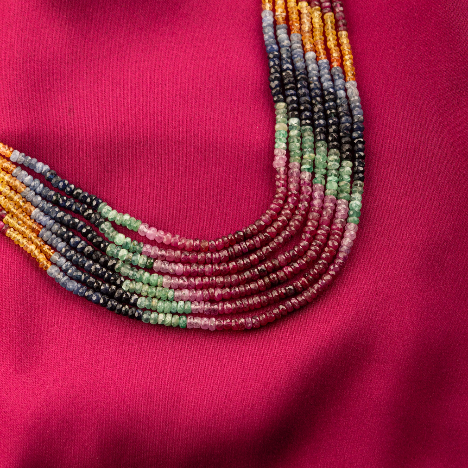 This opulent piece features seven breathtaking layers of genuine gemstones, including fiery Ruby, verdant Emeralds, deep Sapphire, and brilliant Yellow Sapphire stones. Each tiny gem is meticulously and completely **hand-woven**, one by one, onto a lasting and durable thread—a testament to the patient artistry of our master craftsmen. This metal-free technique results in a surprisingly supple and comfortable drape, making it an ideal and memorable gift.