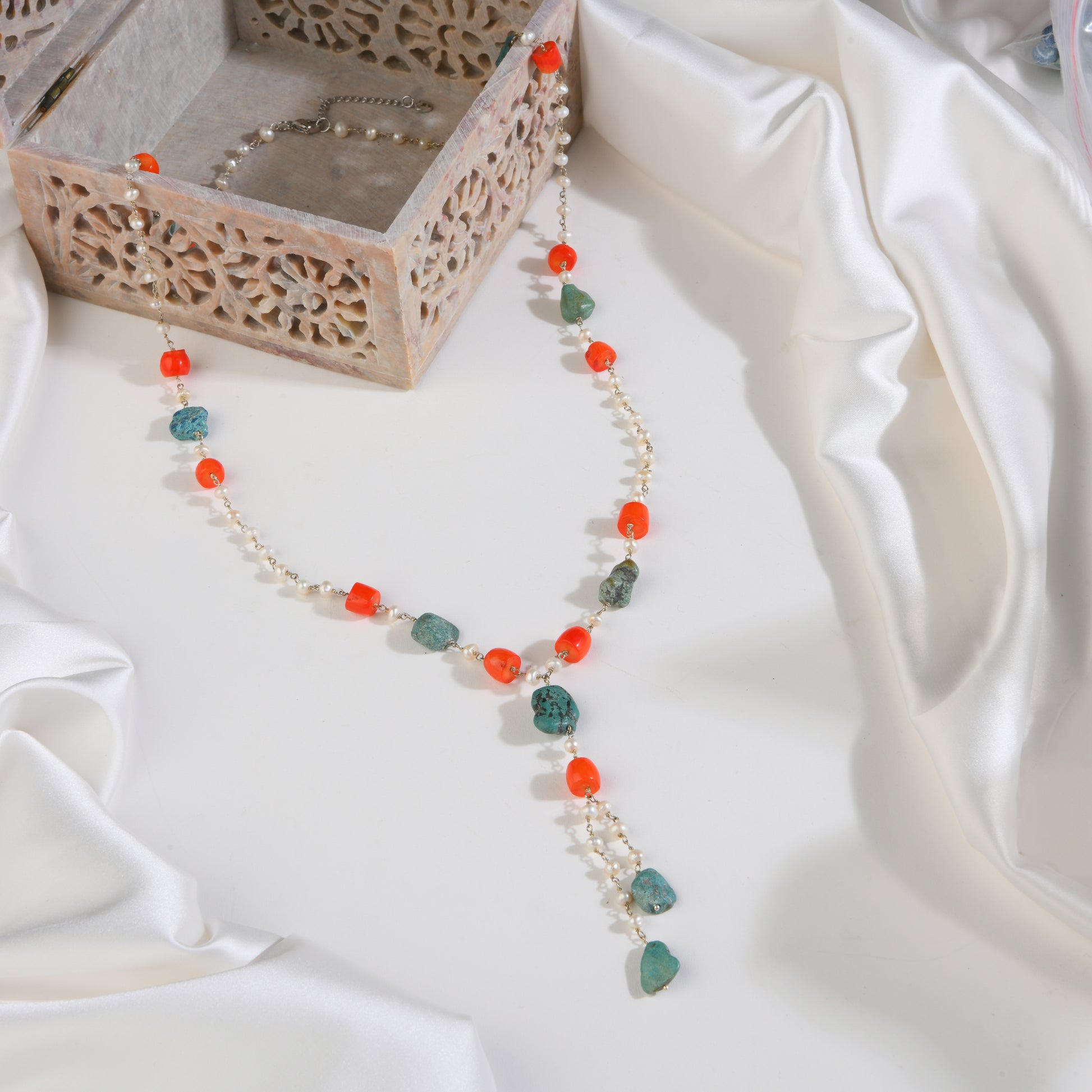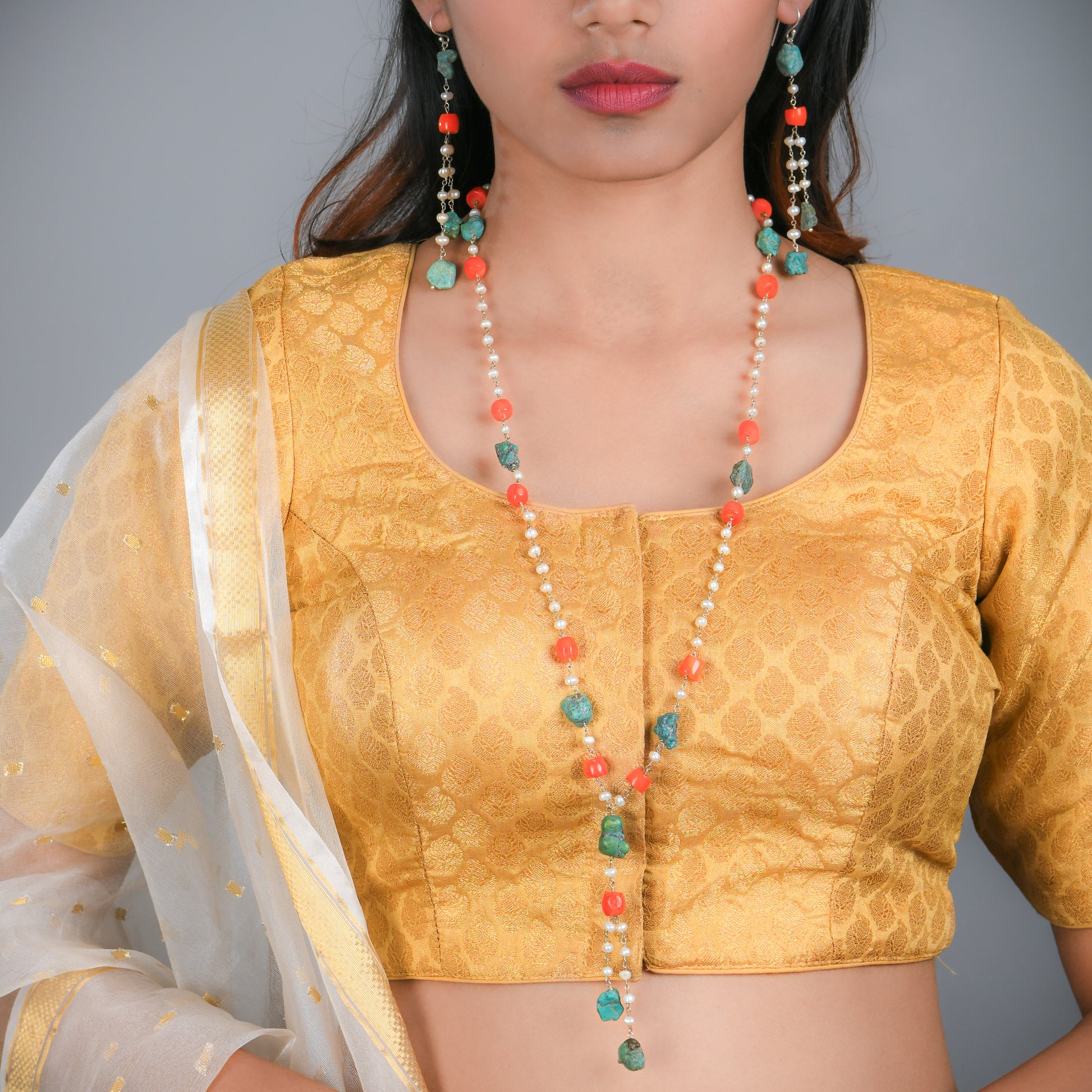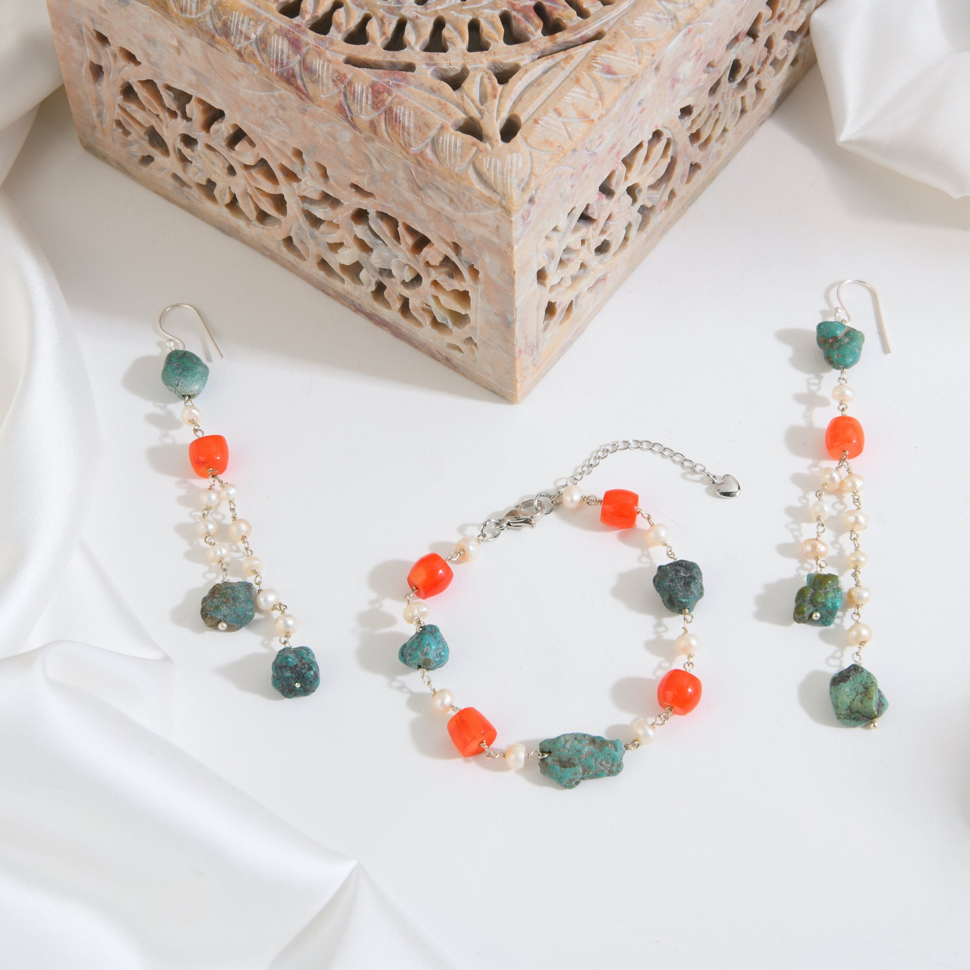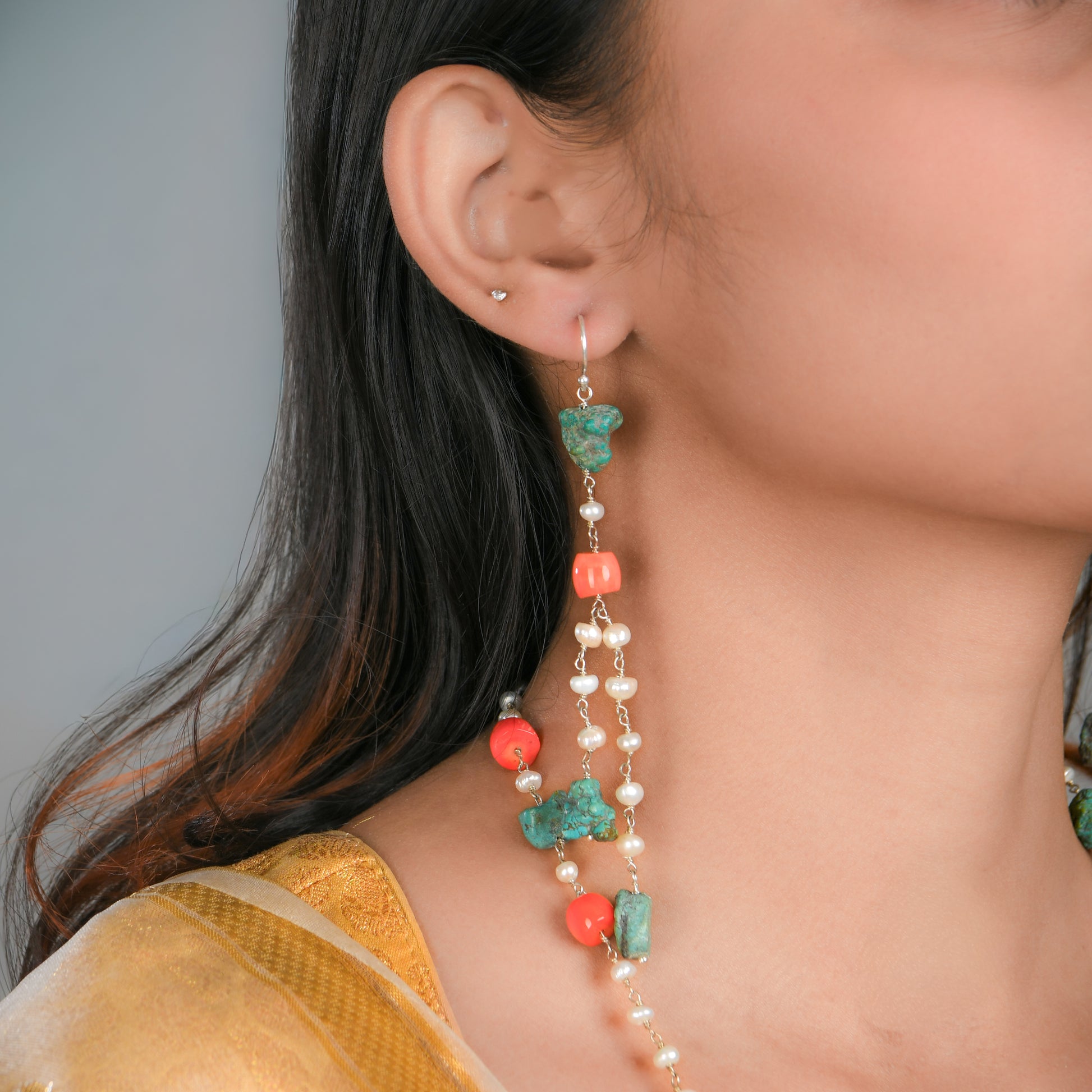 A graceful pairing of turquoise, coral, and freshwater pearls, this necklace and earrings set celebrates free-spirited elegance. Handcrafted to bloom with colour and movement, it is designed for the modern nomad who carries stories in her style.