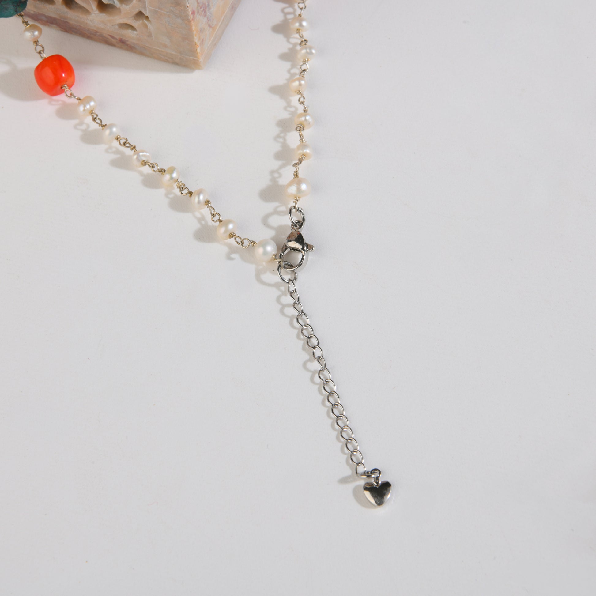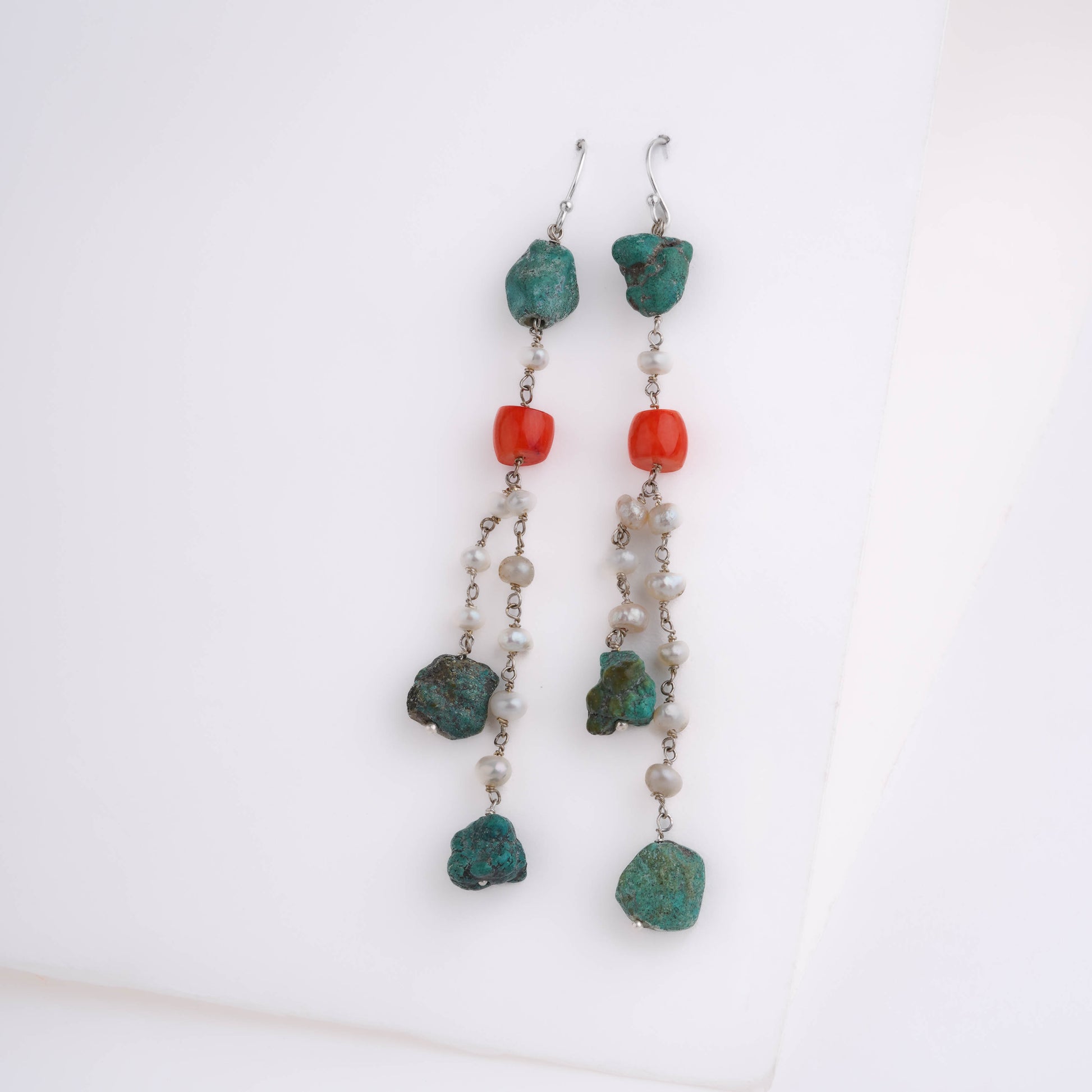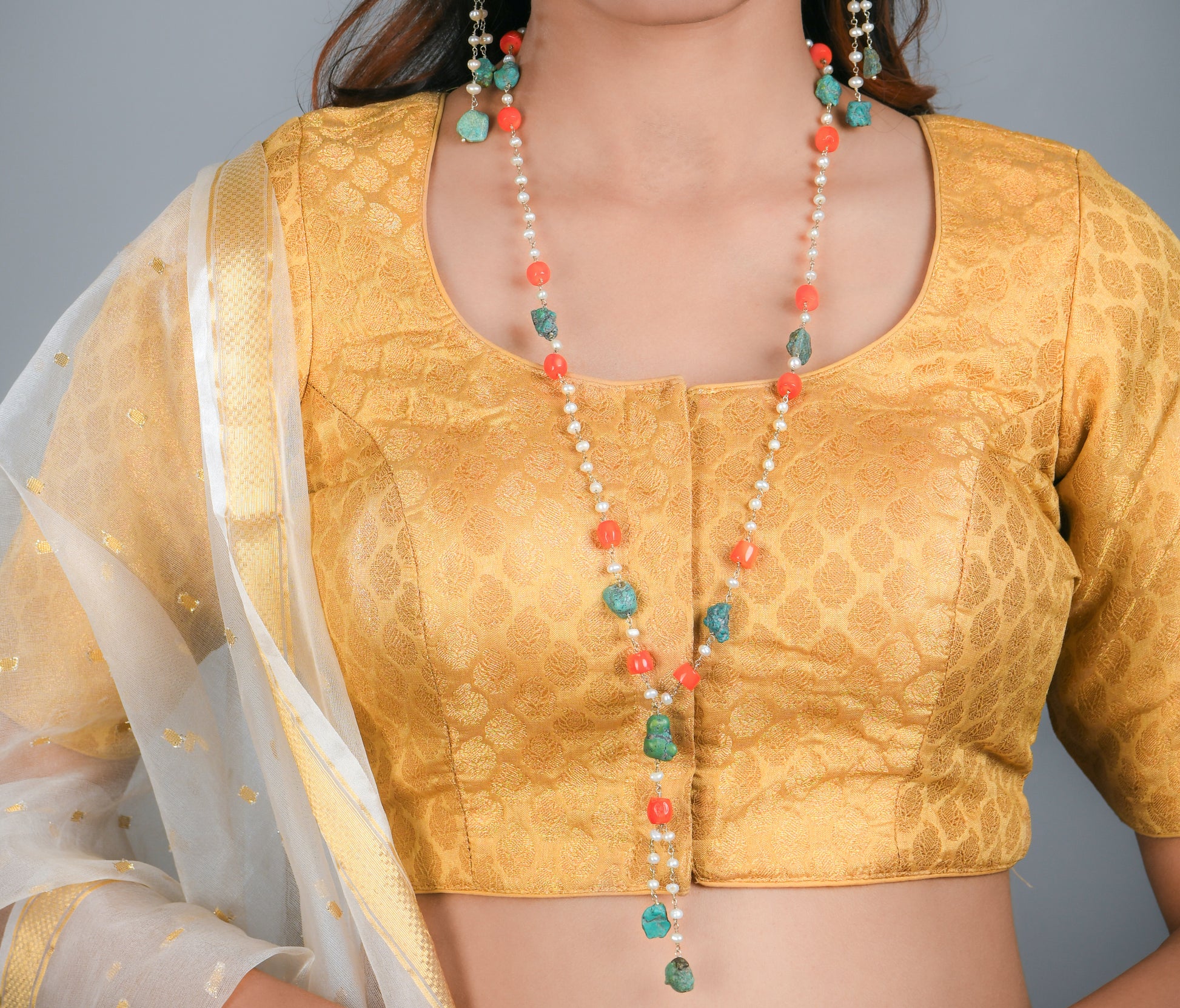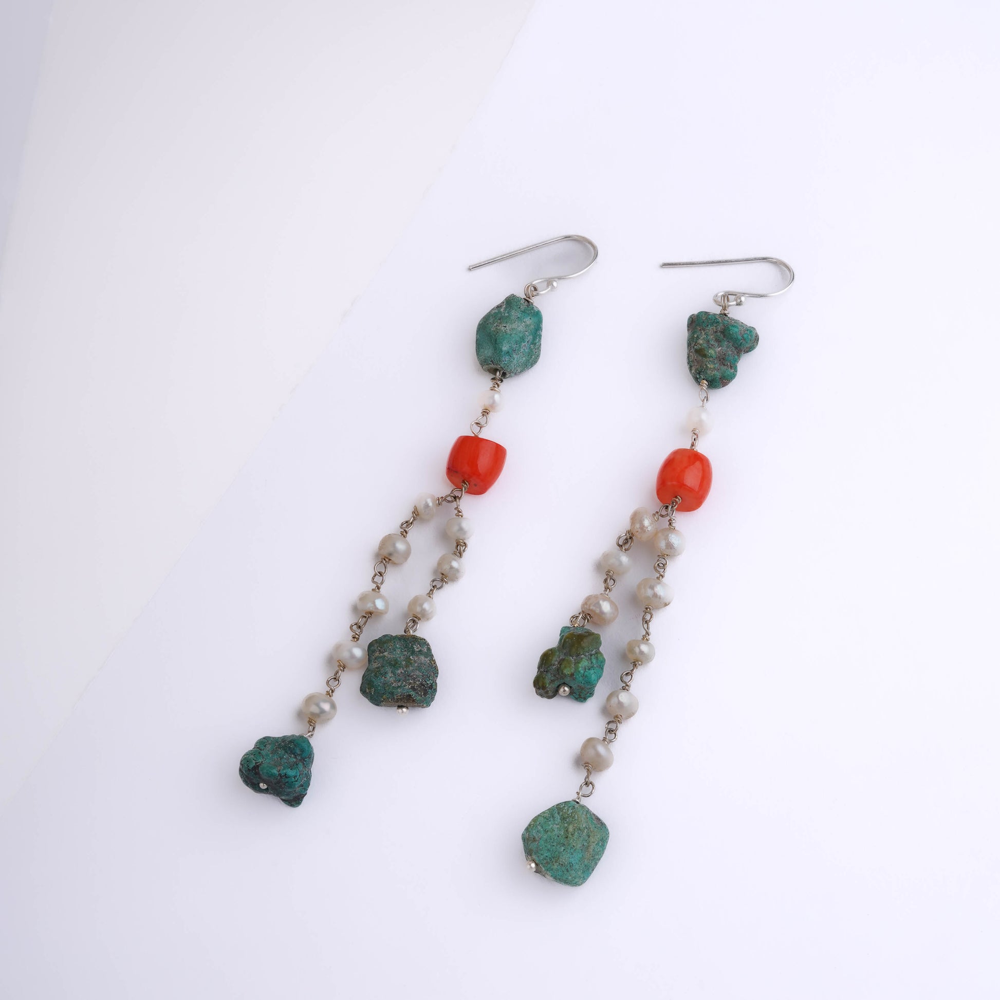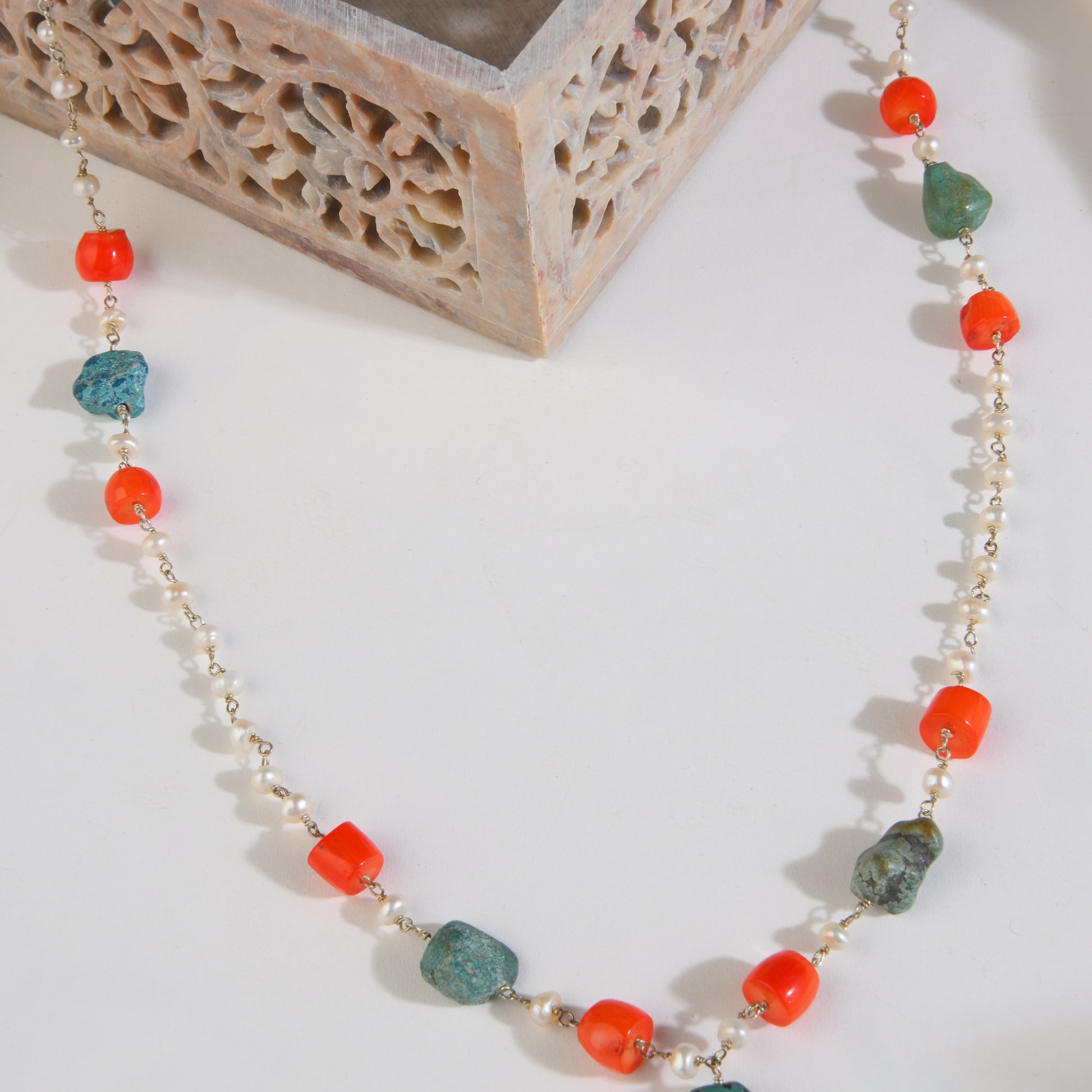 A graceful pairing of turquoise, coral, and freshwater pearls, this necklace and earrings set celebrates free-spirited elegance. Handcrafted to bloom with colour and movement, it is designed for the modern nomad who carries stories in her style.
