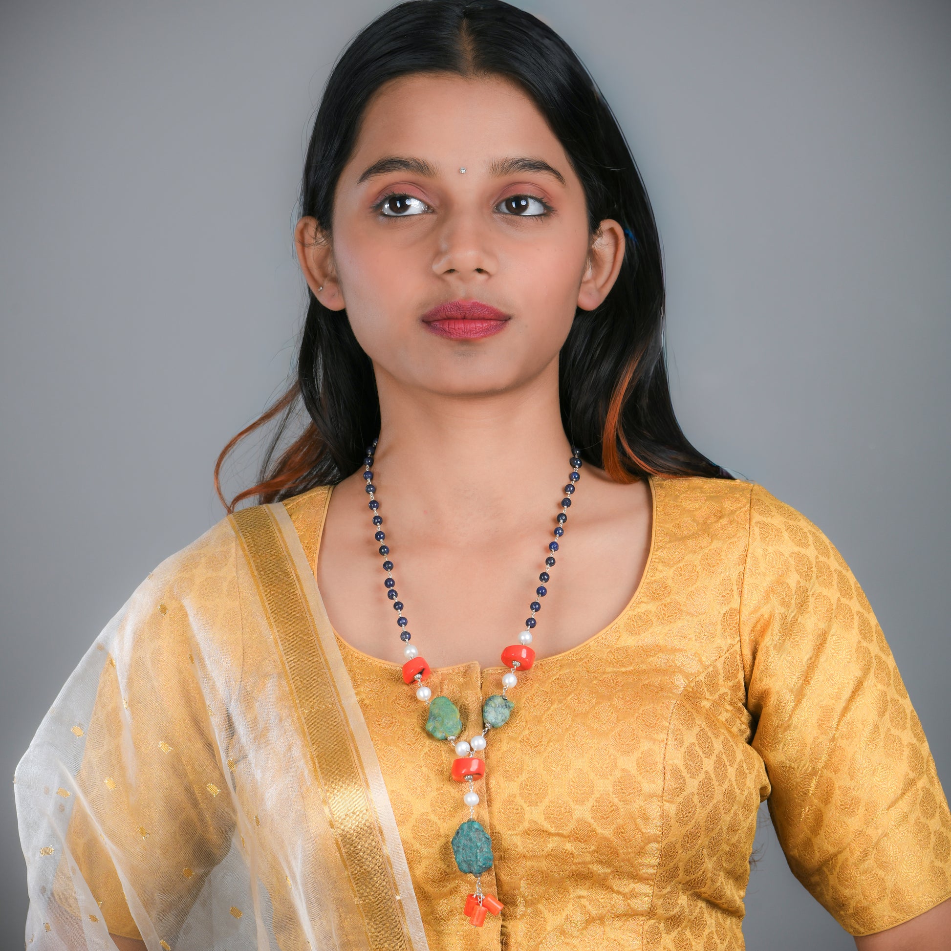 A soulful blend of turquoise, coral, freshwater pearls, lapis lazuli, and silver, this necklace celebrates the spirit of travel and free expression. Handcrafted for the modern wanderer, it brings together earthy textures and vibrant hues in a bold yet elegant statement.