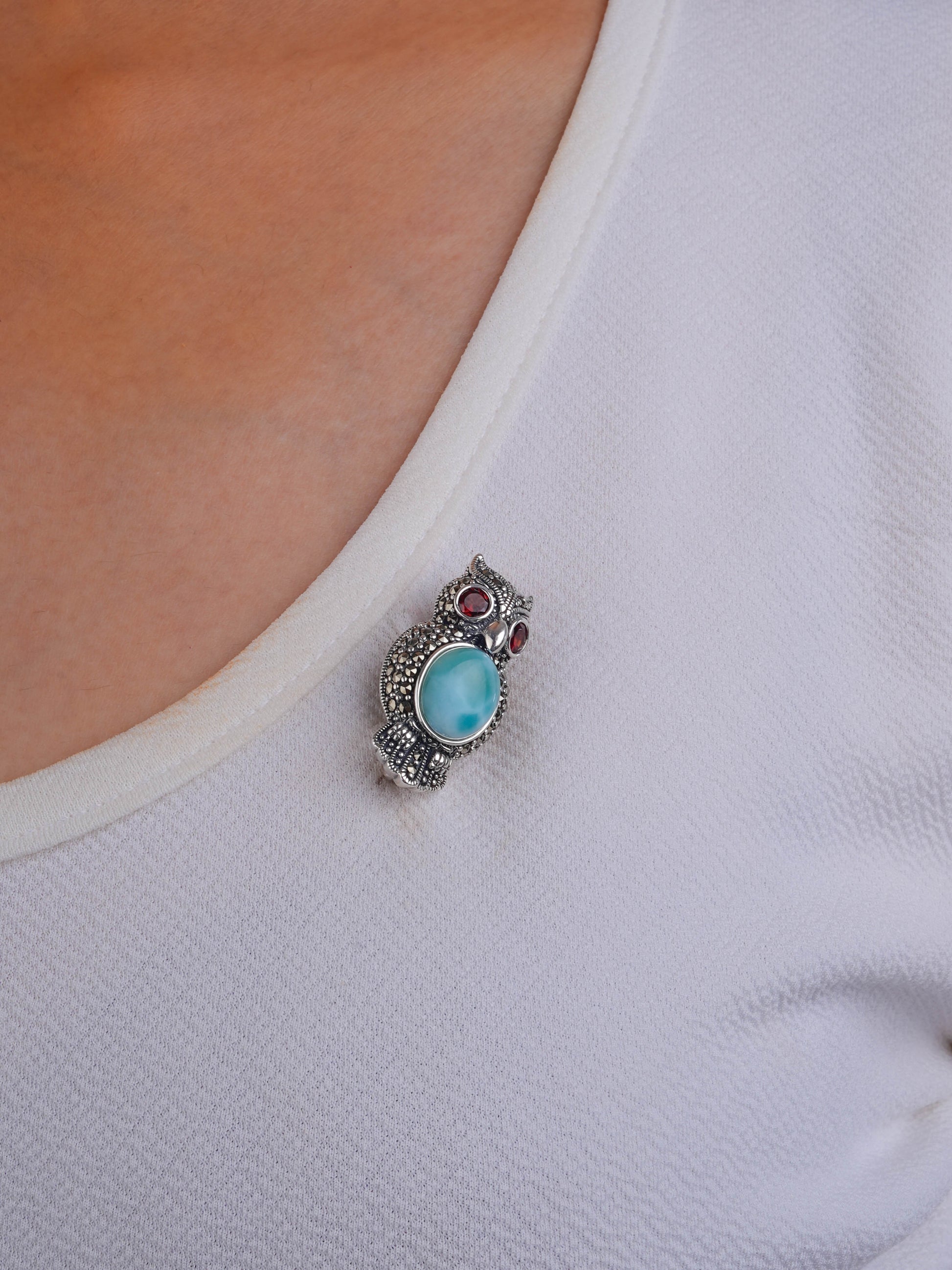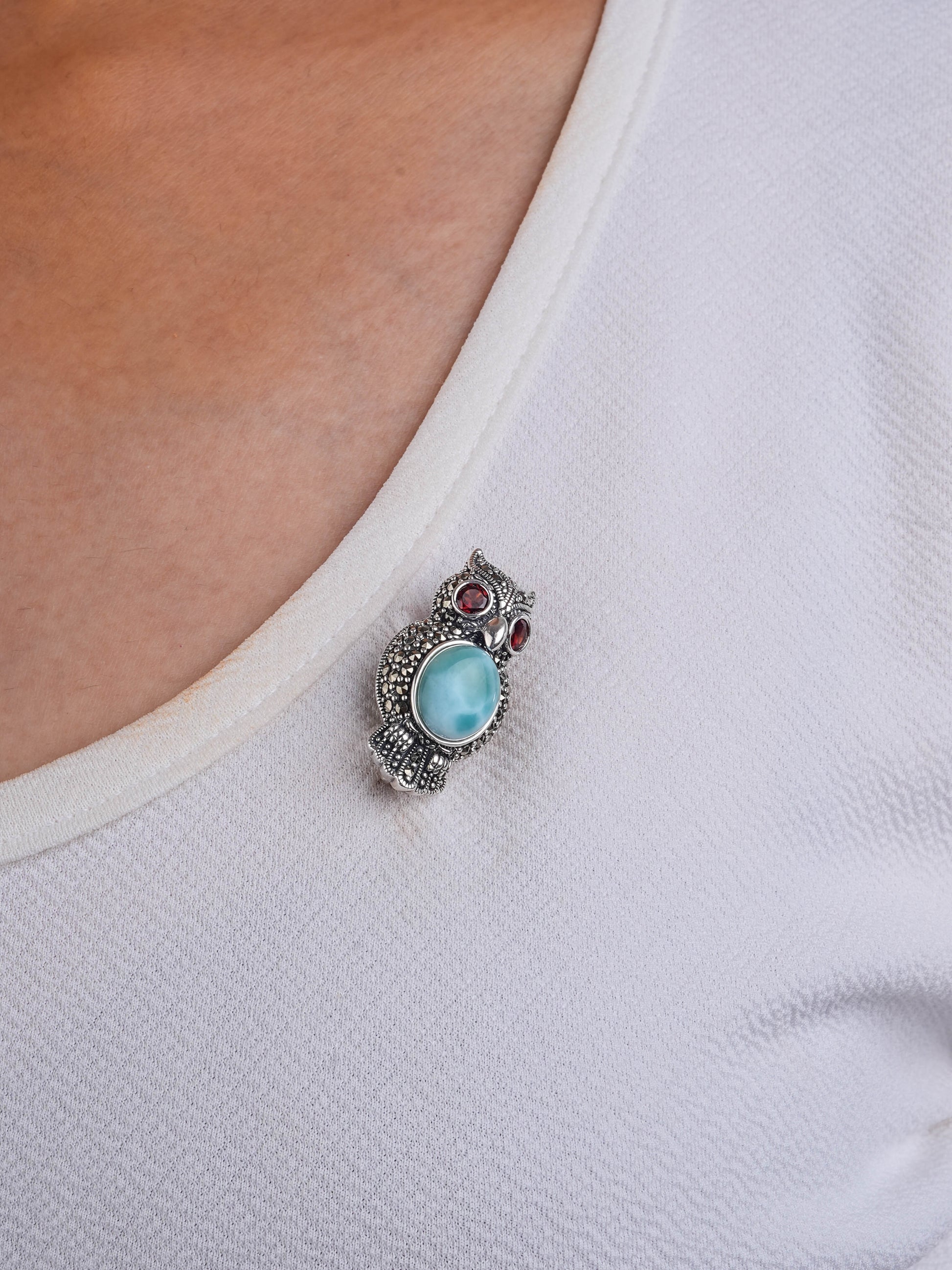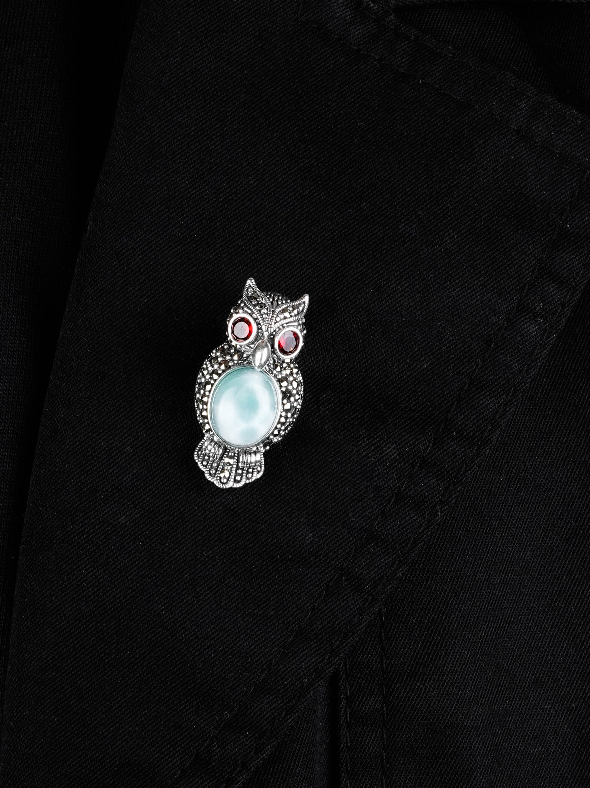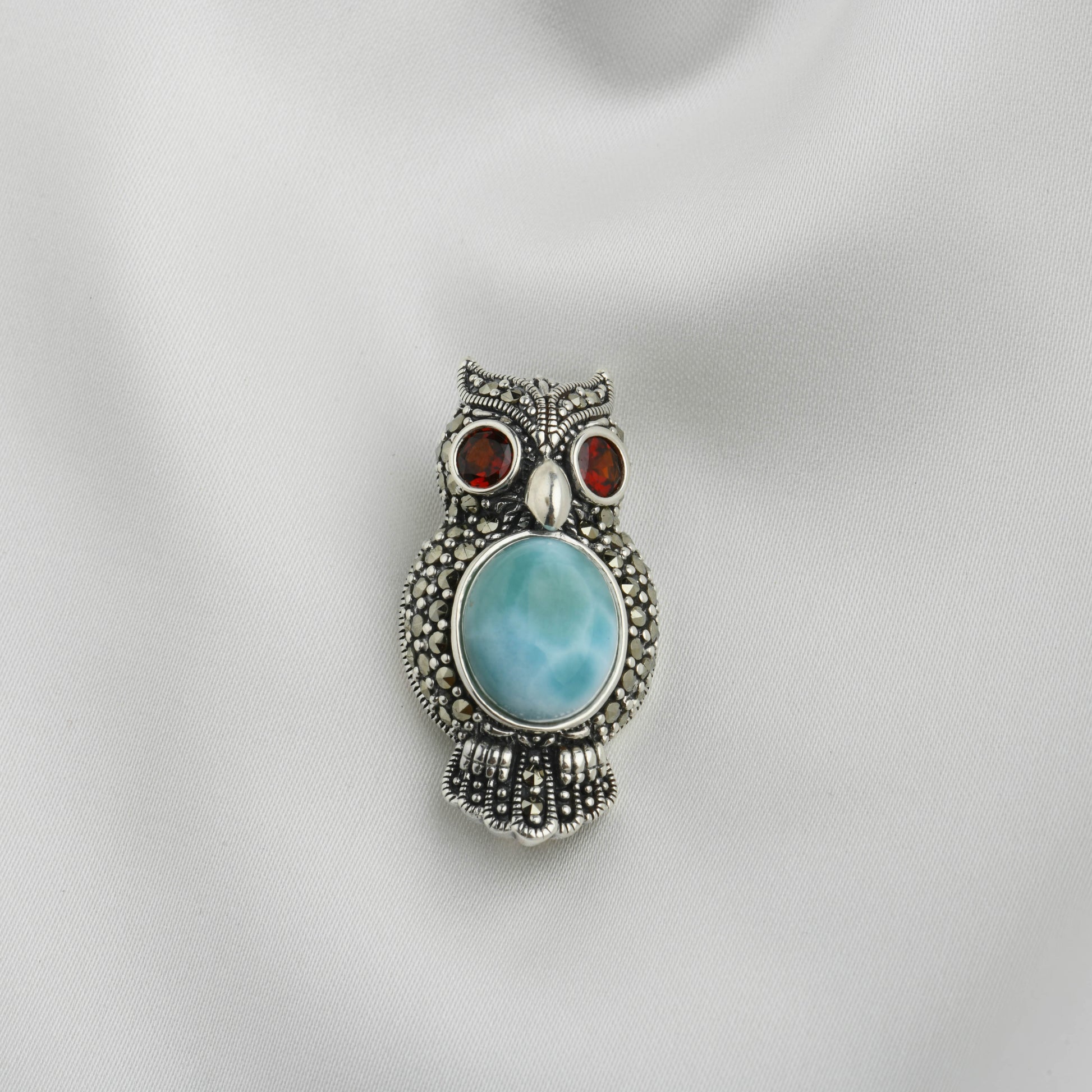 Dive into a world of elegance with the Ocean Heart Owl: Silver Marcasite Pendant. This captivating piece features a stunning owl adorned with intricate marcasite detailing and a mesmerizing light blue larimar stone at its center, reminiscent of serene ocean waters. The red garnet eyes add a striking contrast, bringing a sense of life and charm to this enchanting design.
