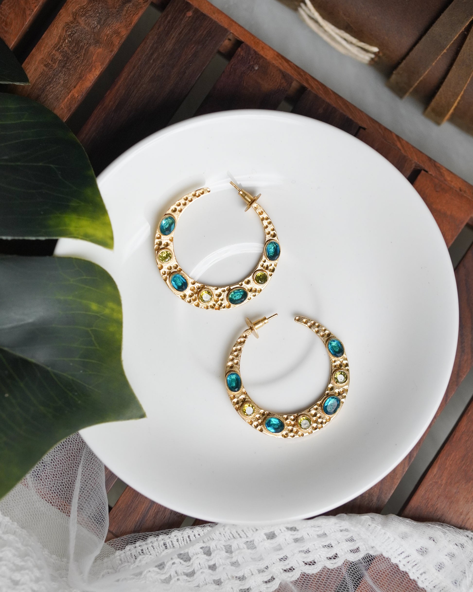 Feel the sparkle of an enchanted night sky with the Paradise on Moon Earrings. These beautiful gold-plated earrings feature a captivating mix of stones that will add a heavenly touch to any look. Make your style shine with these glamorous earrings!