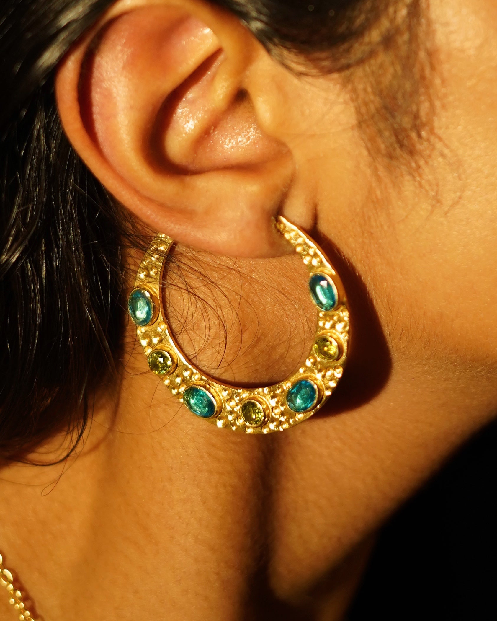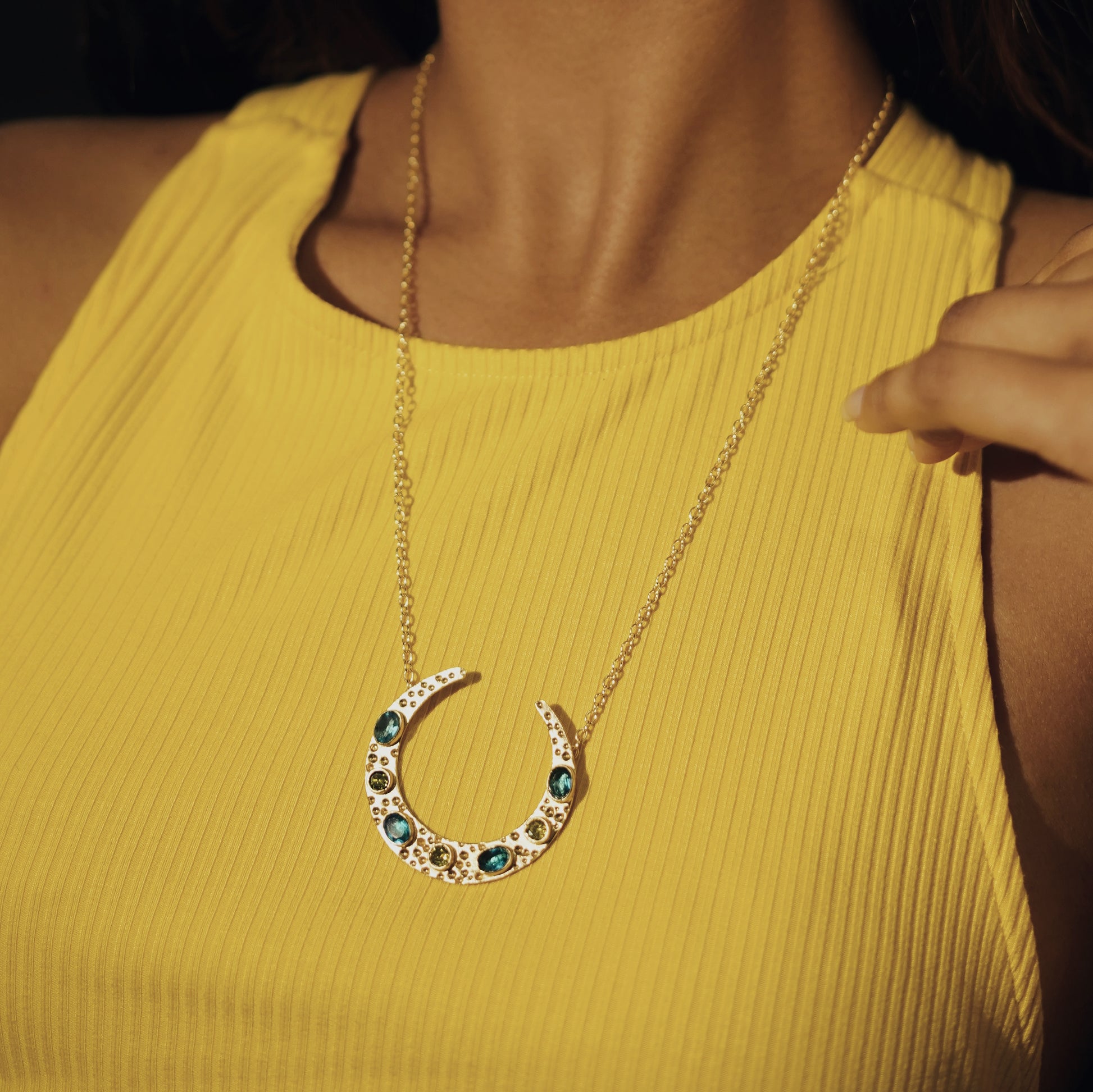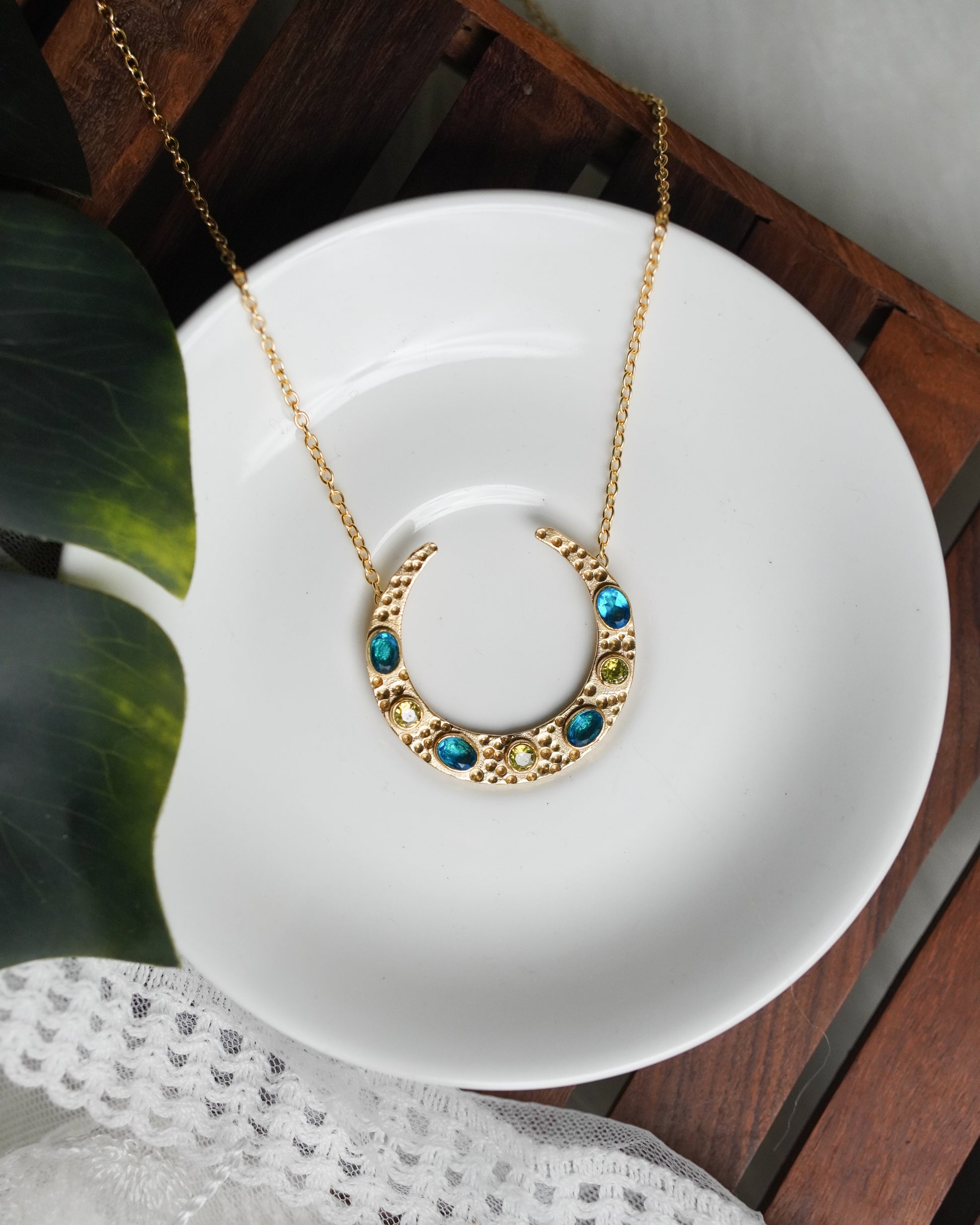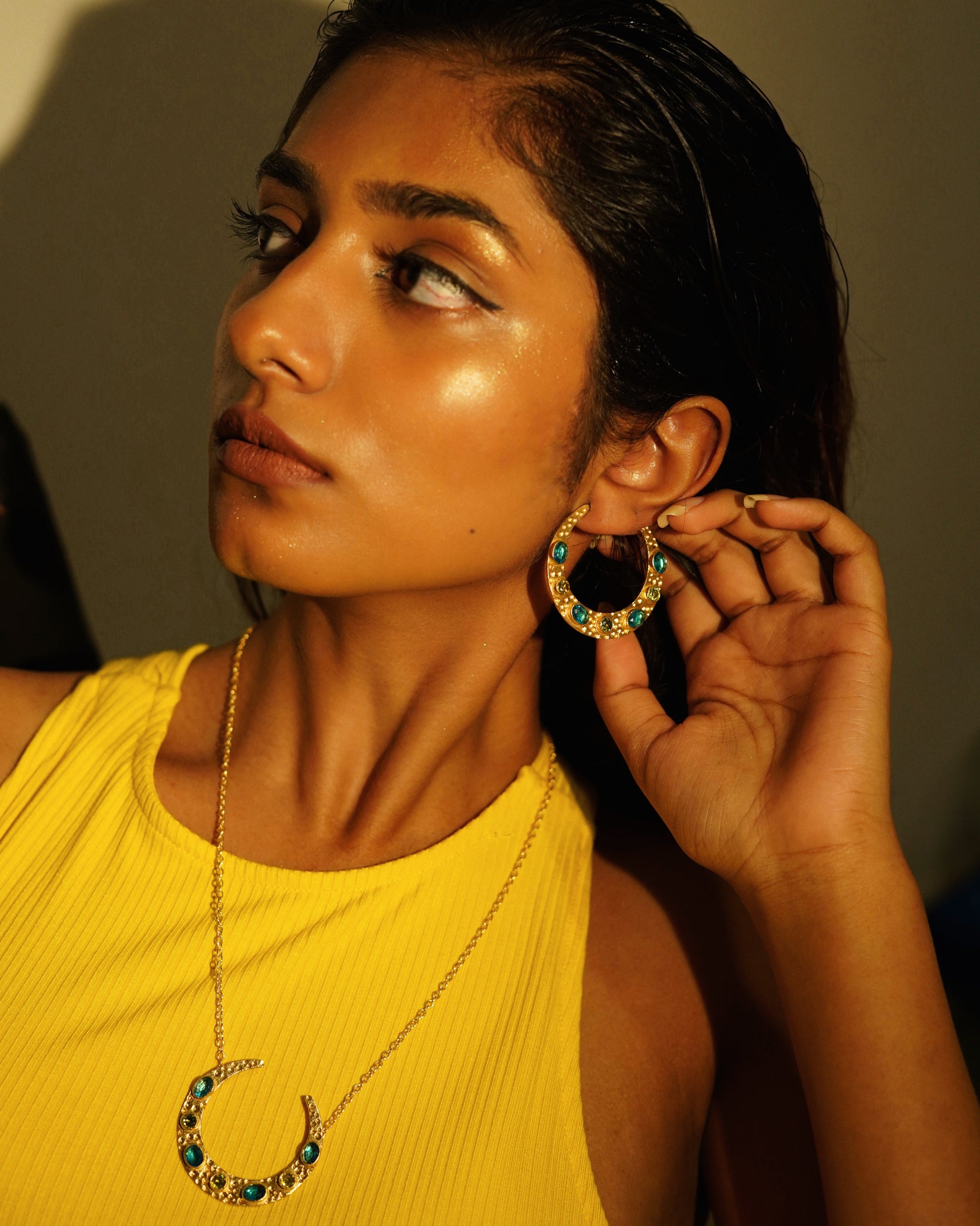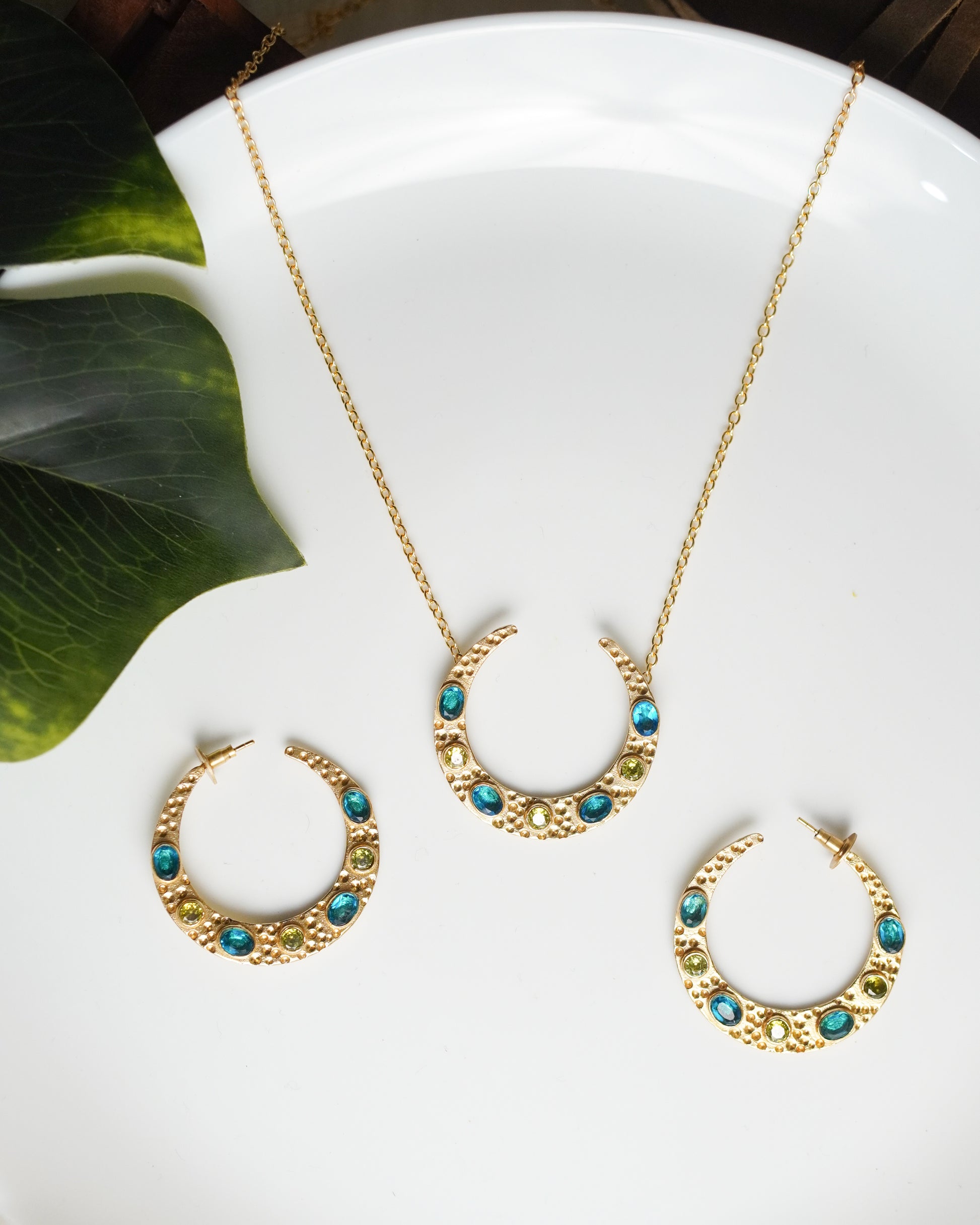 Capture the beauty of the night sky with this stunning gold plated Paradise on Moon Set. Decorated with shimmering stones, this set adds a hint of celestial sparkle to any occasion. The perfect way to add a touch of luxury to your look.