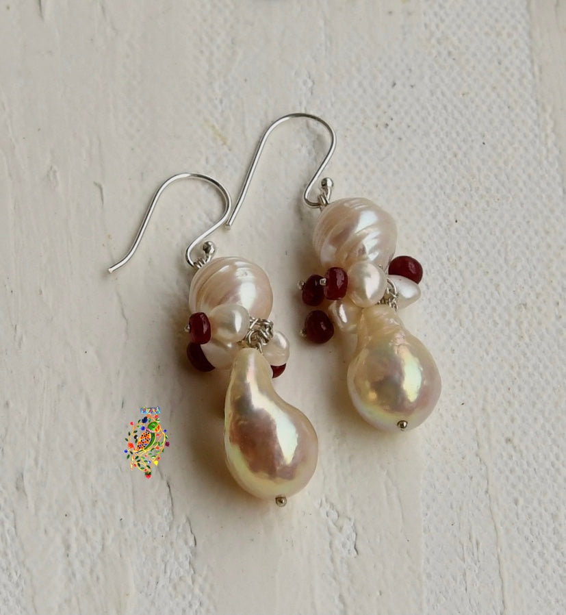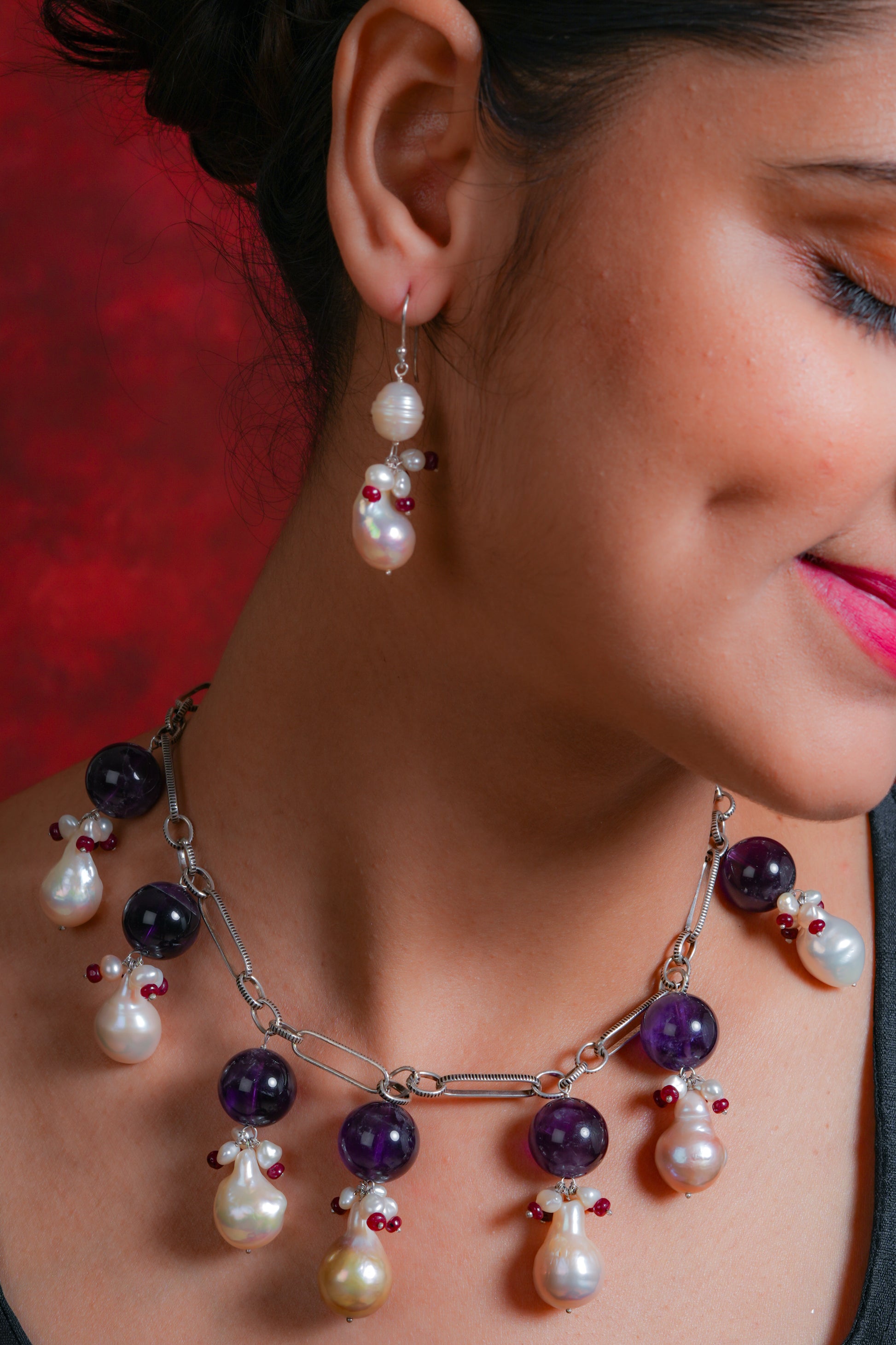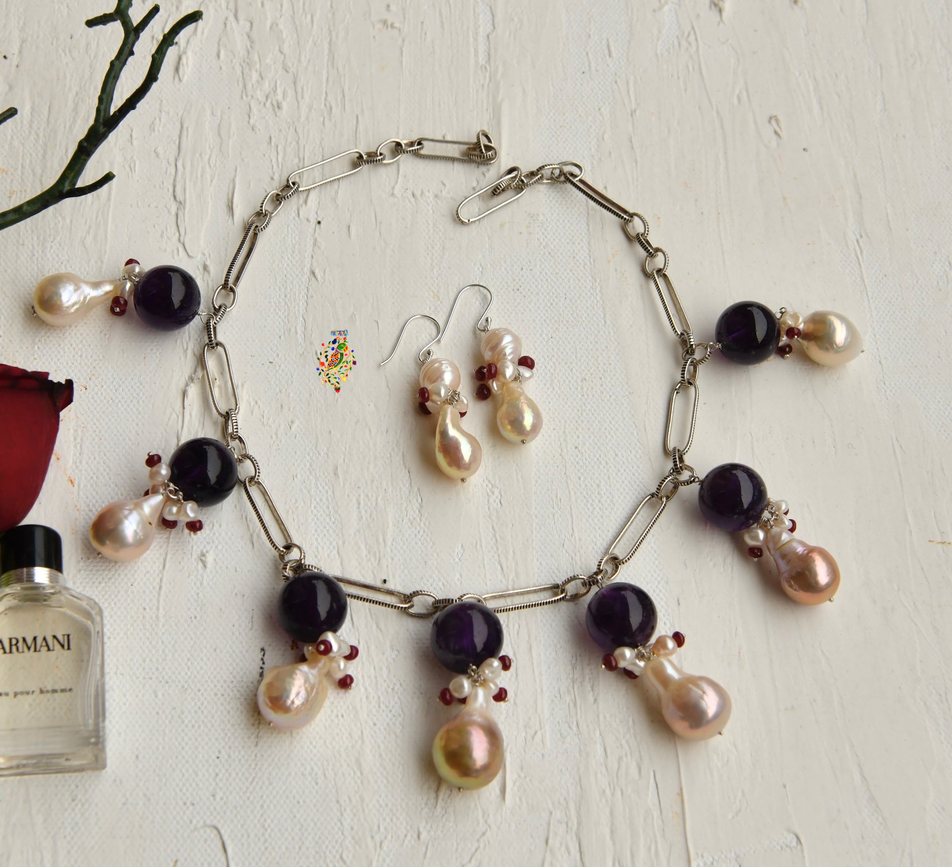 92.5 Silver chain; 16 mm amethyst stone beads; real baroque pearl drops 2.2 cm ; semi-precious ruby beads