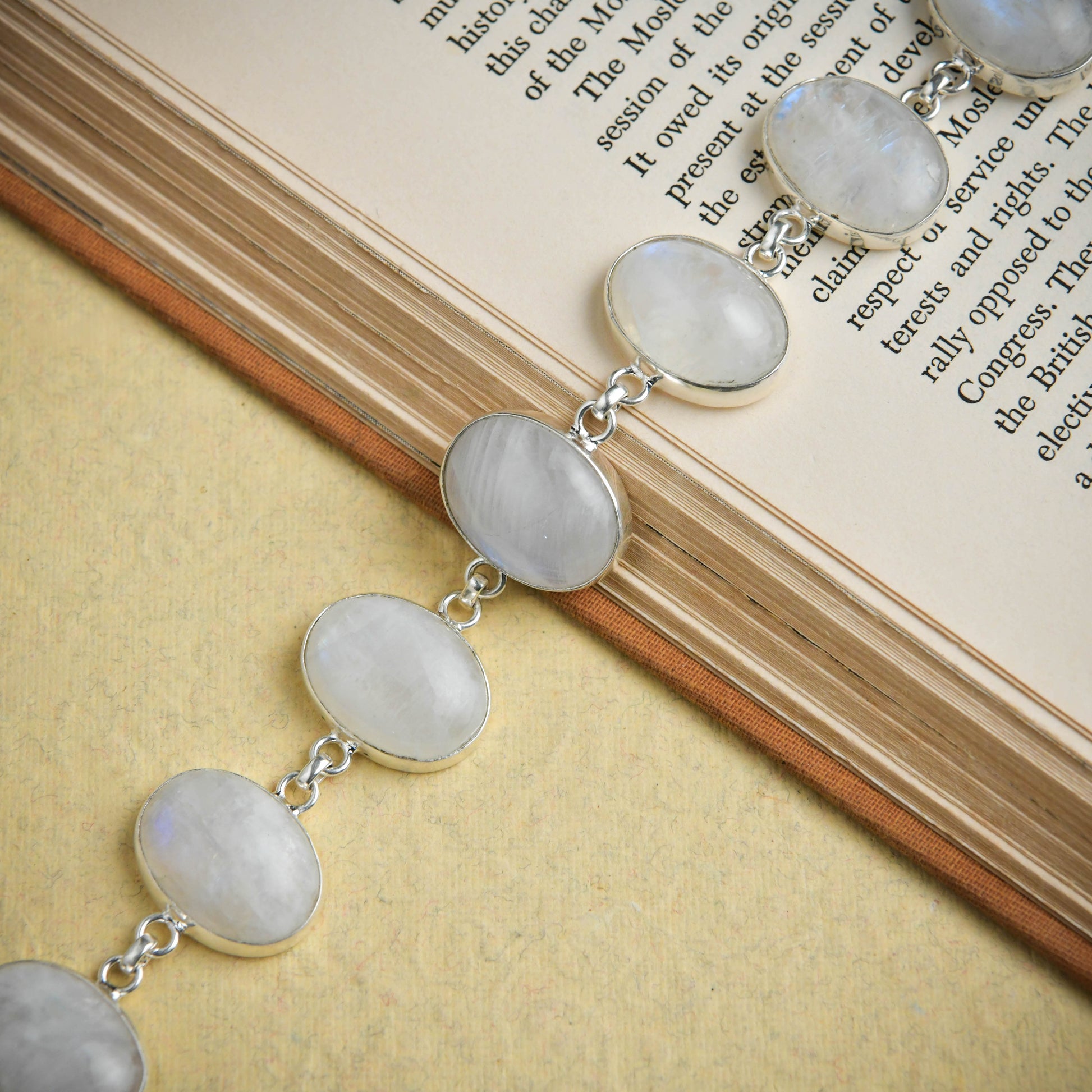 A refined silver bracelet set with luminous oval-cut rainbow moonstones, known for their soft iridescence and calming energy. Elegant and timeless, it adds a subtle glow to both everyday and occasion wear.