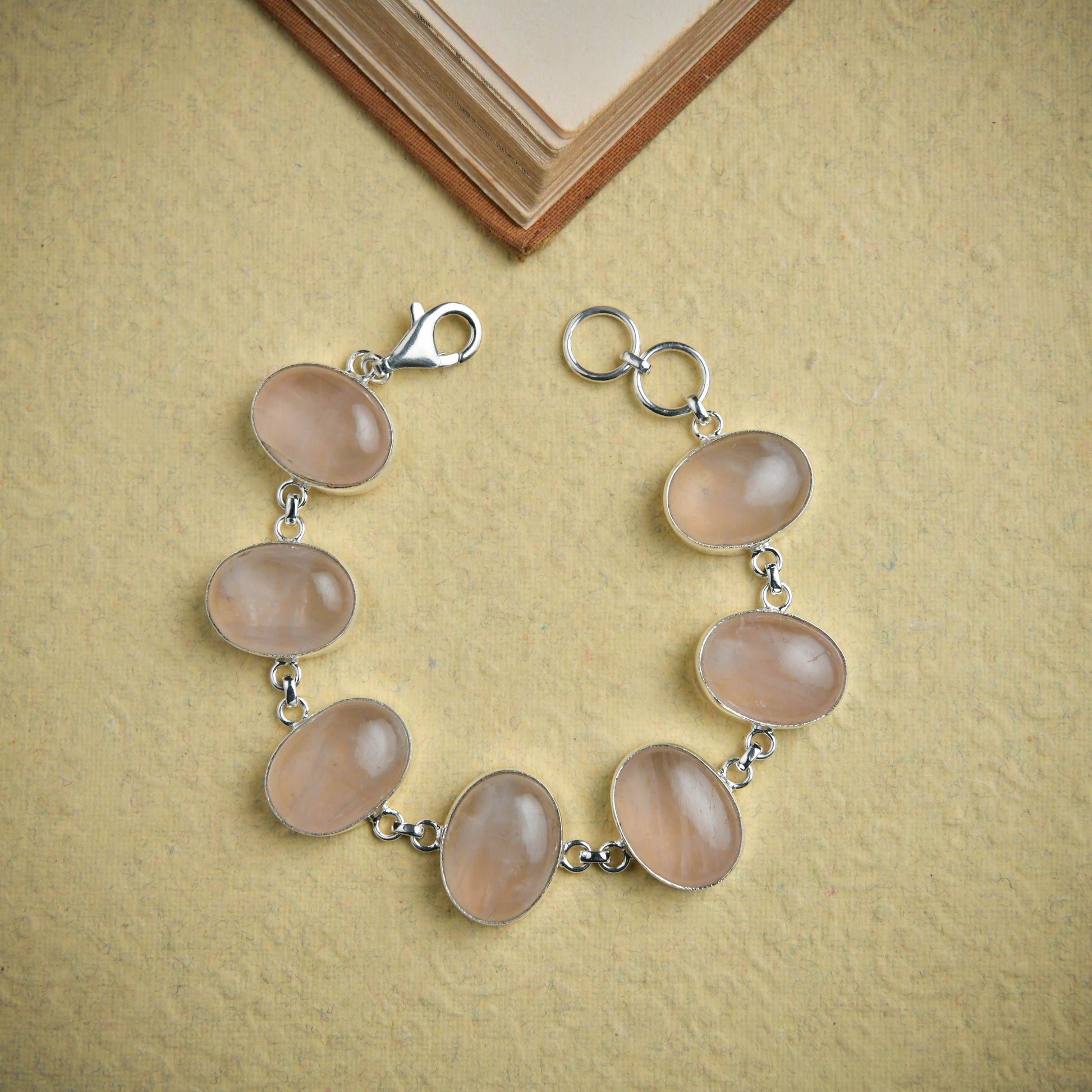 A graceful silver bracelet set with soft pink rose quartz ovals, known for their gentle glow and soothing energy. Elegant and timeless, it is designed to add a touch of warmth and quiet romance to everyday and occasion wear.