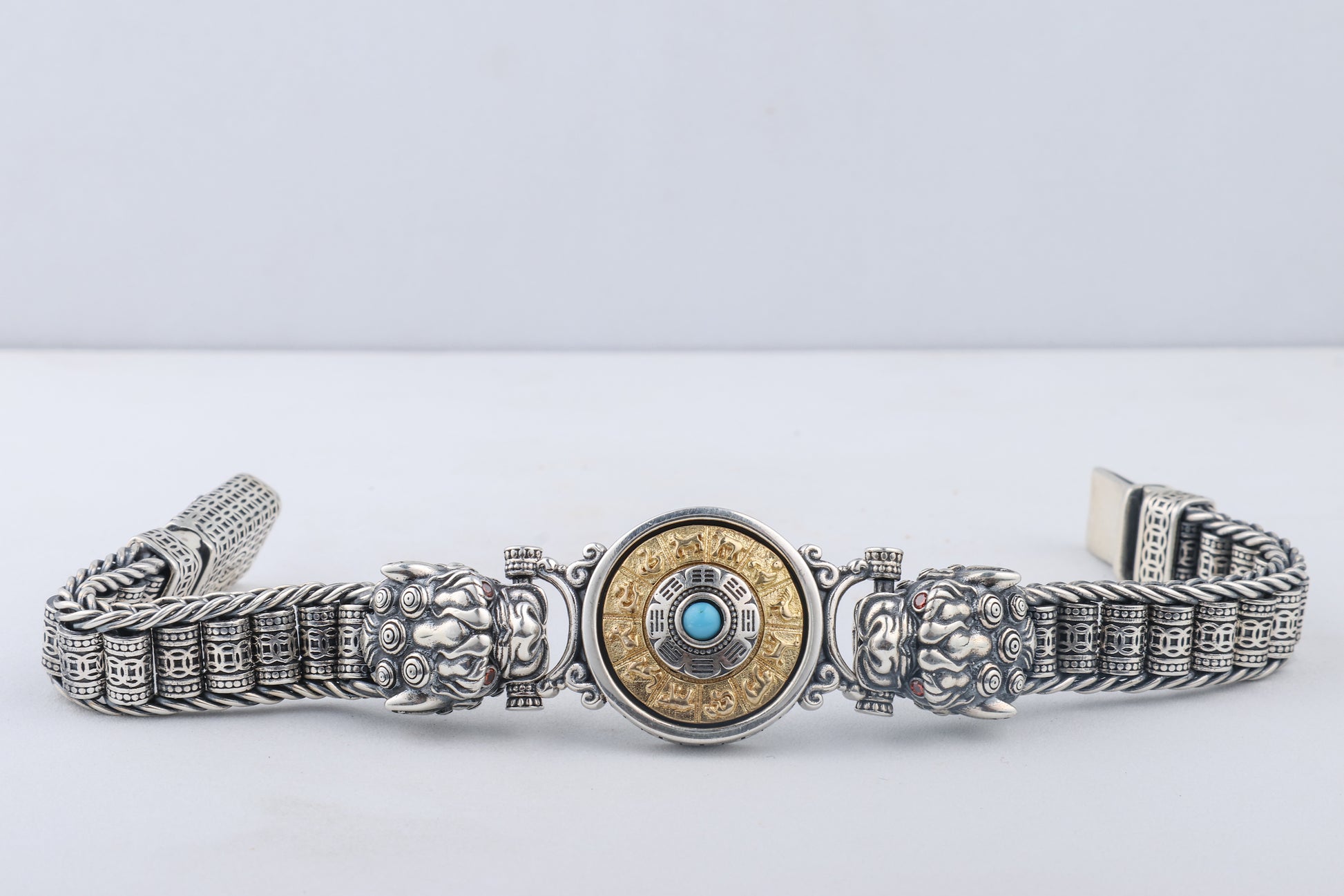 Meticulously handcrafted in substantial **92.5 Sterling Silver**, this bracelet features intricate details and a powerful presence. Central to its design are motifs inspired by **Tibetan Mantras**—sacred syllables known for their mystical sound and ability to bring beneficial energy, focus the mind, and offer blessings. This is a truly unique, one-of-a-kind piece, embodying both bold style and deep spiritual resonance.