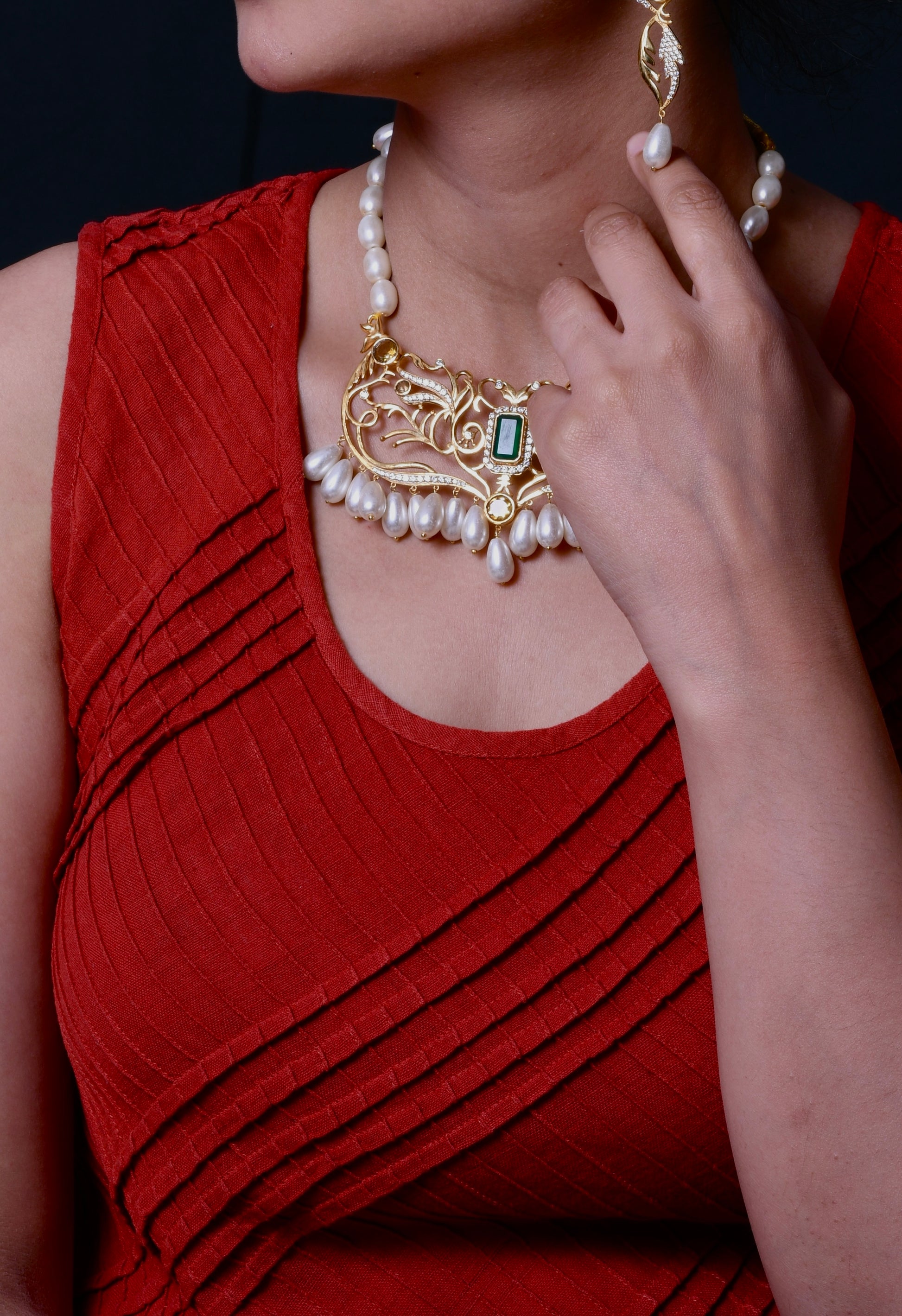 22 kt gold plated brass; zircon stones; semi-precious stones; pearls