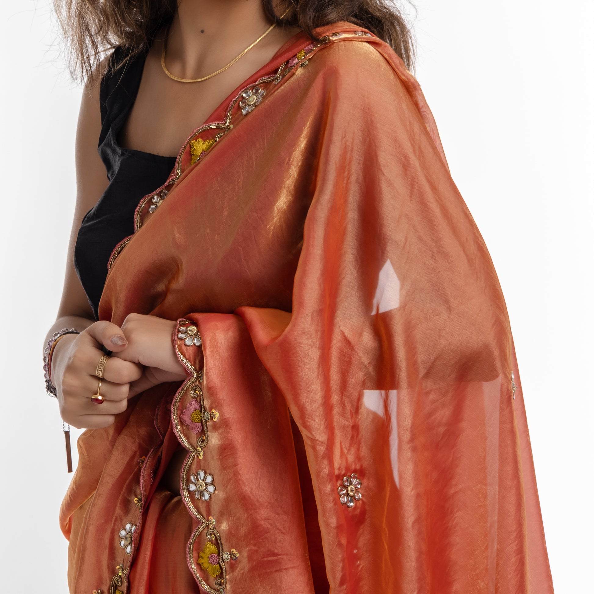 Shiny Pure Fendi Silk, Orange Colour, Handwork Sequinned Lace