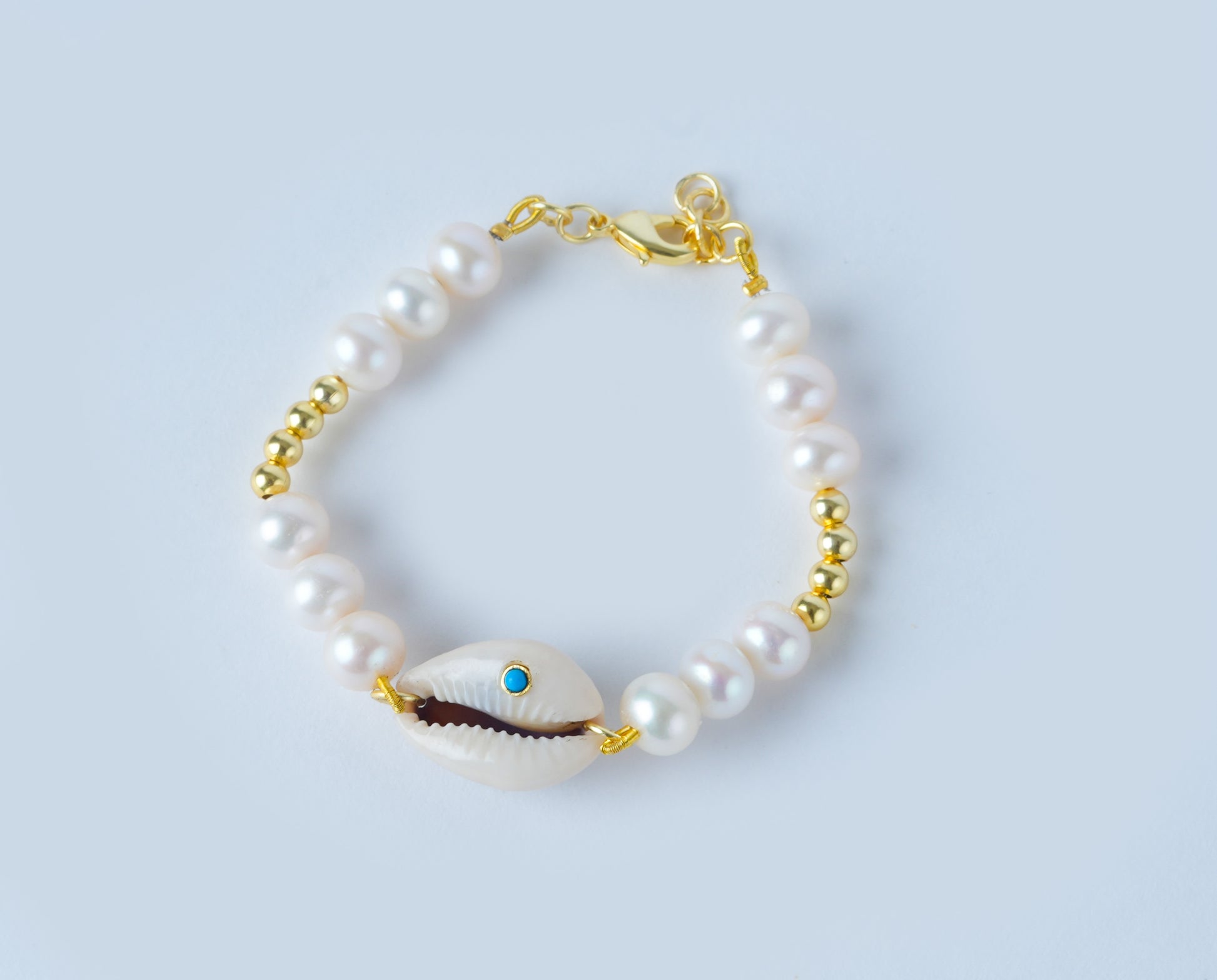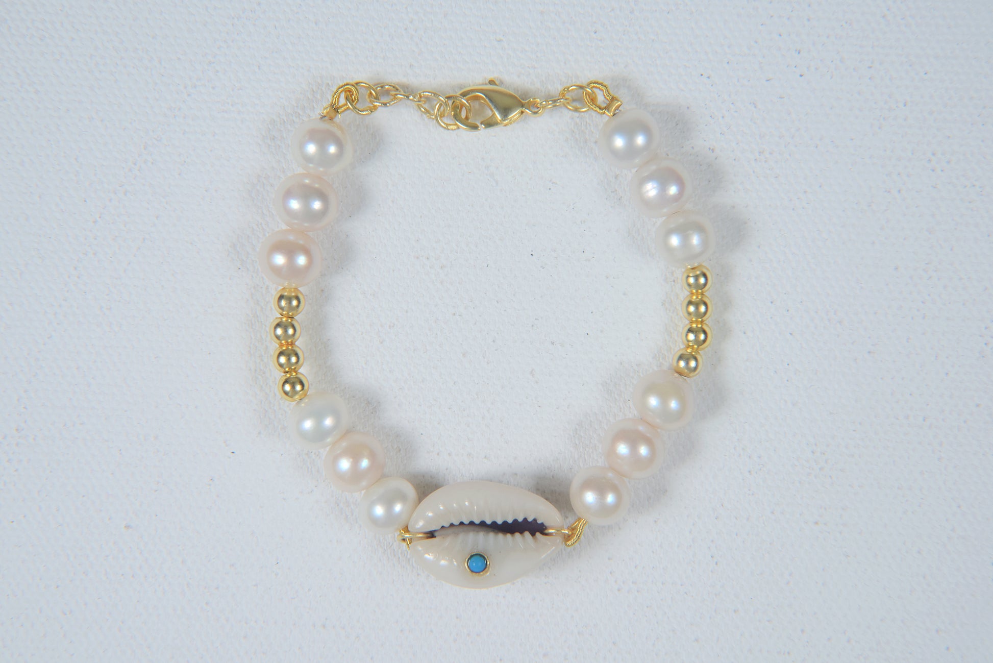 14 kt gold-plated brass; natural sea-shell; freshwater pearls; turquoise stone