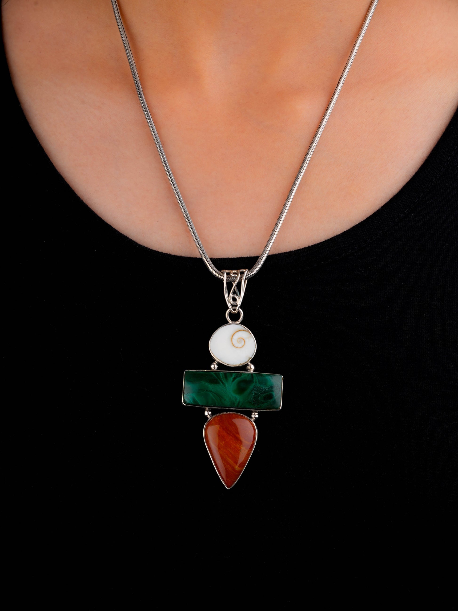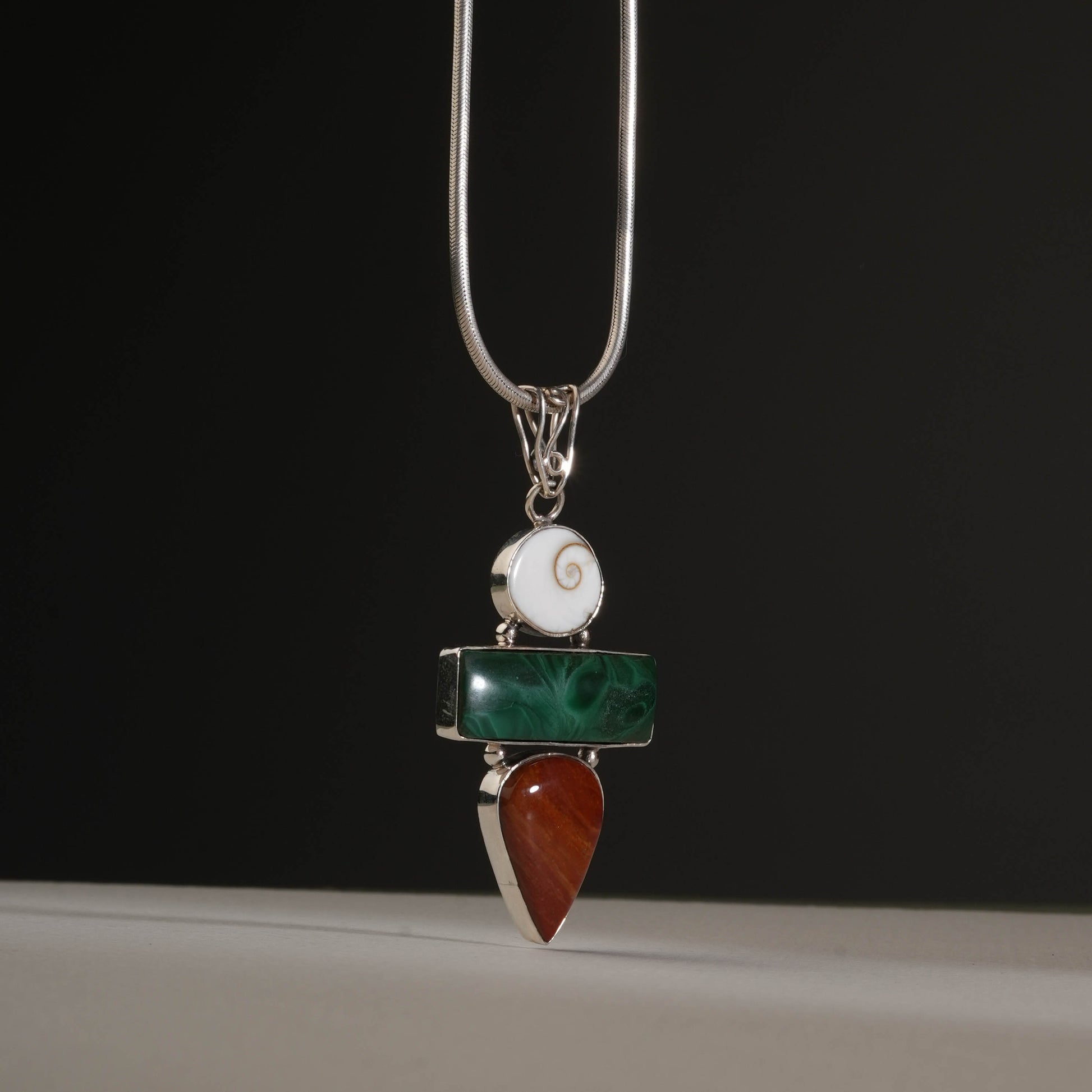 Shiva Eye Malachite and Red Jasper Silver Pendant