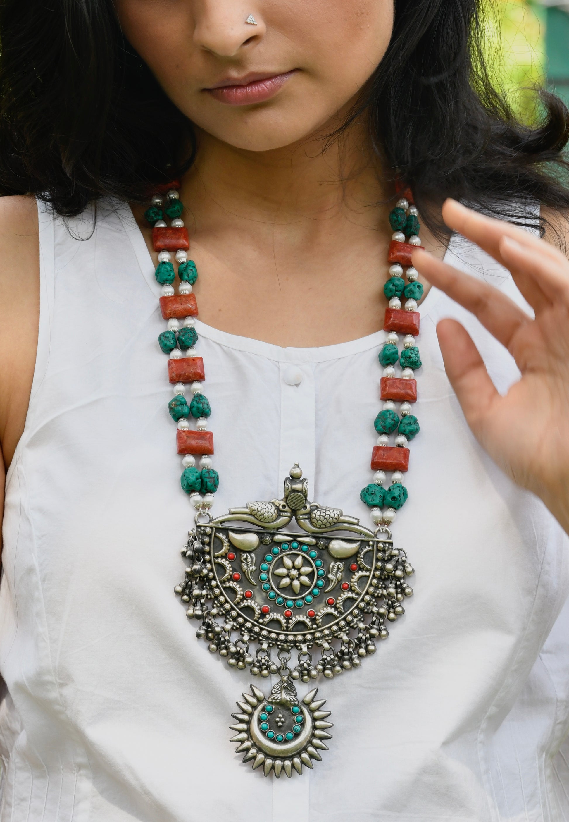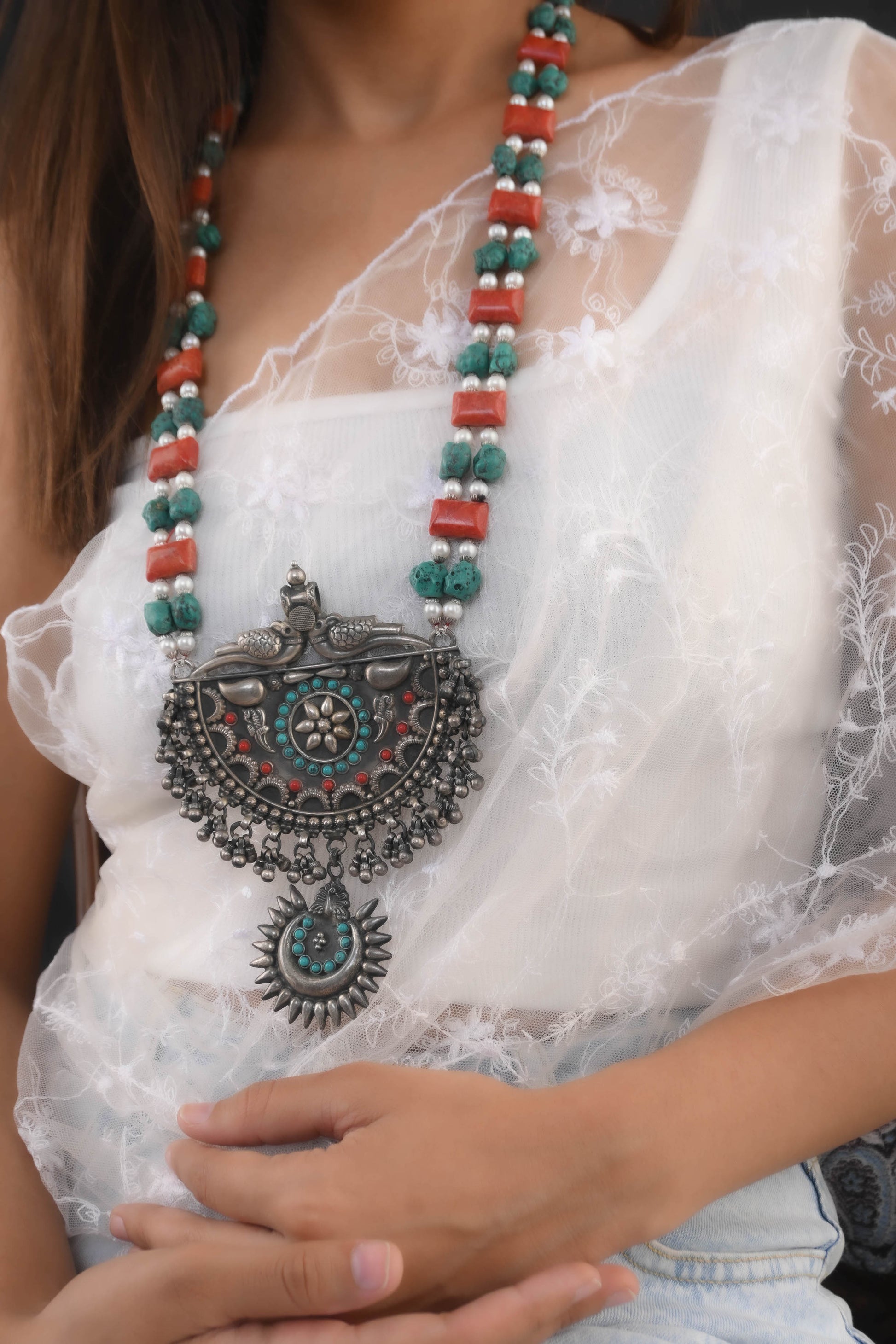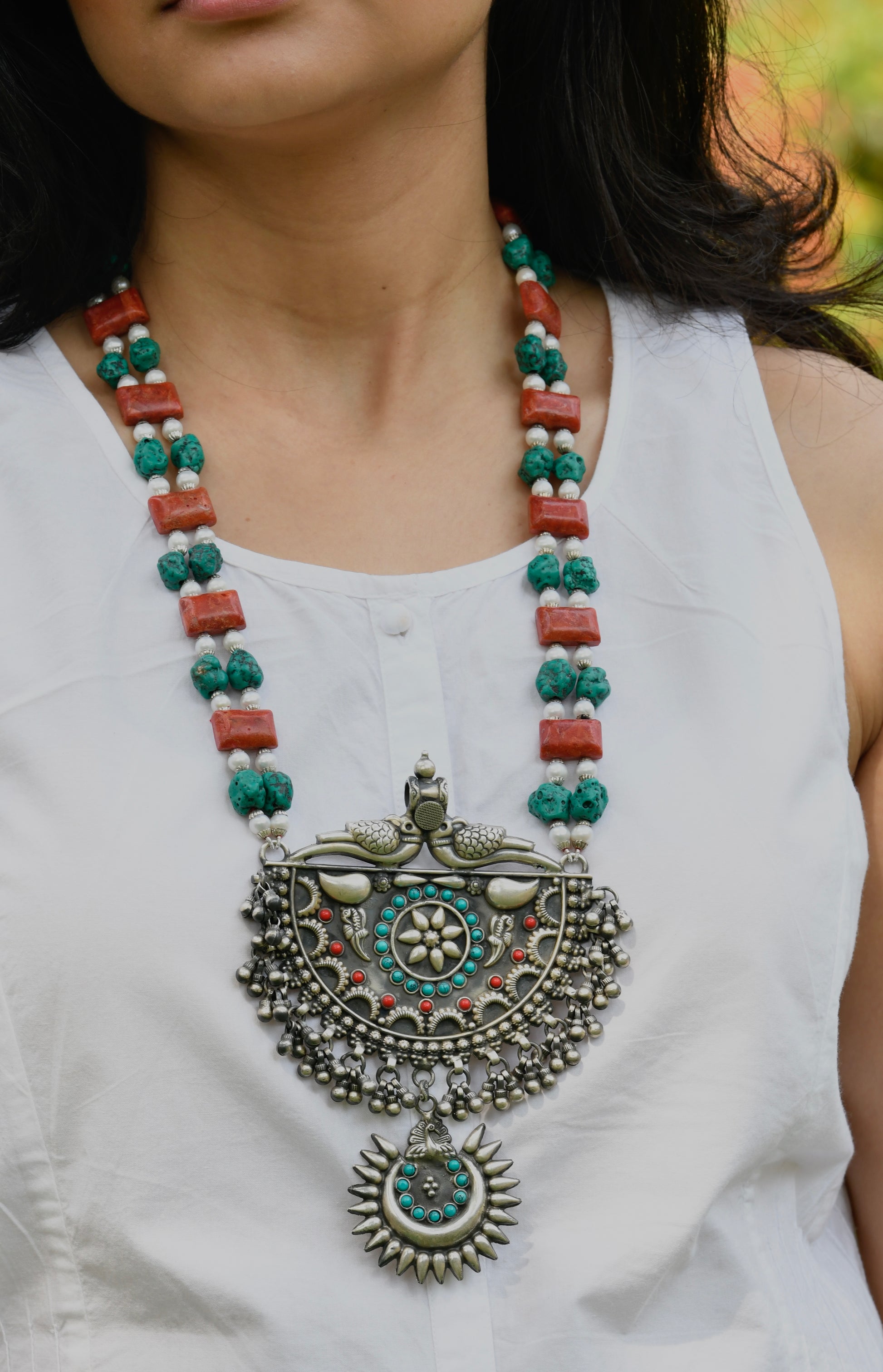 925 Silver, Corals Turquoise Beads, Fresh Water Pearls, cotton thread