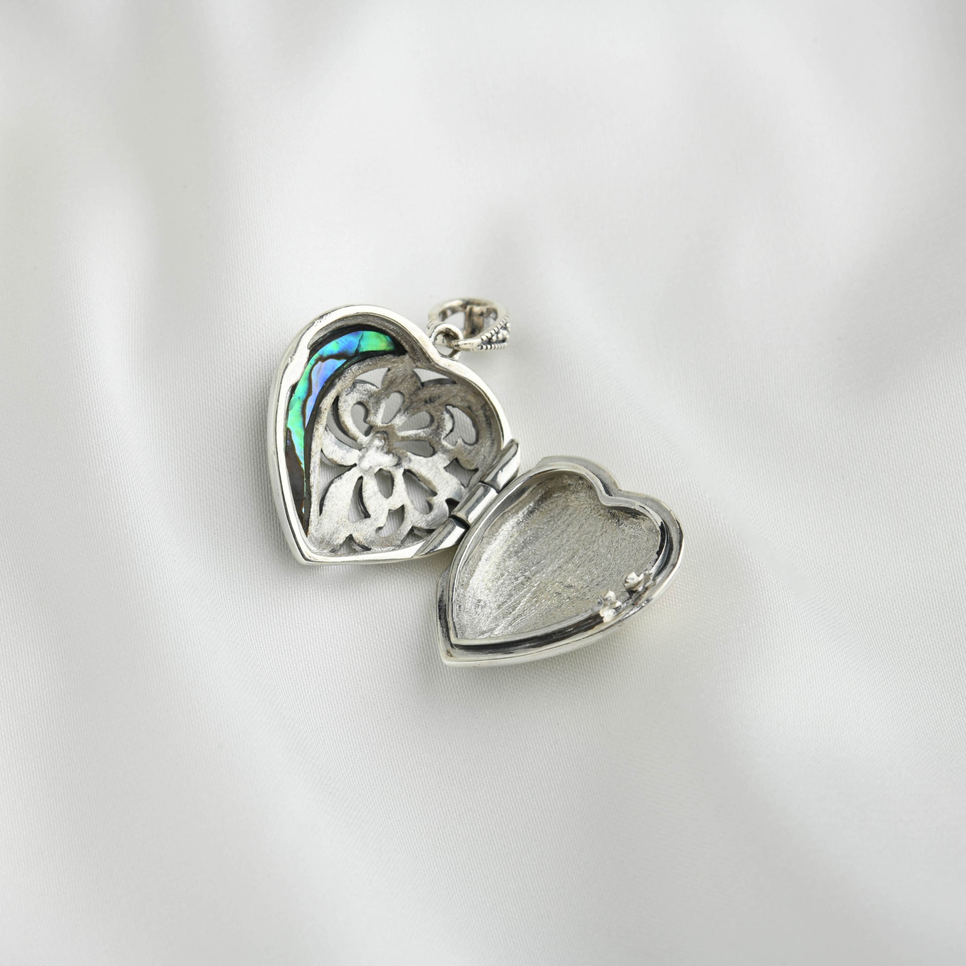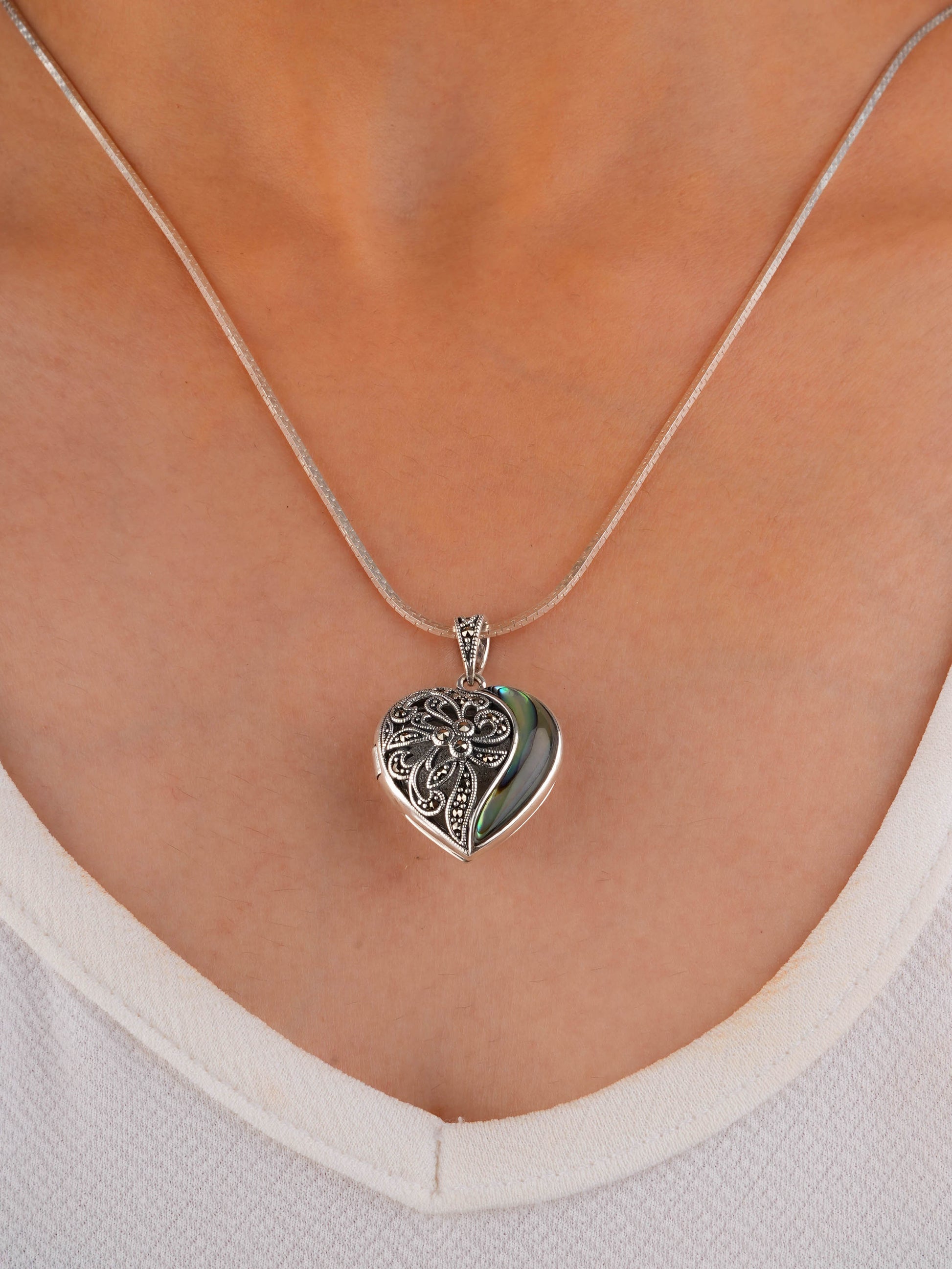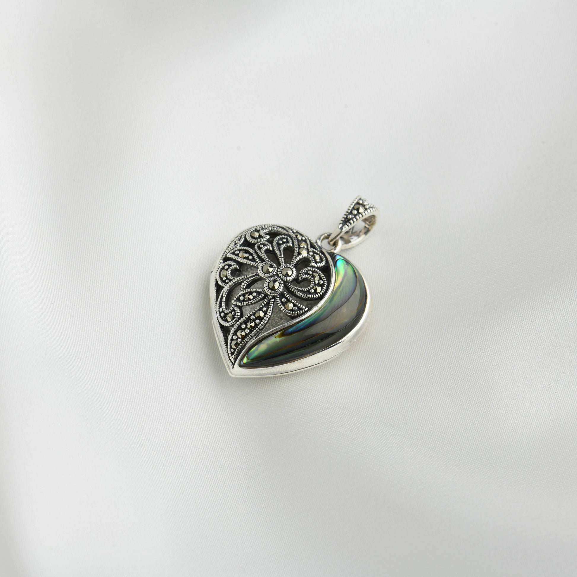 Wear the Silver Marcasite Abalone Inlay Heart Pendant as a symbol of your cherished connections and personal style, letting its beauty shine with every heartbeat. Elevate your jewelry collection with this exquisite piece that tells a story of love and artistry!