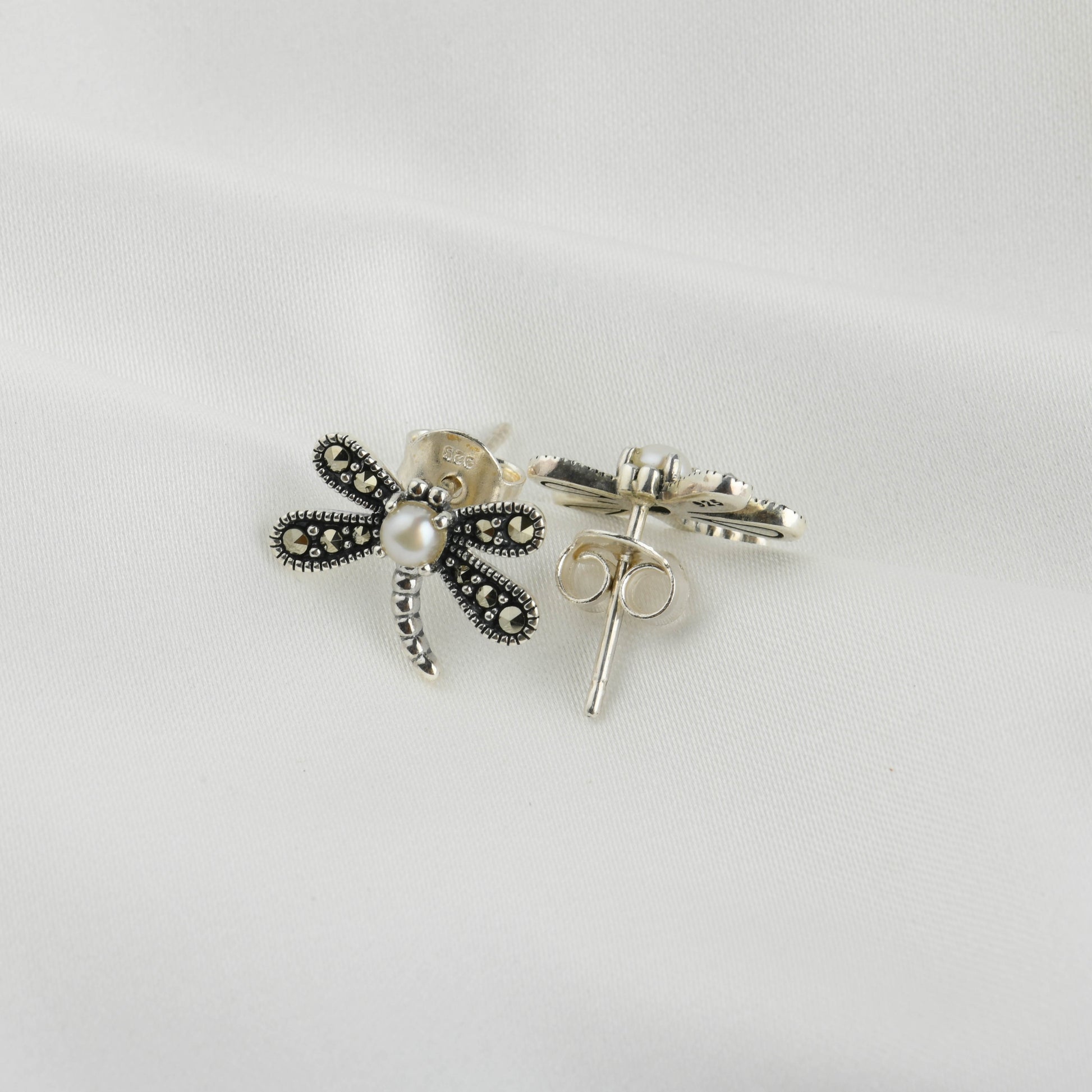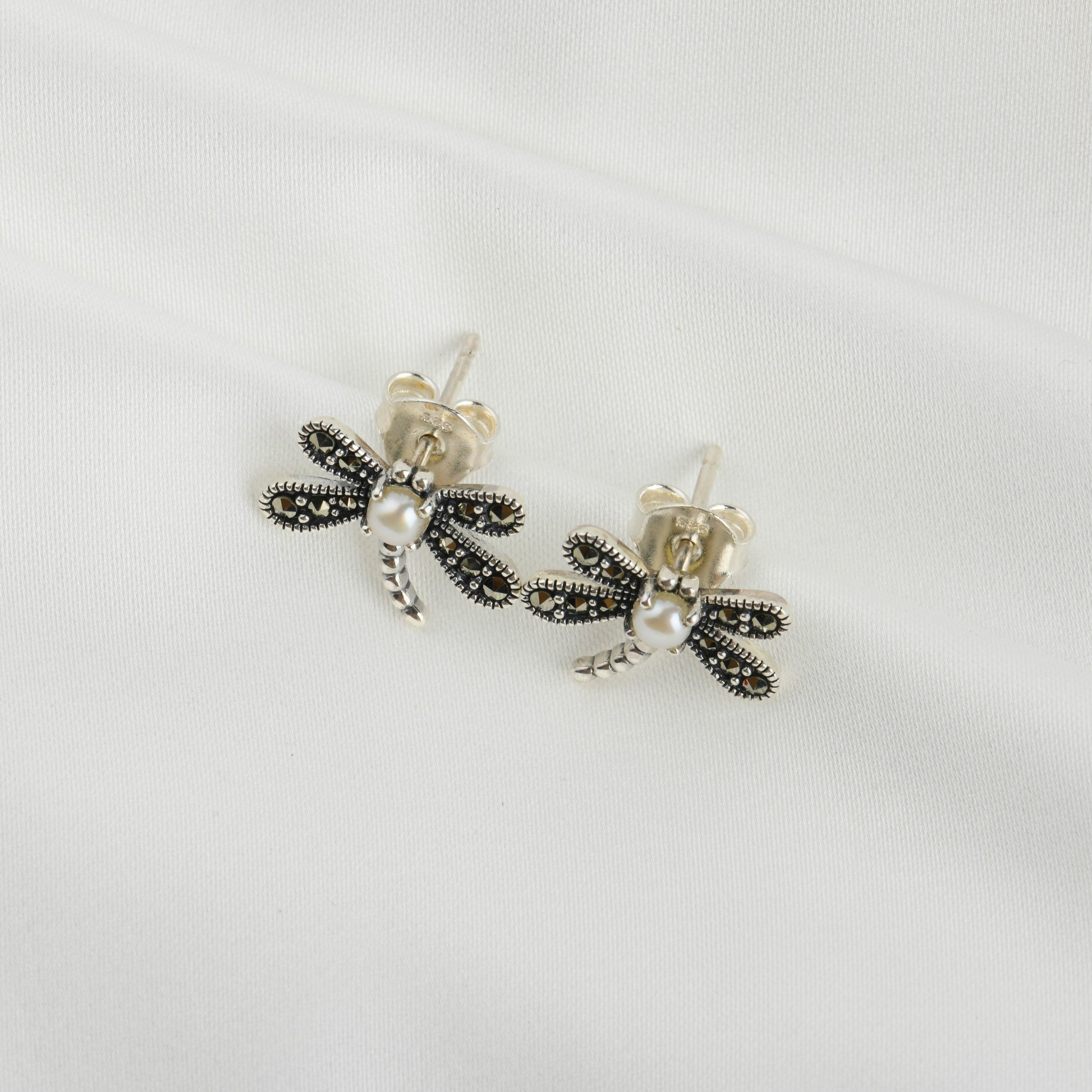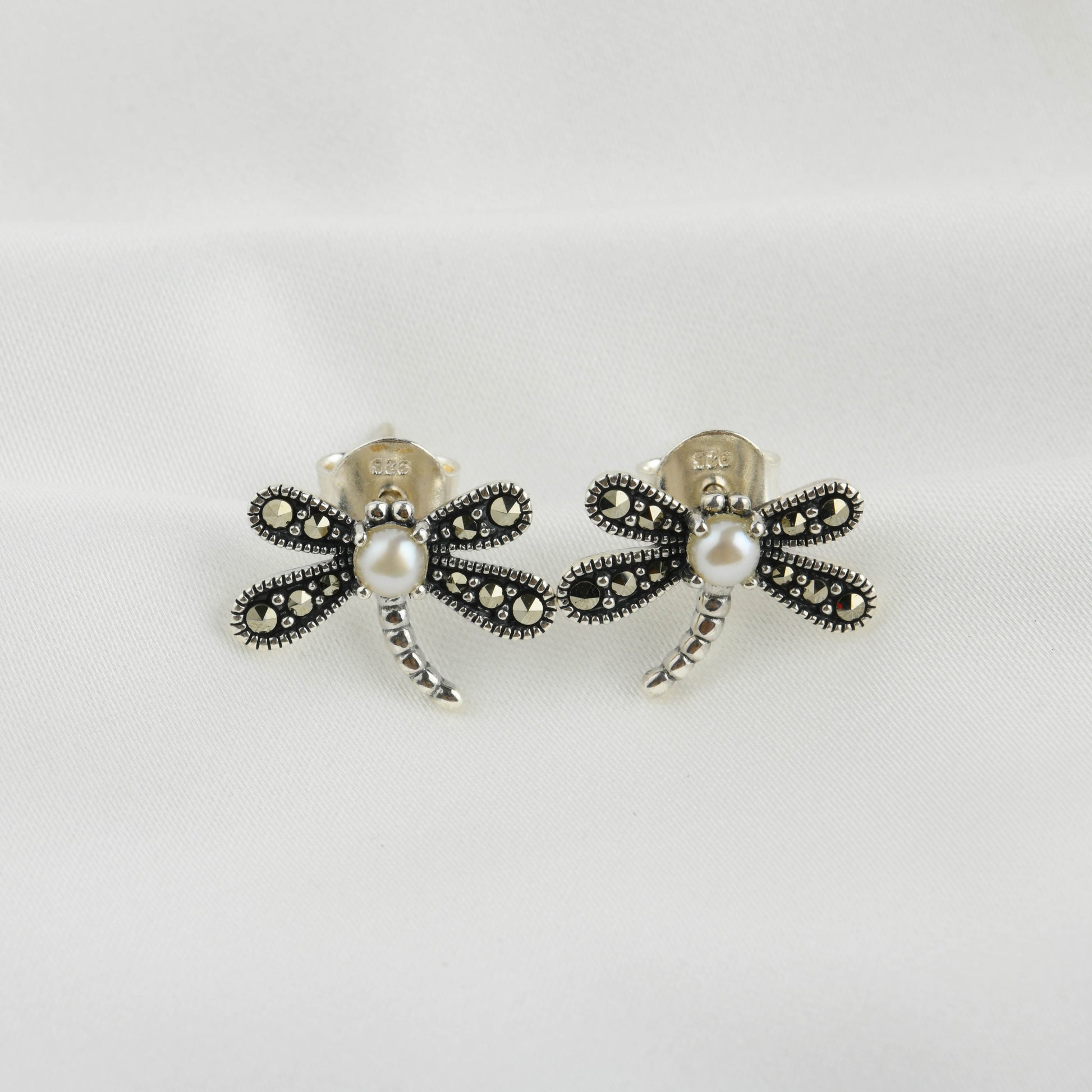 Embrace the enchanting beauty of nature with these unique dragonfly stud earrings. Crafted in sterling silver, the delicate wings are adorned with intricate marcasite detailing, while a captivating pyrite bead forms the dragonfly's body, adding a touch of earthy metallic shimmer. At the very heart of this delicate creature lies a luminous pearl, adding a touch of refined elegance to this harmonious blend of vintage-inspired style and natural allure.