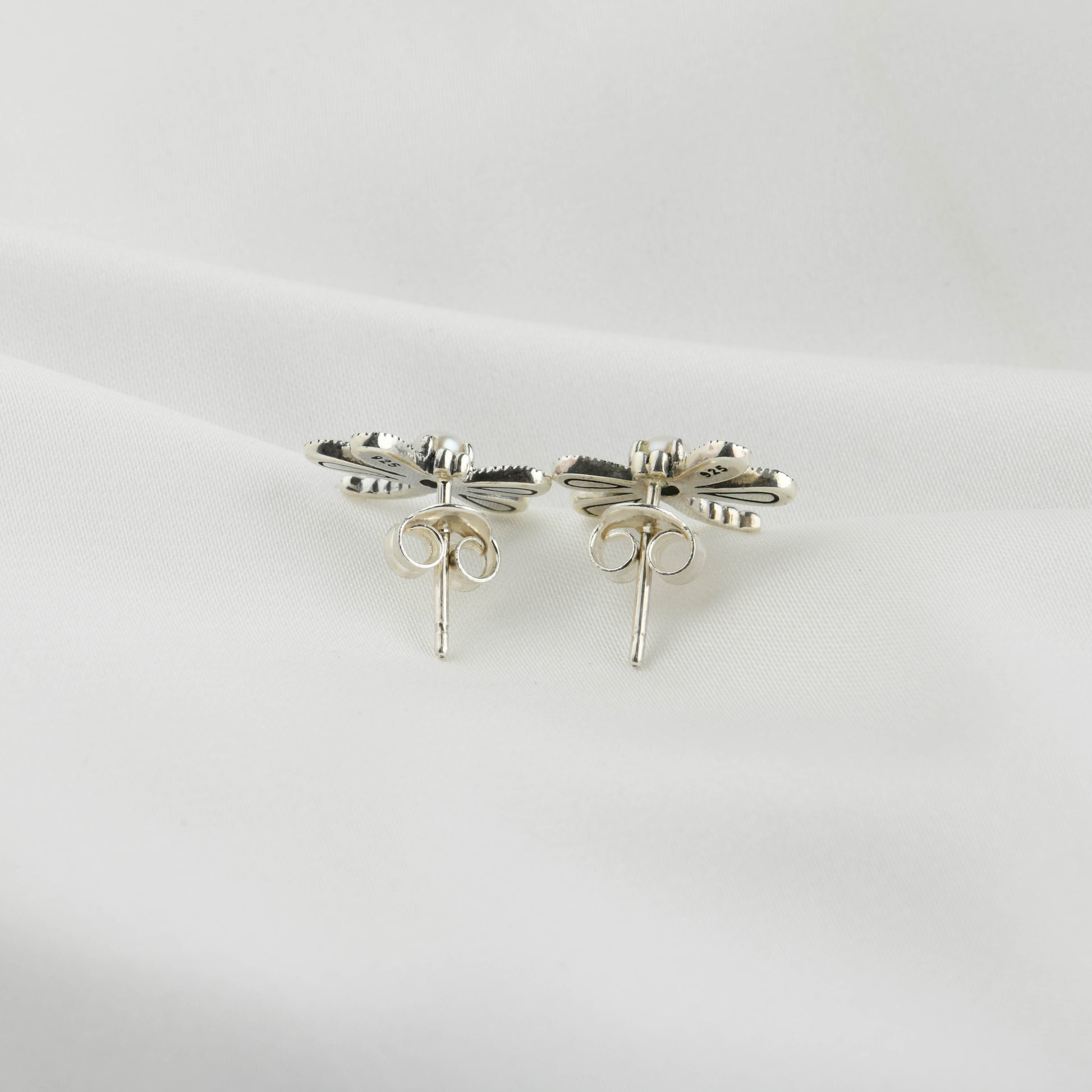 Silver Pyrite Dragonfly Studs: Nature's Sparkle Takes Flight with a Pearly Heart.