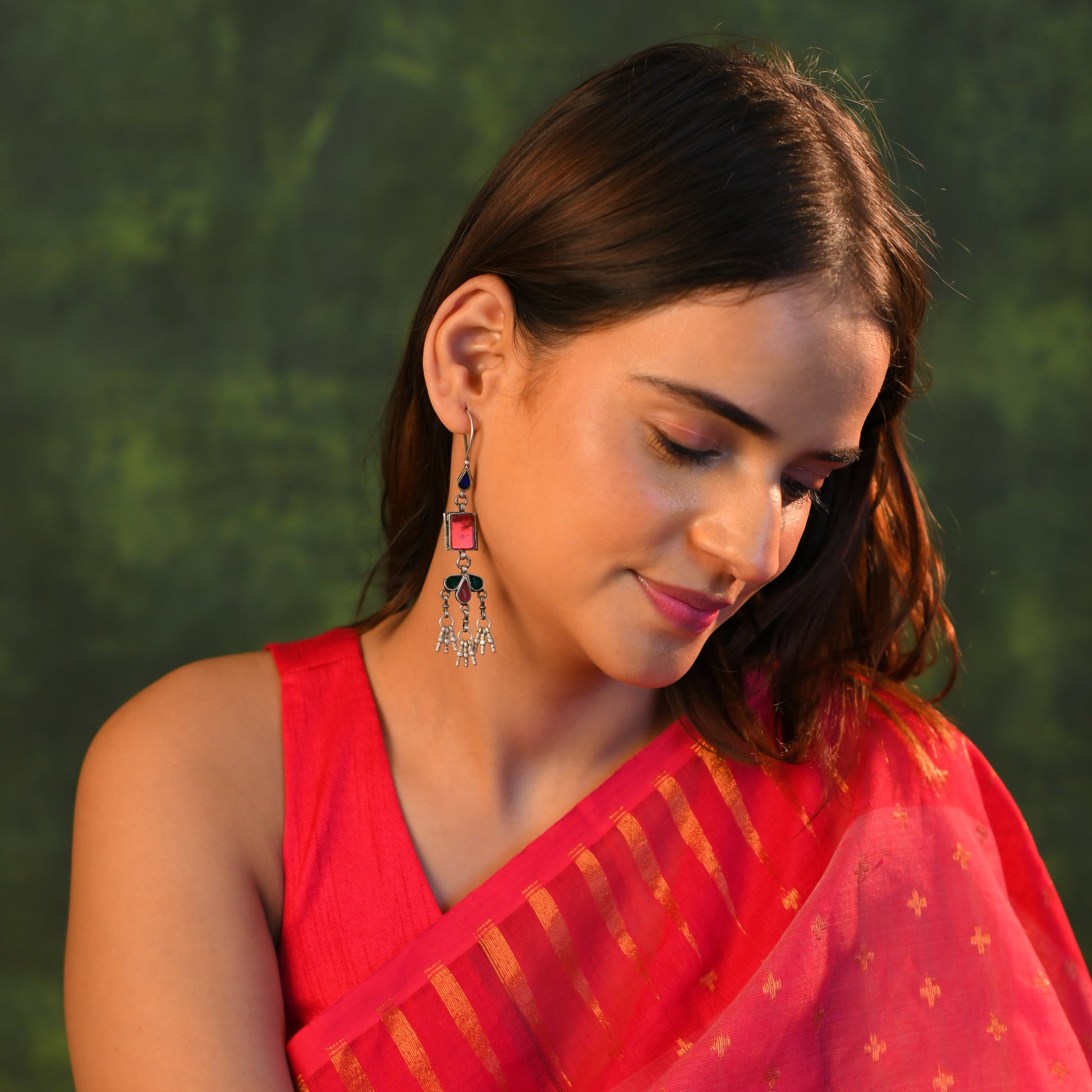 Each earring begins with a polished rectangle of deep, **ruby-red glass** that glows with an inner light. Below, an intricately crafted element of oxidized **92.5 Sterling Silver** unfolds into a delicate trefoil motif accented with **green and red stones**. A fringe of silver dangles creates beautiful, fluid motion. At an impressive 9 cm, their length adds a touch of regal drama, making them the perfect statement piece for any celebration.