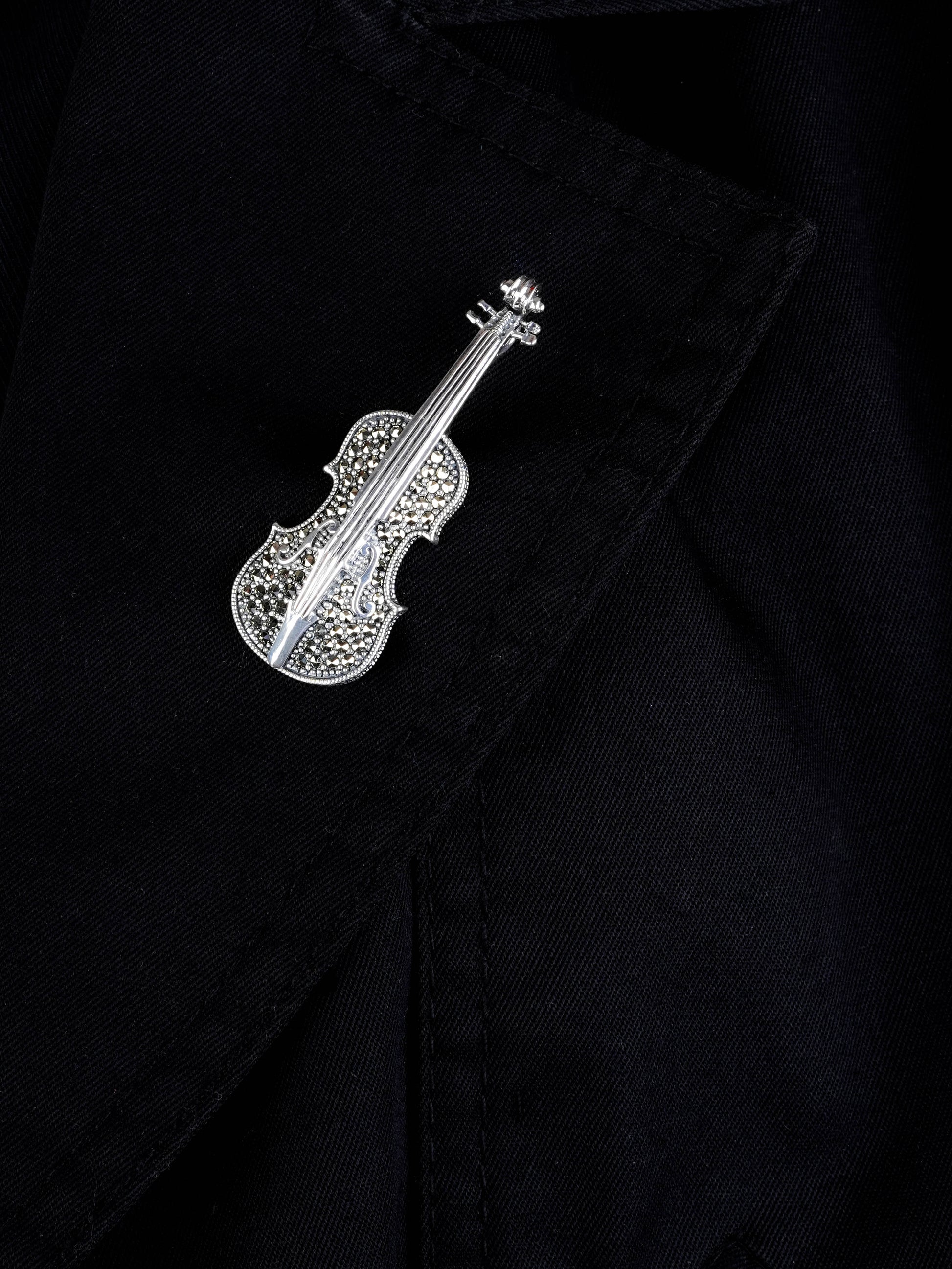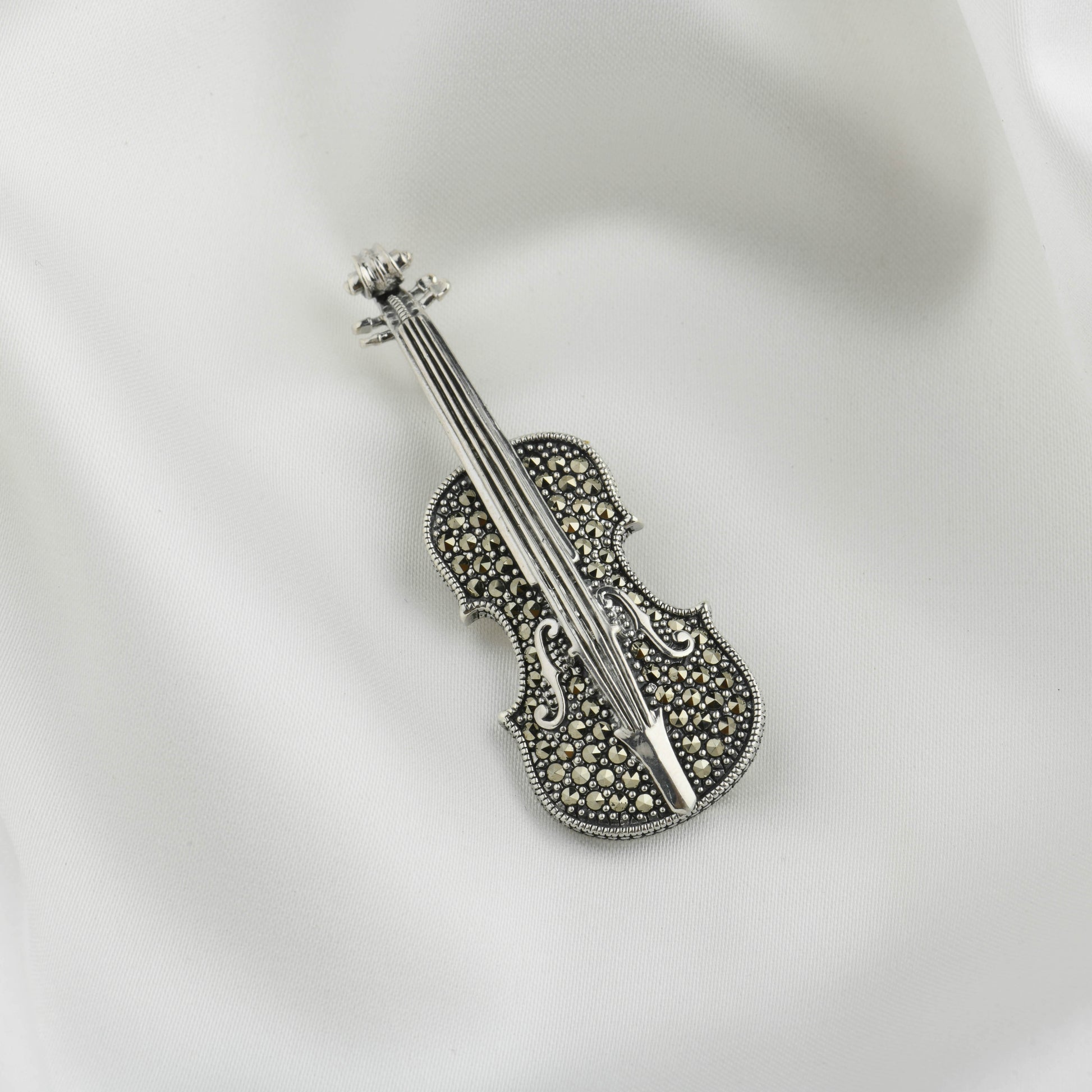 Celebrate your passion for music with this exquisitely crafted sterling silver violin brooch. Every curve and detail of this beloved instrument is brought to life with the subtle sparkle of meticulously set marcasite stones. This brooch adds a touch of sophisticated charm and artistic flair to any outfit. Whether you're a musician, a music lover, or simply appreciate unique design, this timeless piece is a perfect way to express your inner melody. Pin it to a lapel, scarf, or bag for a touch of harmonious style.