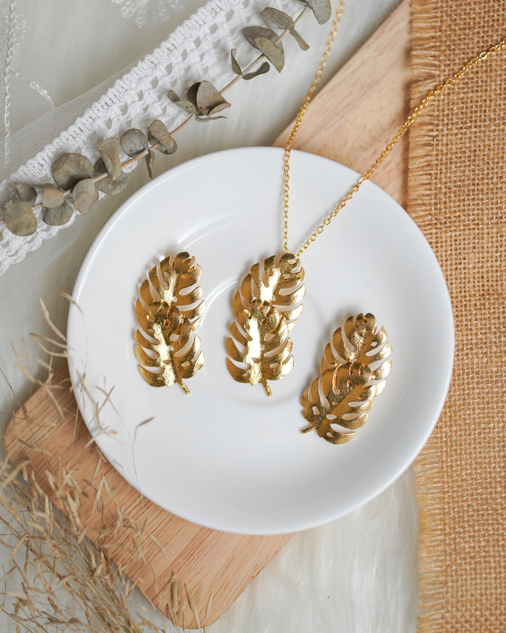 Feel the warmth of the sun with this gorgeous gold plated Sun-kissed Foliage Set. Perfect for glamorous evenings and special occasions, it will add a touch of golden glamour to any look! With its intricate design and shimmering sheen, you’ll want to show it off all day long.