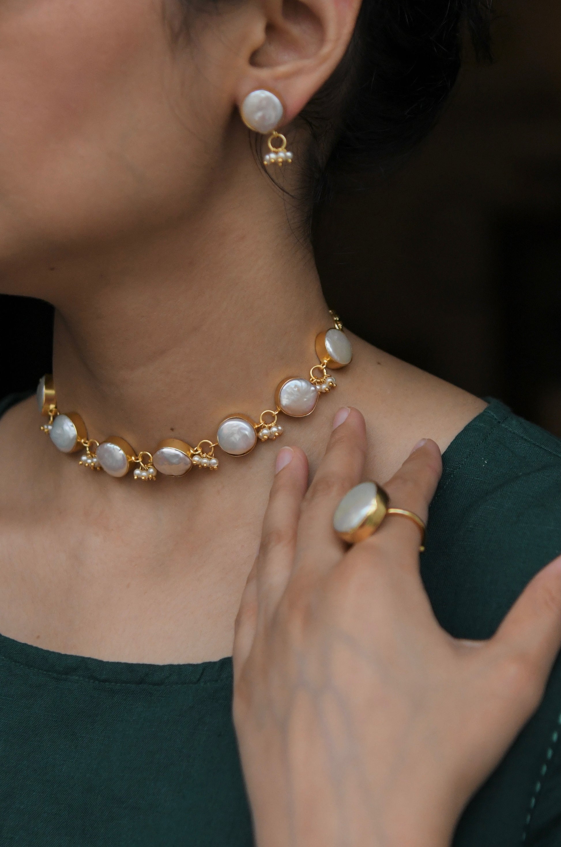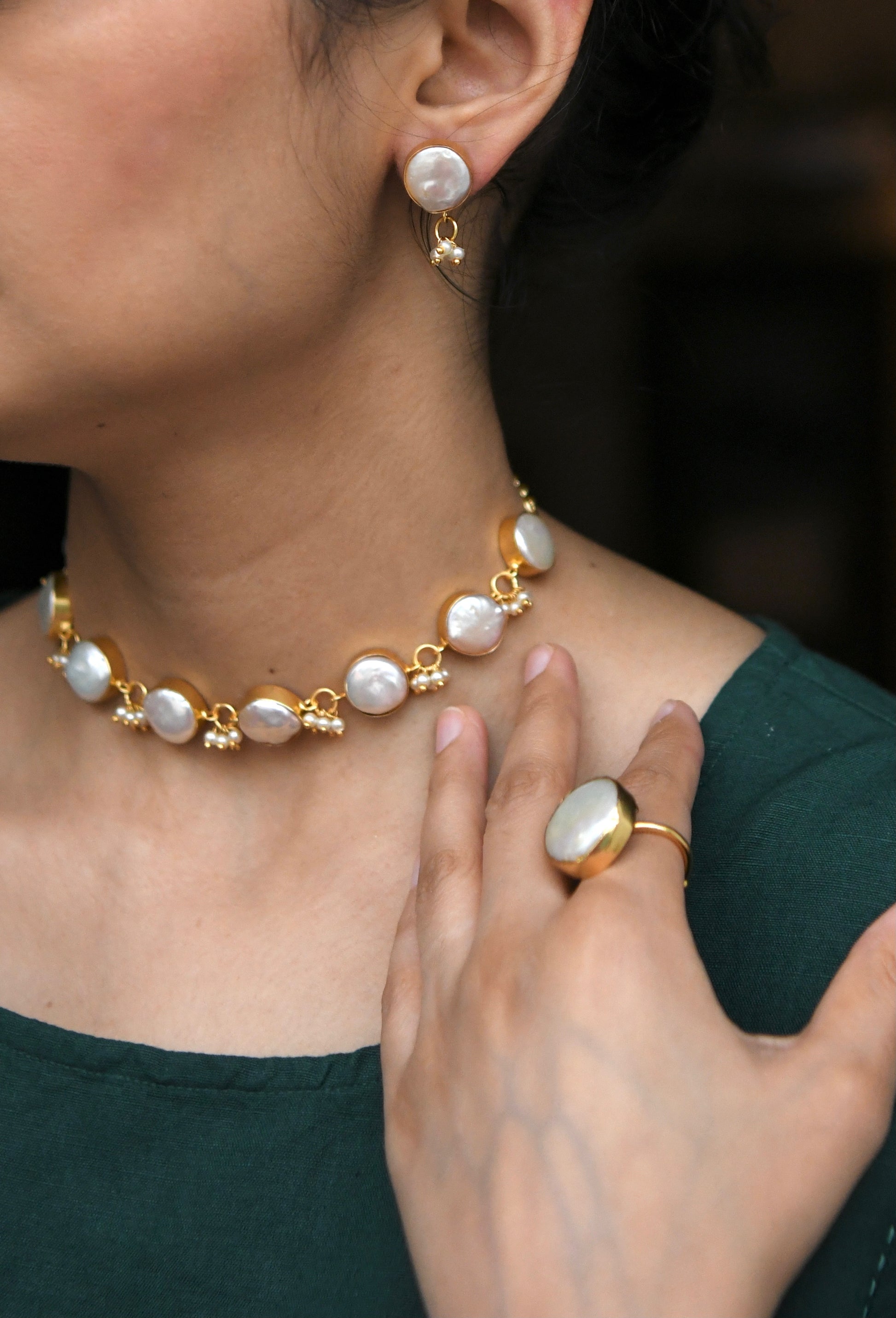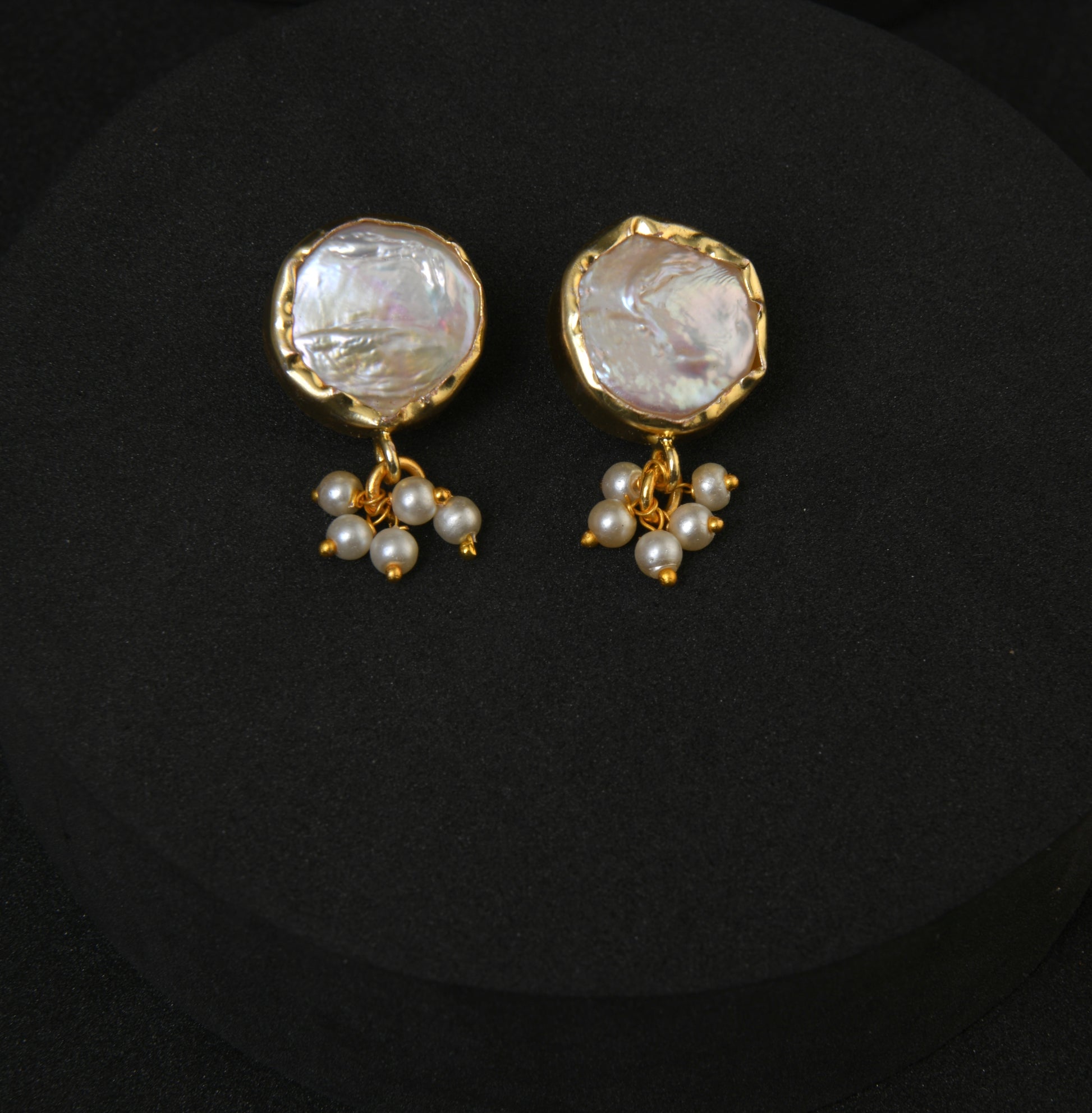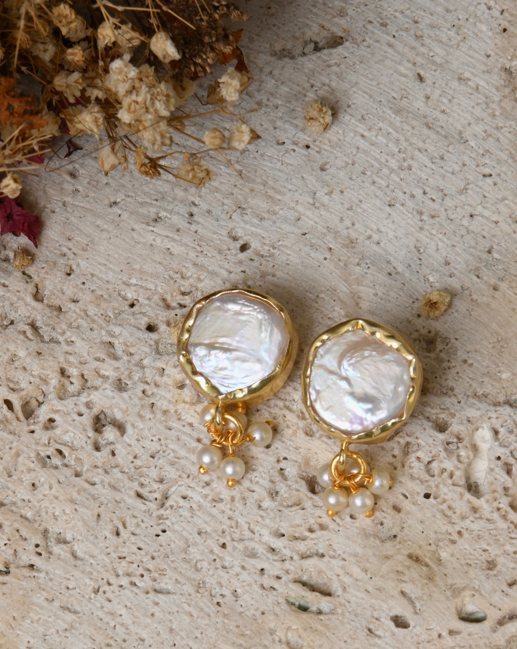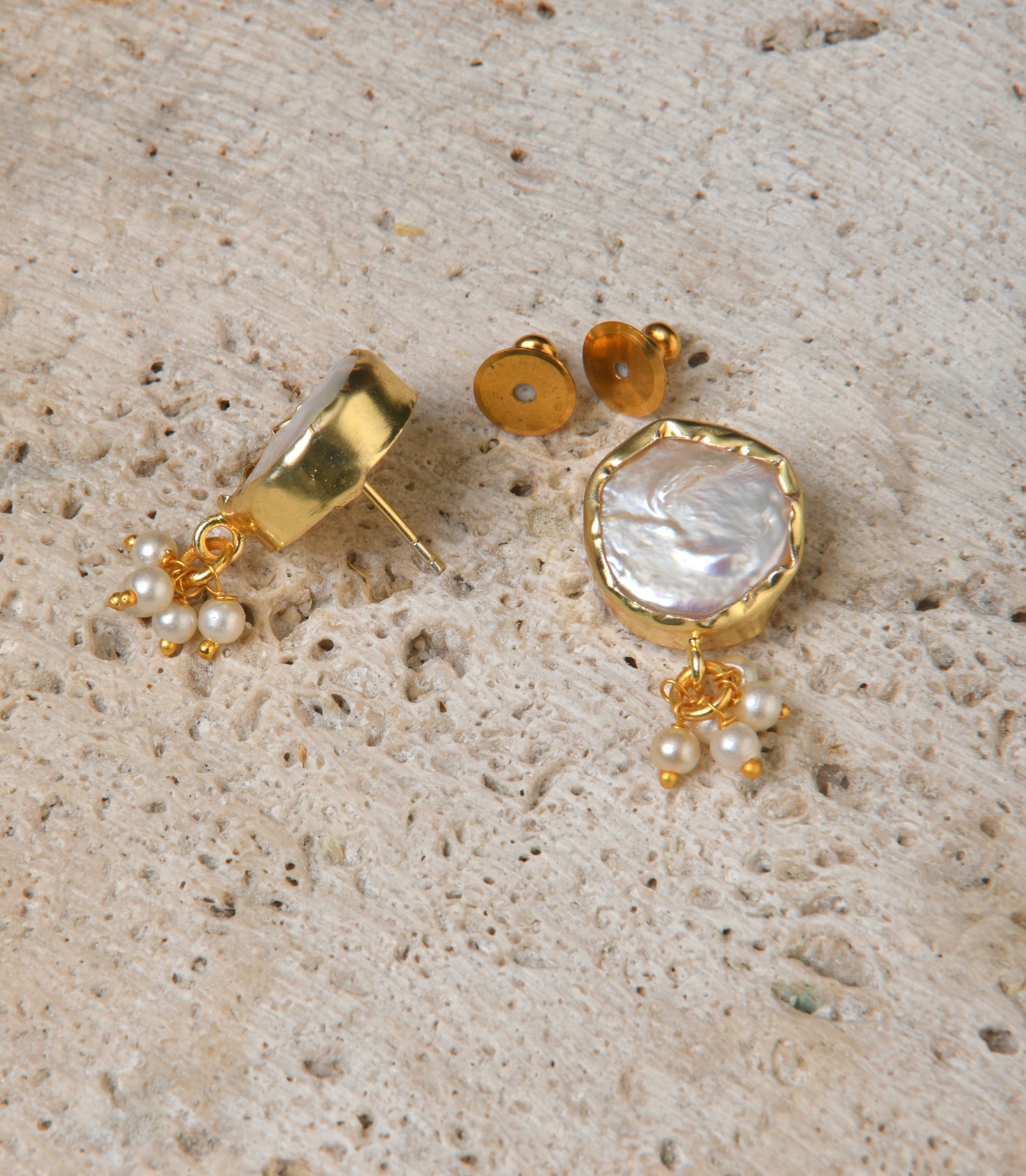 Natural freshwater coin pearls; Gold-plated brass. No two pearls are exactly the same, being natural in nature.